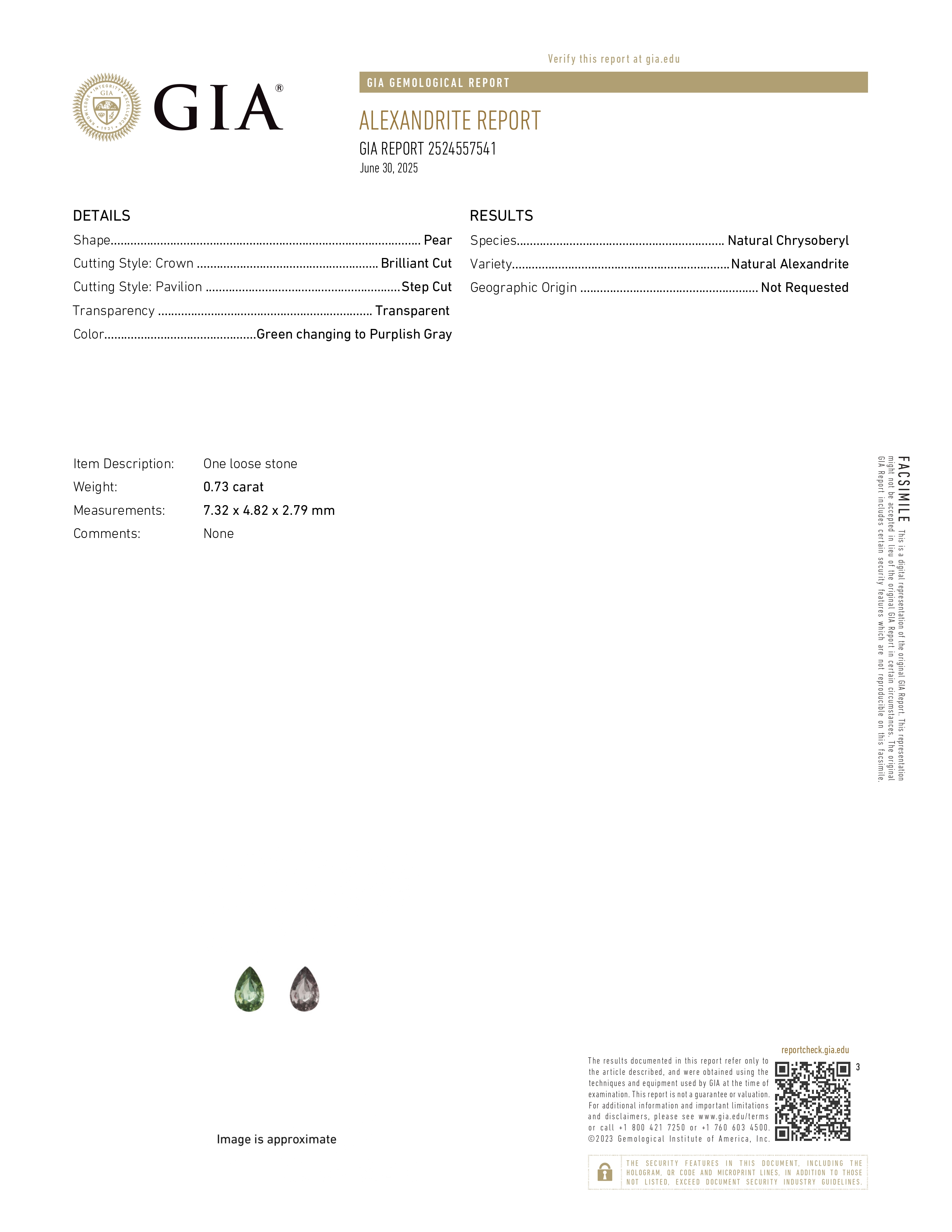 Aleksandryt naturalny szlif gruszka 0.73 ct.