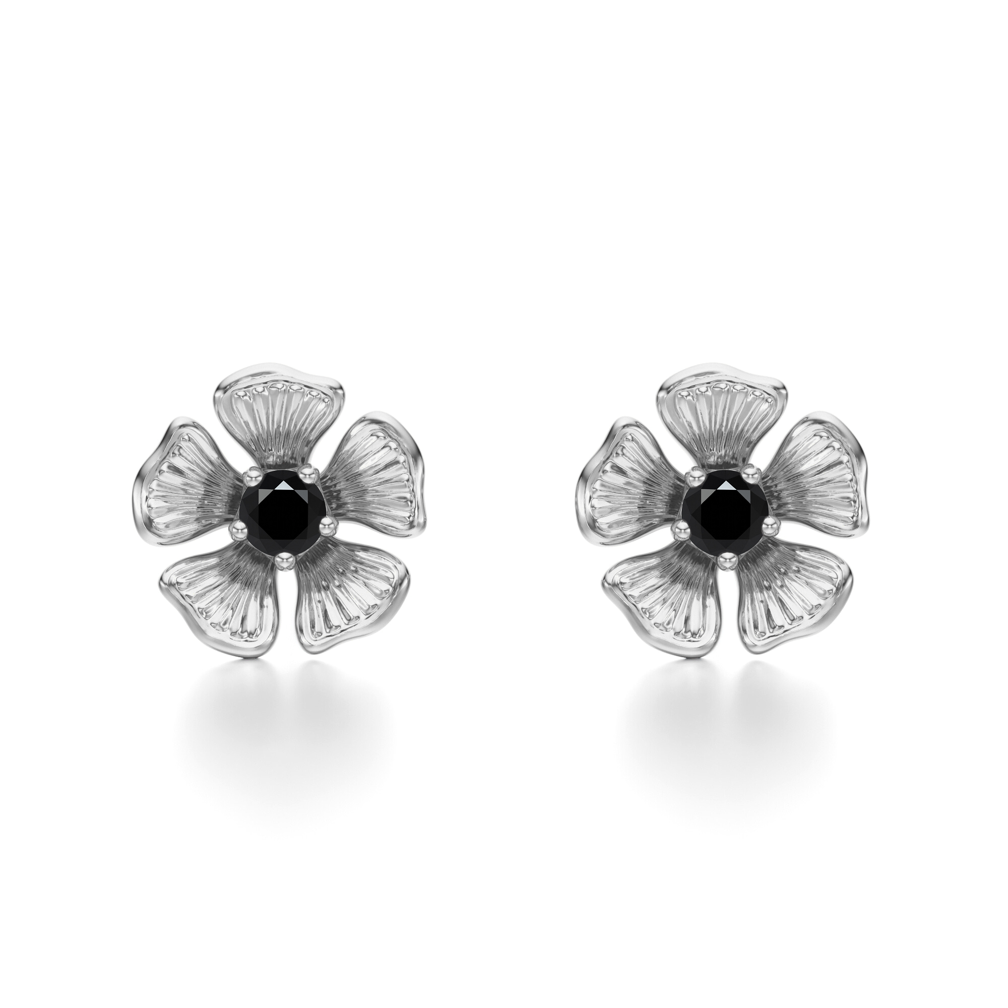 Centralnym punktem kolczyków jest naturalny czarny diament o szlifie brylantowym, który emanuje tajemniczym blaskiem i przyciąga wzrok niebanalnym charakterem. Otoczony płatkami z białego złota, diament staje się sercem kwiatowej kompozycji, nadając całości niezwykle kobiecego i zarazem wyrazistego wyglądu. Każdy detal został dopracowany z najwyższą precyzją, dzięki czemu biżuteria zyskuje lekkość i elegancję, a jednocześnie pozostaje trwała i solidna.