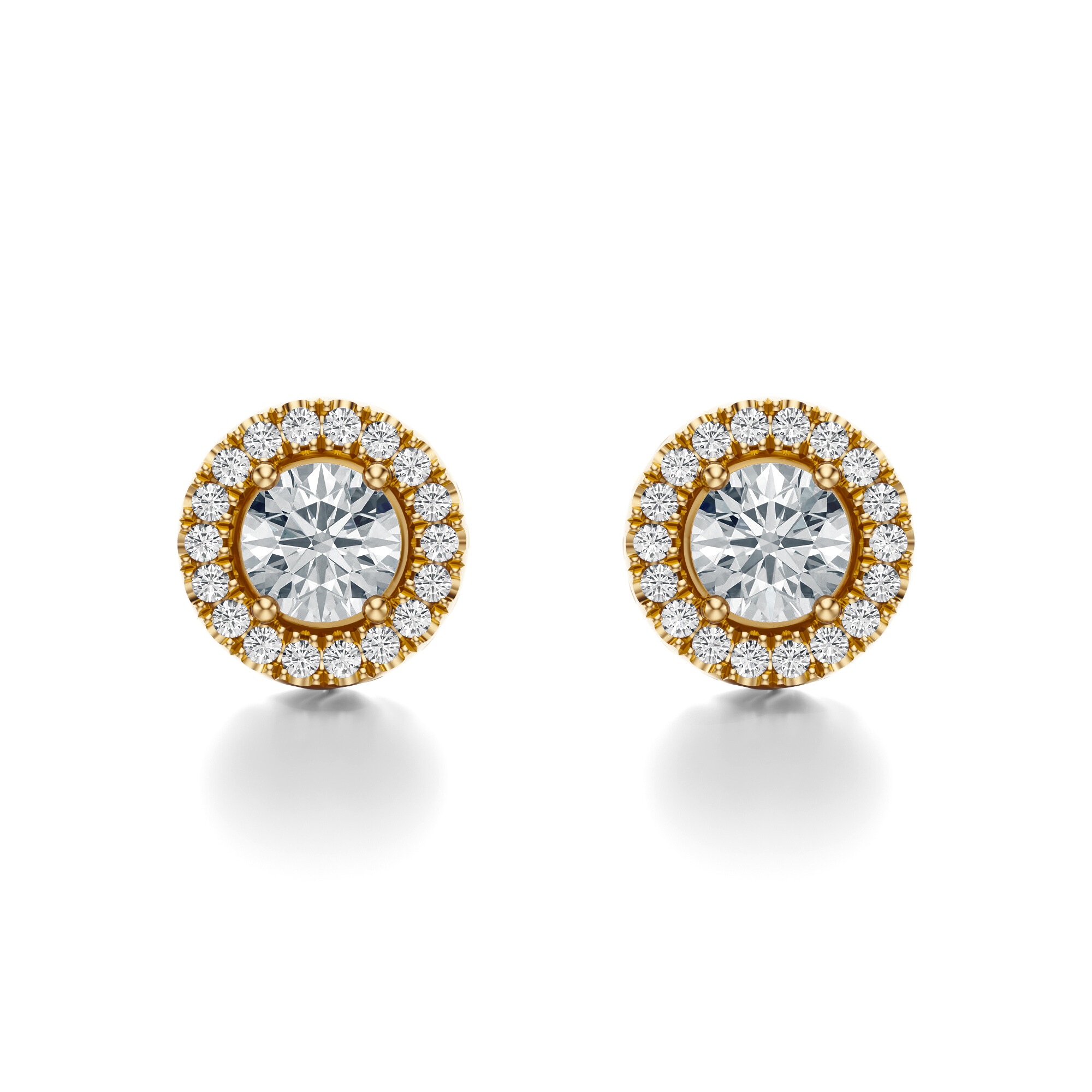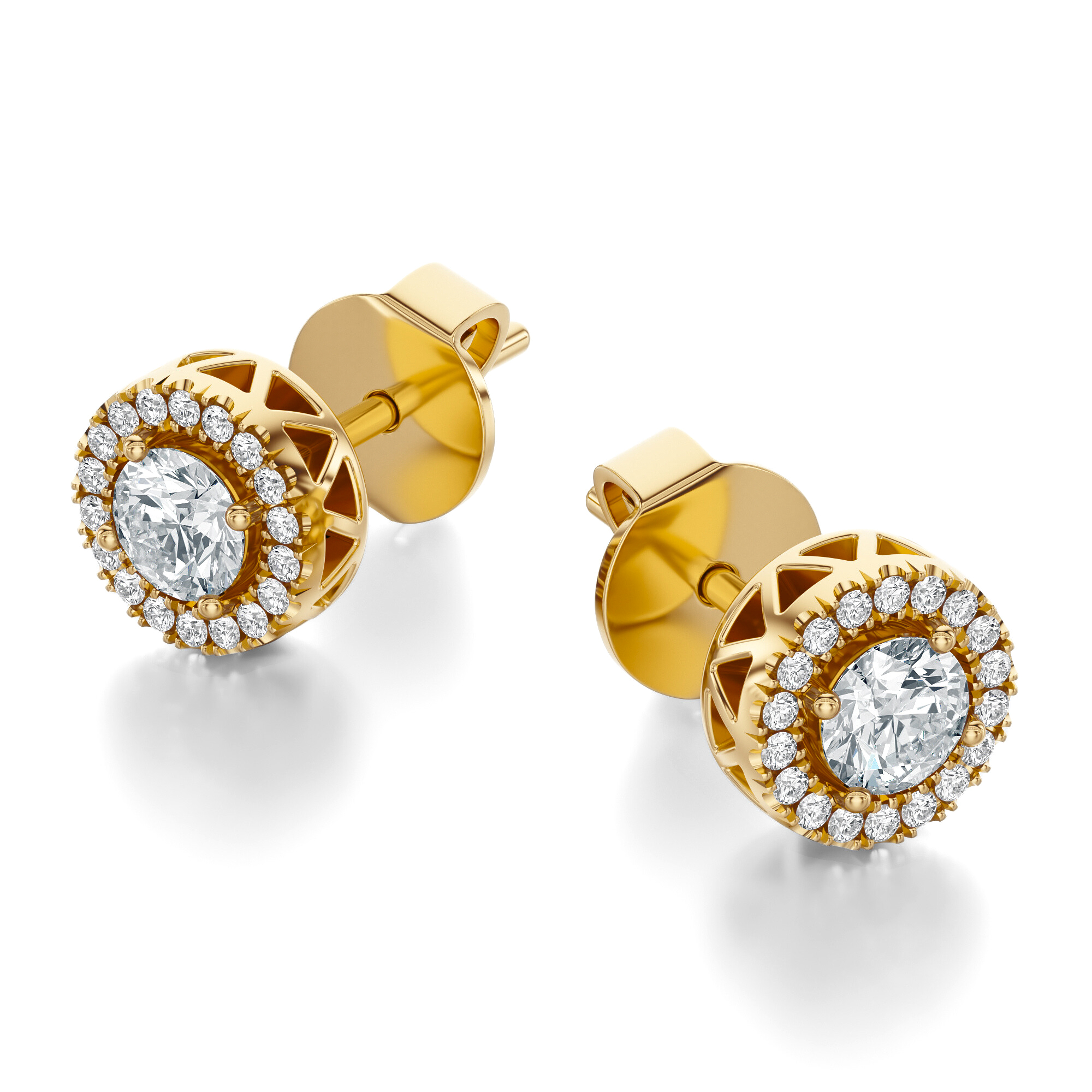 Te wyjątkowe kolczyki to harmonijne połączenie ponadczasowego uroku diamentów z ciepłym blaskiem żółtego złota. Centralnym punktem biżuterii jest okazały, starannie oszlifowany kamień, którego blask podkreślają mniejsze brylanty ułożone w misterną oprawę typu halo. Ten klasyczny motyw nadaje całości wyrafinowanego charakteru i sprawia, że biżuteria lśni z niezwykłą intensywnością przy każdym ruchu.