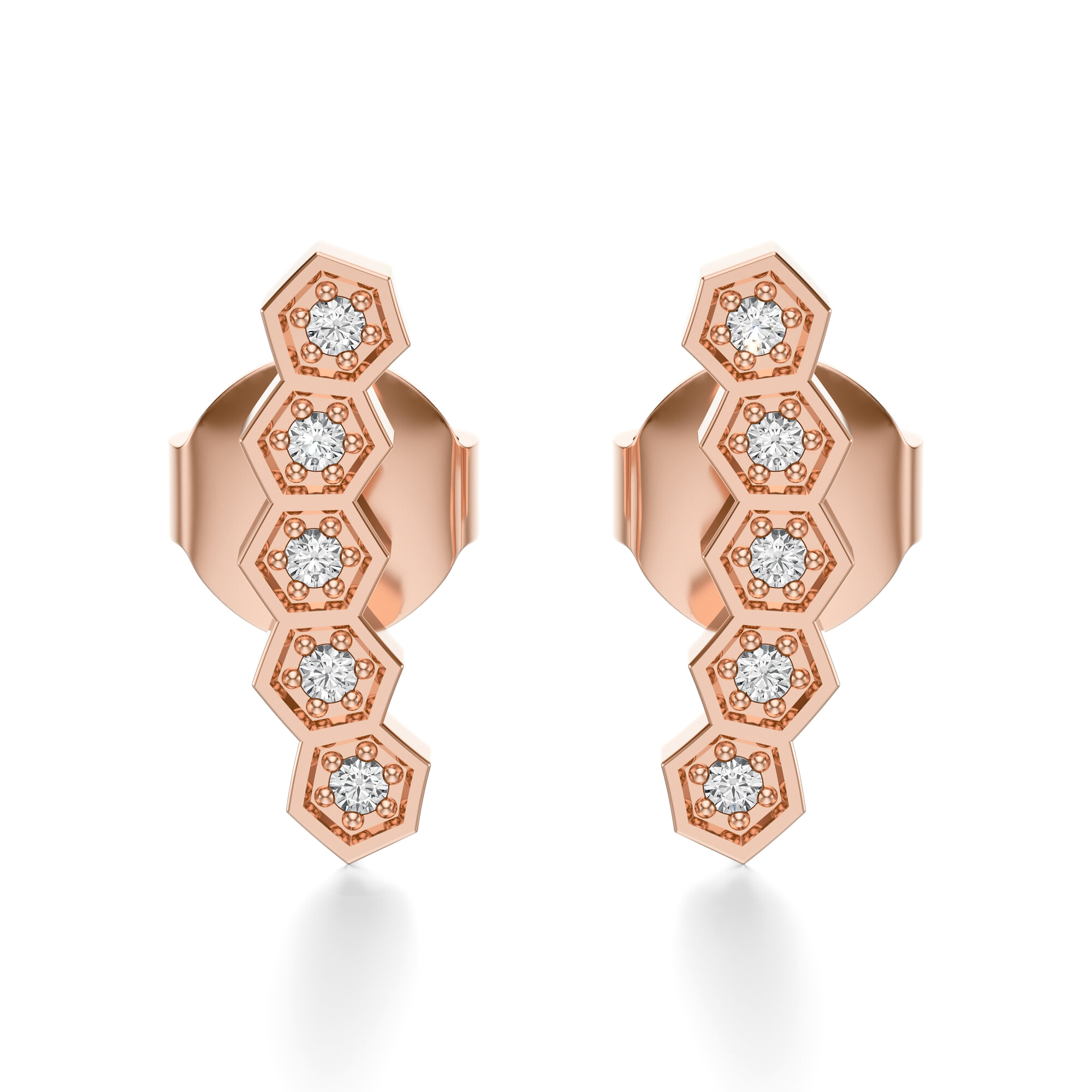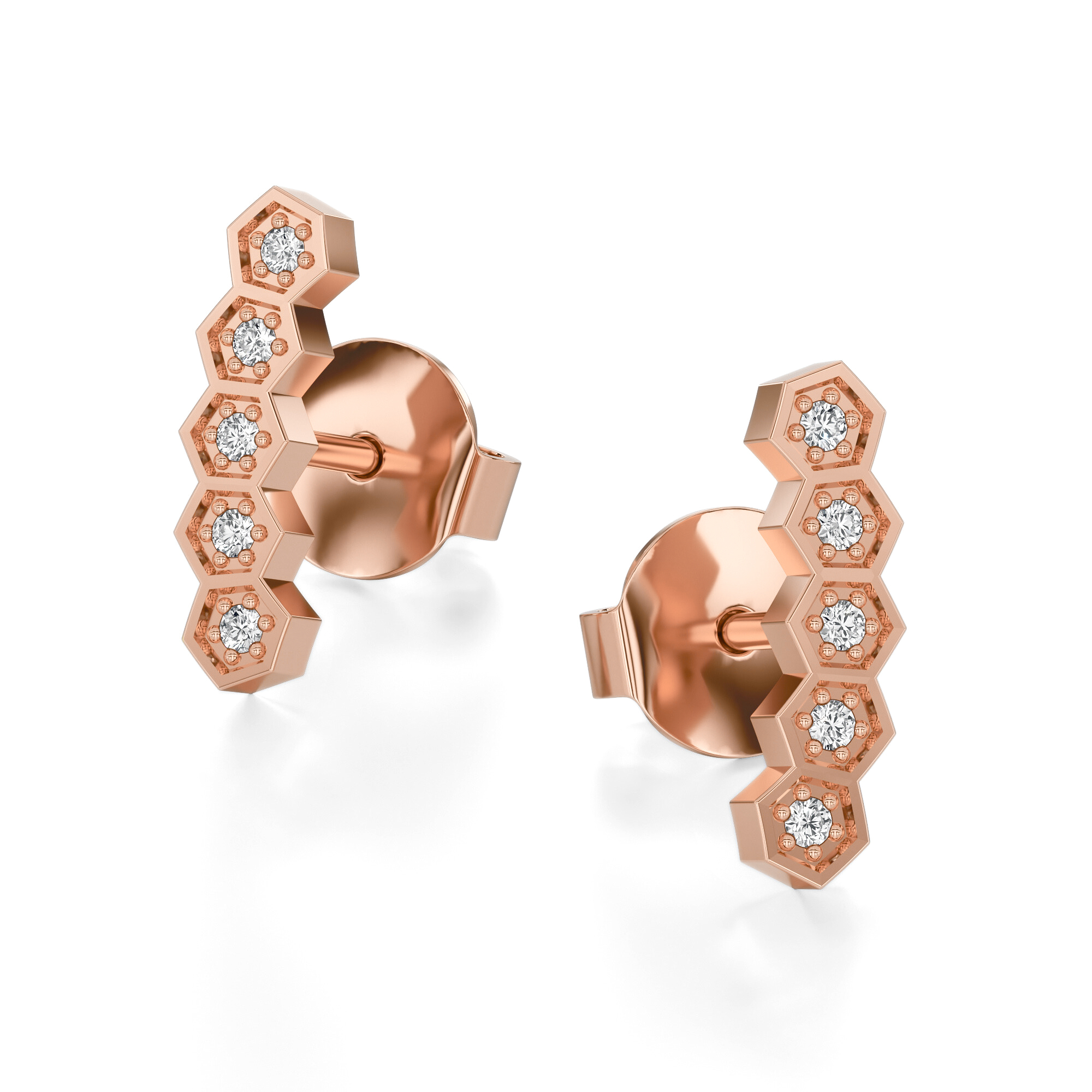 Kolczyki z diamentami w różowym złocie to połączenie nowoczesnego designu z kobiecą delikatnością. Ich unikalna forma inspirowana została strukturą plastra miodu – symbolem doskonałości i harmonii. Geometryczne sześciokąty wypełnione połyskującymi diamentami prezentują się niezwykle elegancko, a ciepły odcień różowego złota nadaje im subtelny i romantyczny charakter.