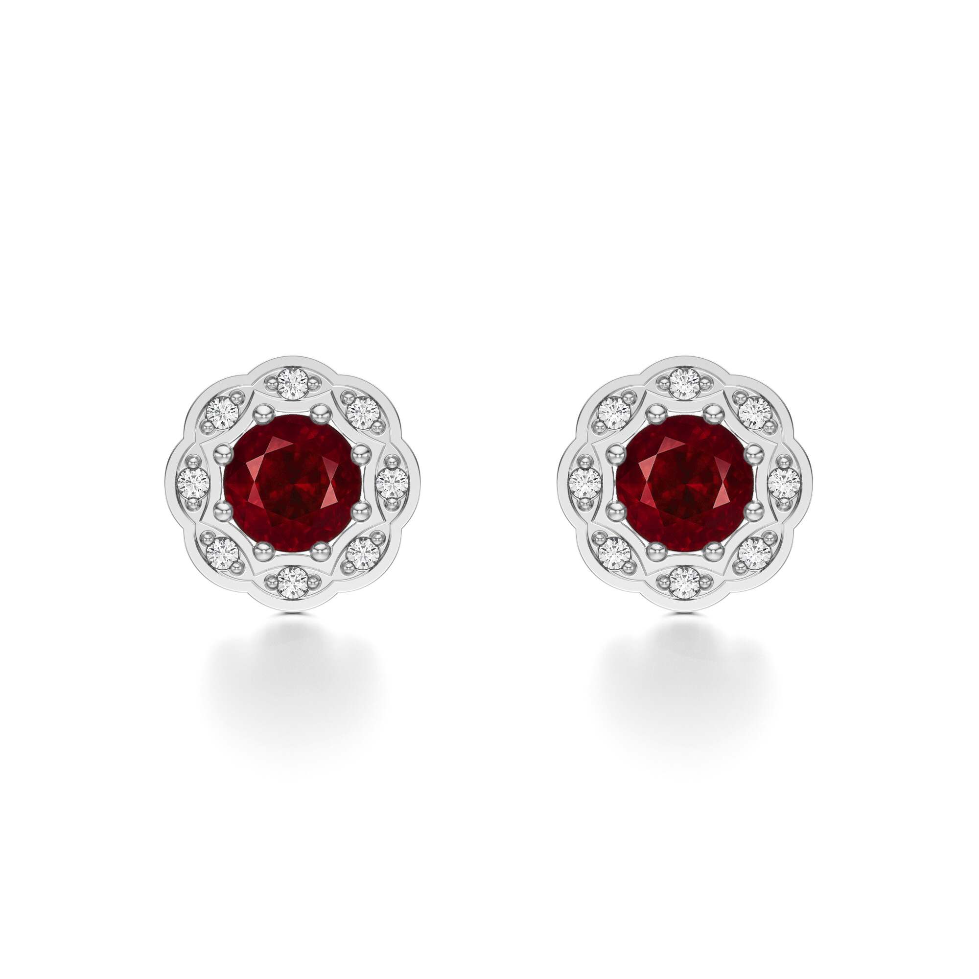 Rubin w szlifie brylantowym, osadzony w centrum, przyciąga spojrzenia głębią swojego nasyconego koloru. Jego piękno zostało podkreślone dekoracyjną oprawą w formie kwiatowego motywu, wysadzaną drobnymi diamentami. To połączenie elegancji i subtelnej finezji sprawia, że kolczyki nabierają wyjątkowej lekkości i harmonii.