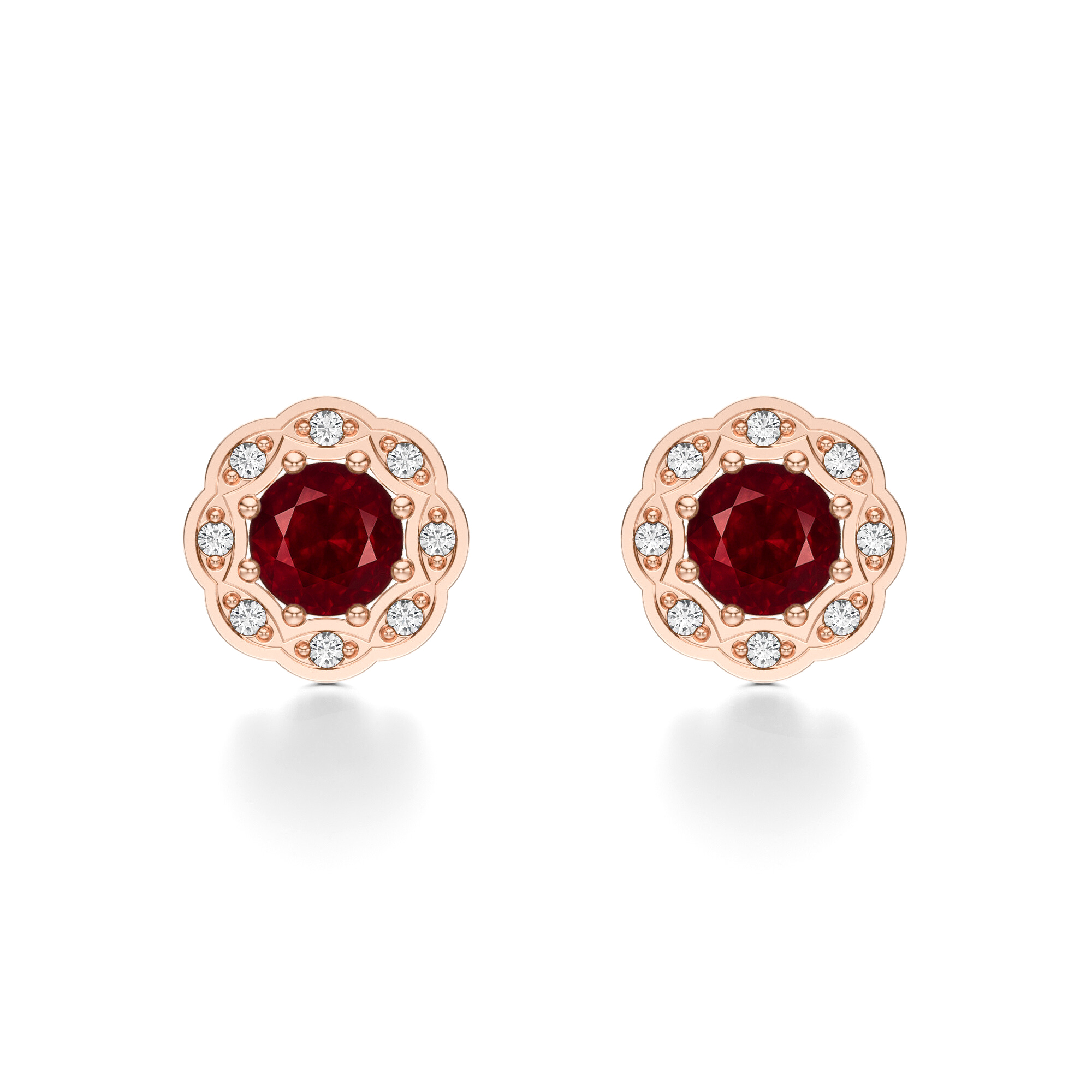 Oprawę rubinów otacza delikatny wianuszek lśniących diamentów, które rozświetlają całość i nadają biżuterii dodatkowej lekkości. Precyzyjnie oszlifowane diamenty doskonale odbijają światło, tworząc subtelne refleksy, które pięknie kontrastują z mocnym blaskiem rubinów. Kwiatowa forma oprawy sprawia, że kolczyki prezentują się niezwykle harmonijnie i z klasą, łącząc tradycję jubilerską z nowoczesnym stylem.