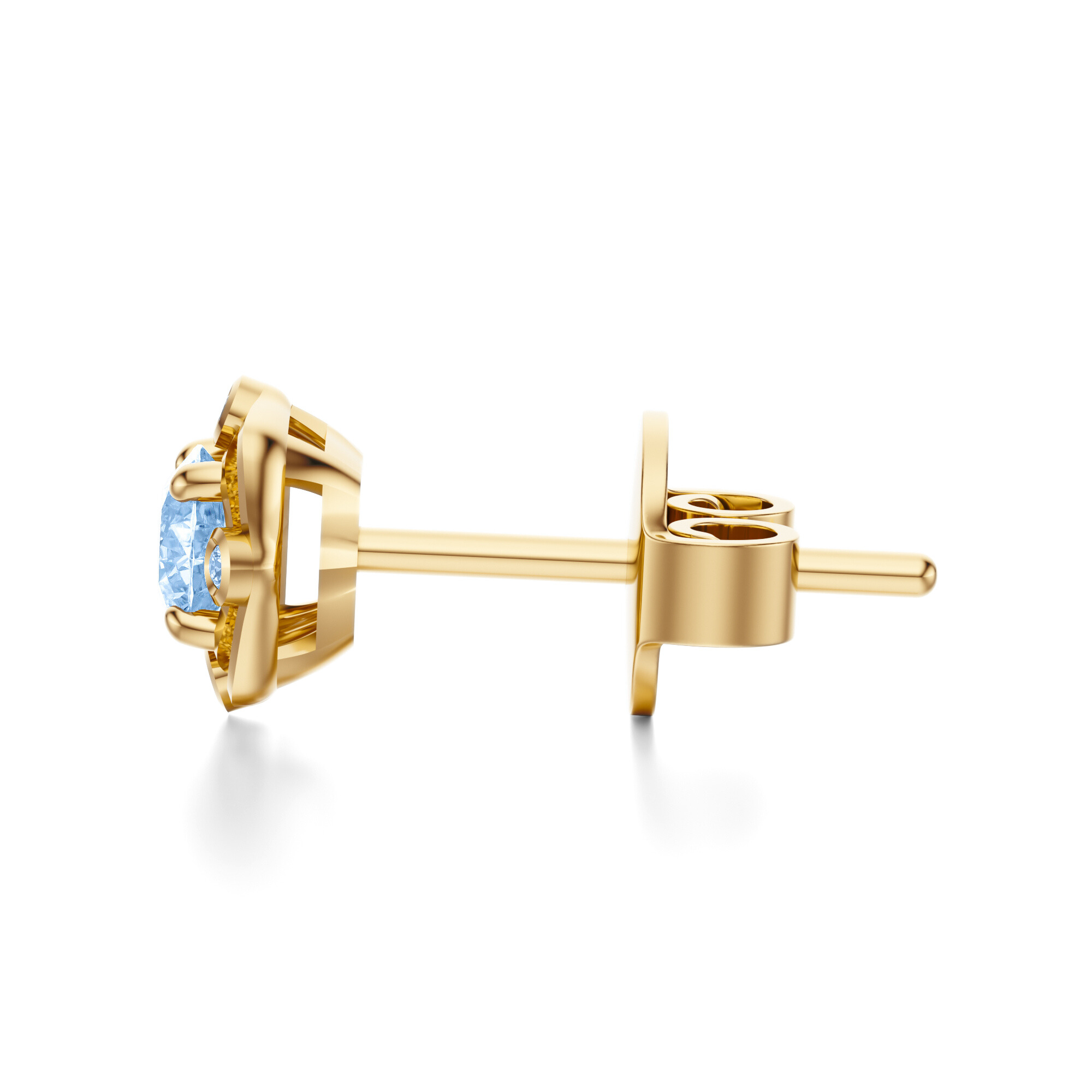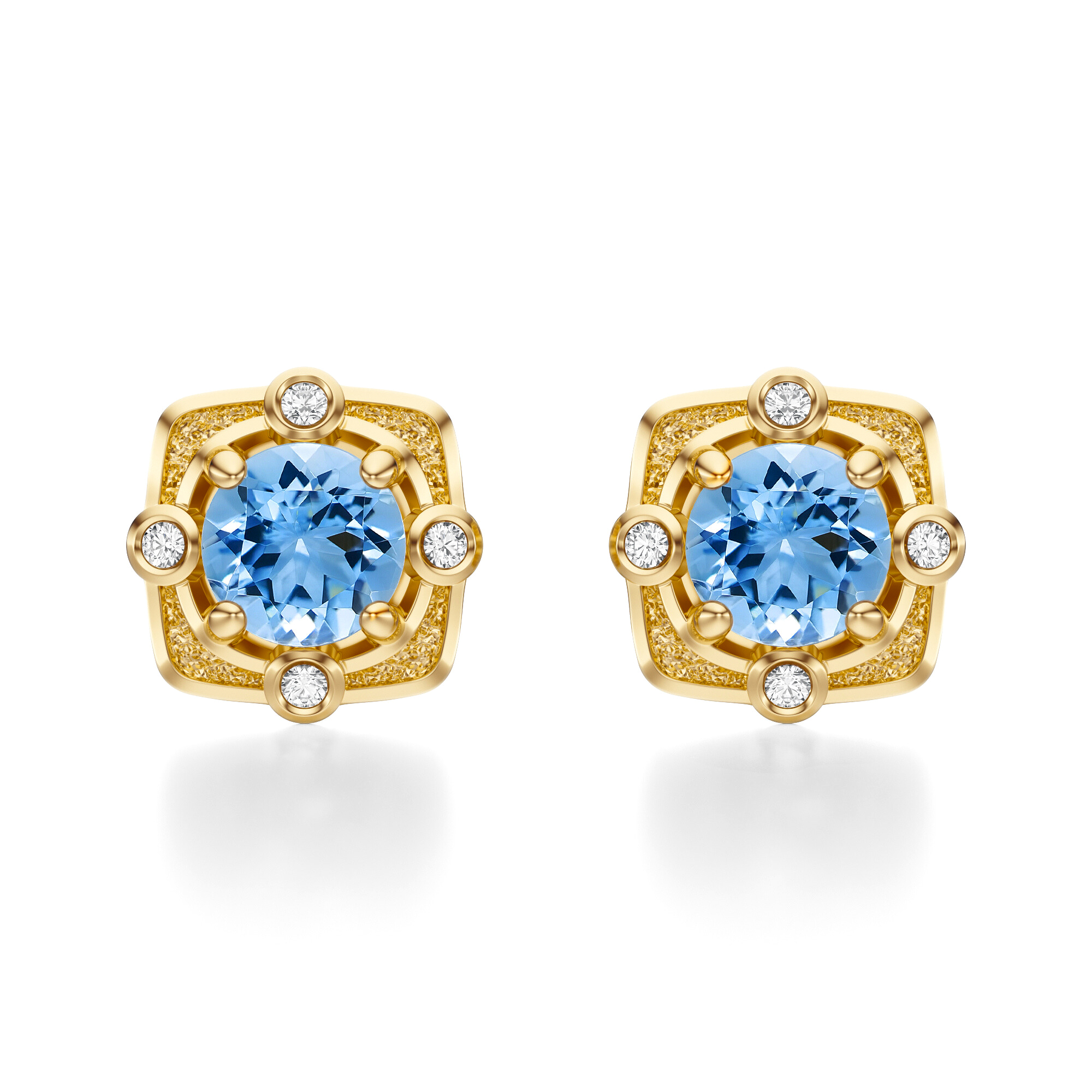 W centrum kompozycji znajduje się topaz o szlifie brylantowym, którego krystaliczna czystość i niebieski blask zachwycają świeżością i lekkością. Kamień otaczają subtelne diamentowe akcenty, rozmieszczone symetrycznie w geometrycznej oprawie, co dodaje kolczykom nowoczesnego, a jednocześnie klasycznego wyrazu. Detale wzbogacone delikatną fakturą złota sprawiają, że całość prezentuje się niezwykle szlachetnie.