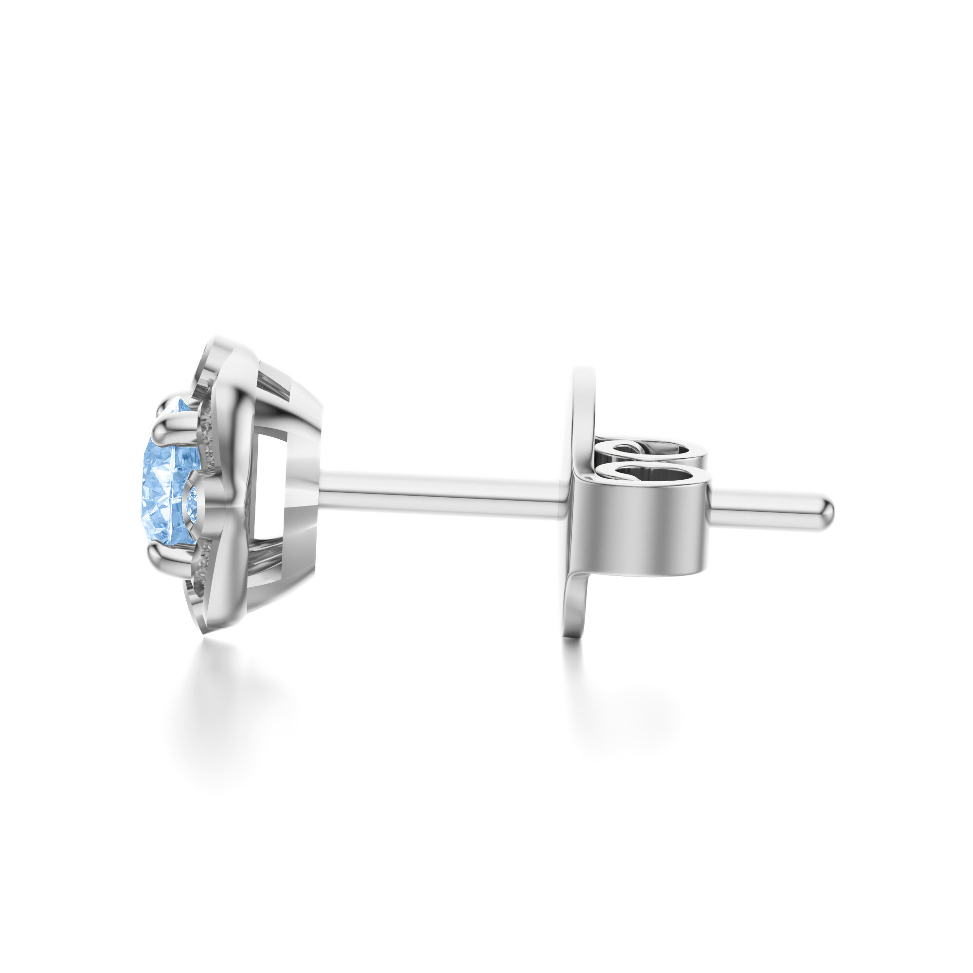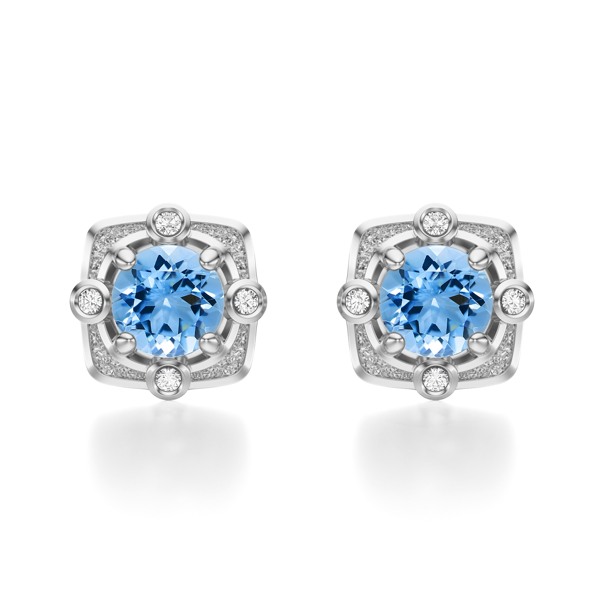 Centralny topaz w szlifie brylantowym przyciąga uwagę intensywnym błękitnym odcieniem, który emanuje lekkością i przejrzystością. Wokół niego rozmieszczono subtelne diamenty osadzone w geometrycznej oprawie, co dodaje całości trójwymiarowego efektu i potęguje blask biżuterii. Precyzyjne detale i chłodny połysk białego złota sprawiają, że kolczyki nabierają wyrafinowanego, a zarazem klasycznego charakteru.