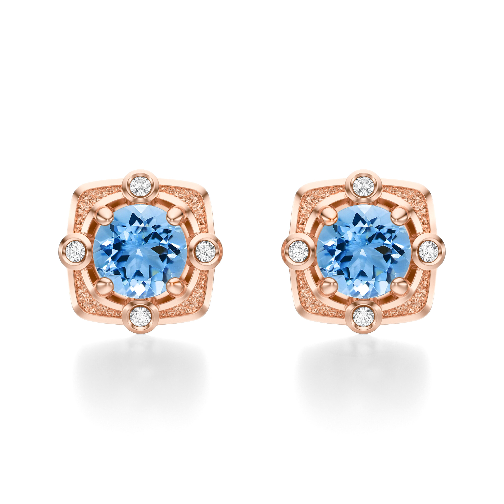 Centralny topaz w szlifie brylantowym urzeka krystaliczną czystością i błękitnym blaskiem, przywodzącym na myśl świeżość nieba o poranku. Otaczające go diamenty rozmieszczone w geometrycznej oprawie dodają całości wyrazistości i sprawiają, że kolczyki mienią się przy każdym ruchu. Rzeźbione detale różowego złota dopełniają kompozycję, nadając jej szlachetnego i wyjątkowego charakteru.