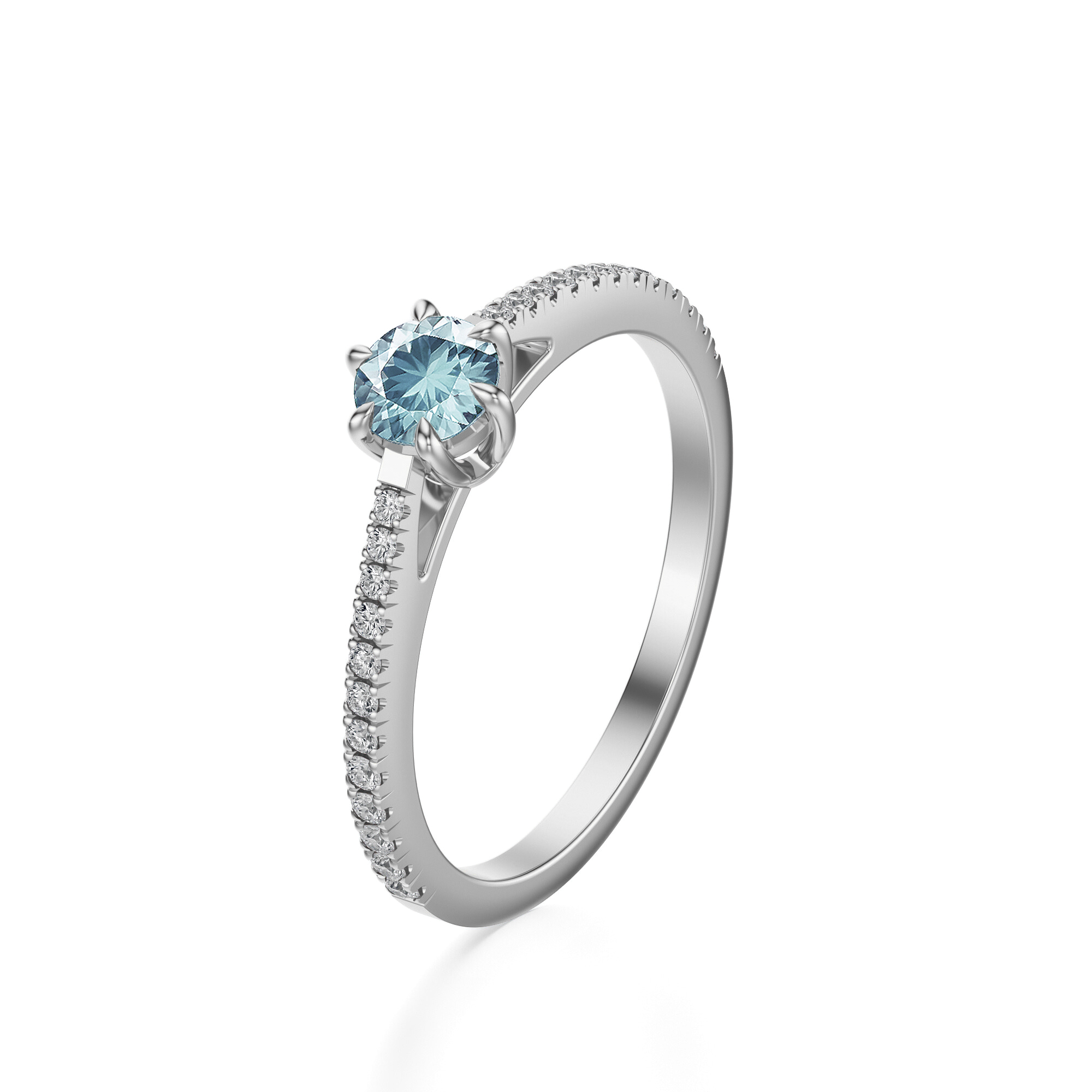 Projekt wyróżnia się smukłą szyną ozdobioną rzędem drobnych diamentów, które delikatnie podkreślają centralny kamień. Dzięki temu całość prezentuje się niezwykle szykownie i lekko, a jednocześnie olśniewająco. Sześciopunktowa oprawa eksponuje akwamaryn w pełnej krasie, dodając mu harmonii i świetlistego wdzięku. To propozycja dla osób, które pragną pierścionka łączącego subtelność z nowoczesnym wyrafinowaniem.