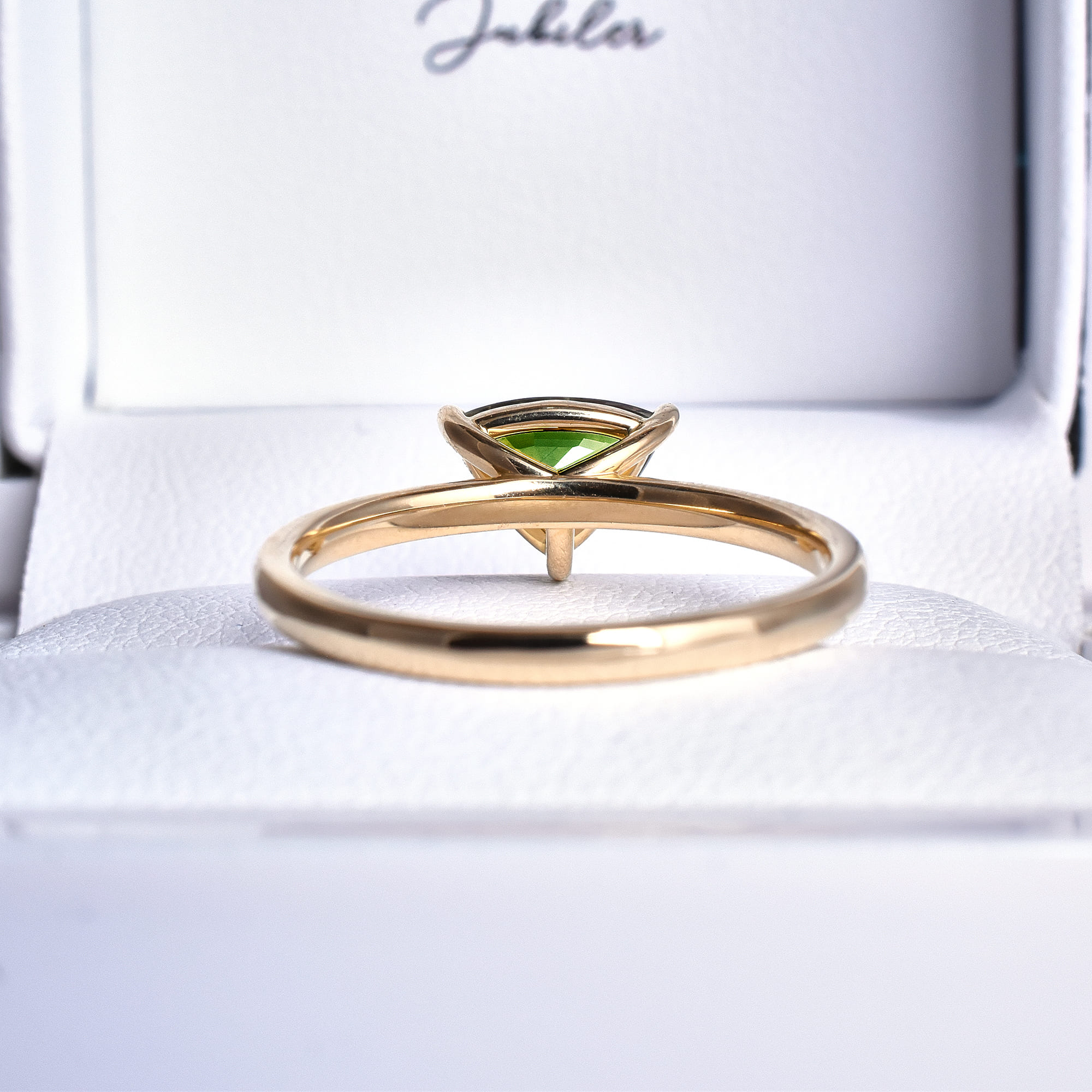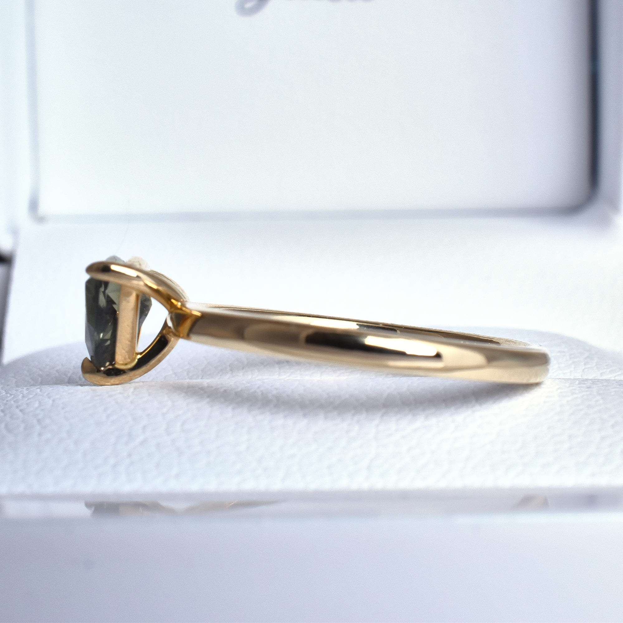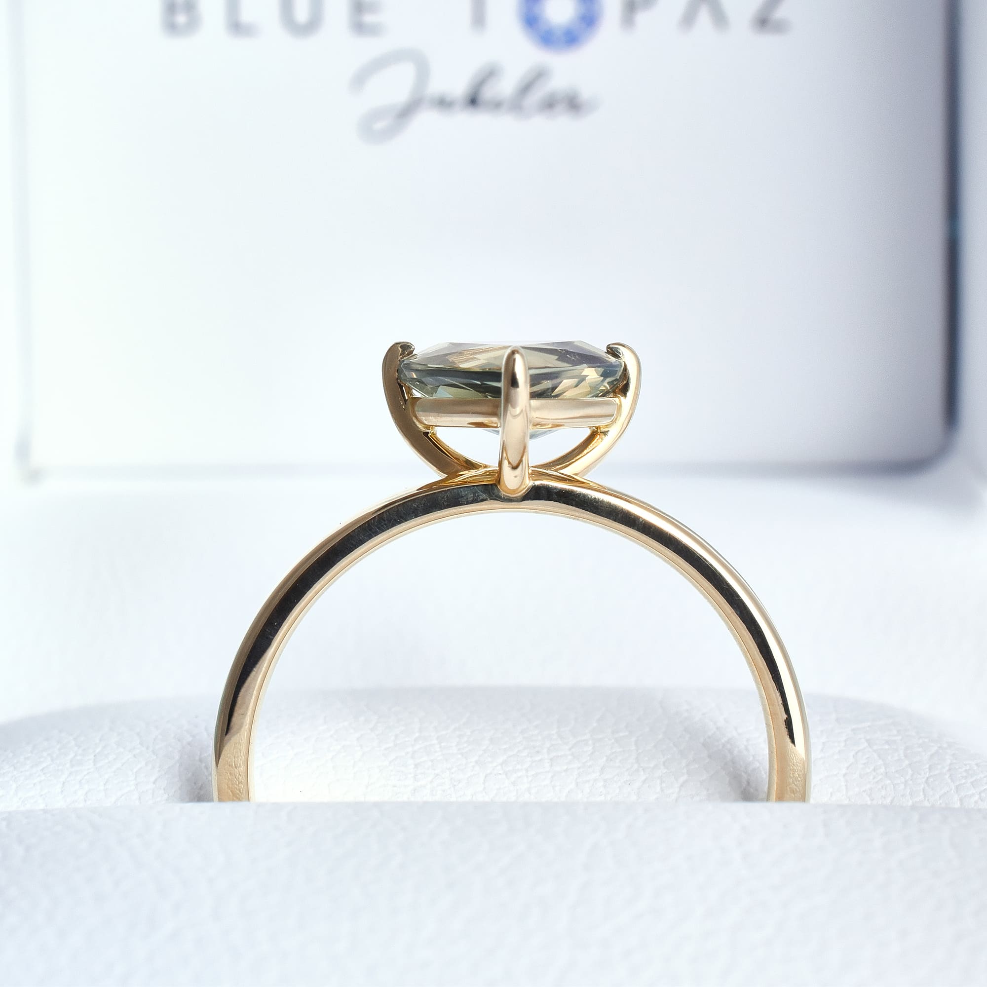 Oprawa z żółtego złota stanowi idealne tło dla tego wyjątkowego kamienia. Jej delikatny połysk wydobywa głębię koloru aleksandrytu, a minimalistyczna forma sprawia, że całość prezentuje się lekko, elegancko i z klasą. Pierścionek jest trwały, wygodny w noszeniu i niezwykle uniwersalny – idealny zarówno na co dzień, jak i na wyjątkowe okazje.