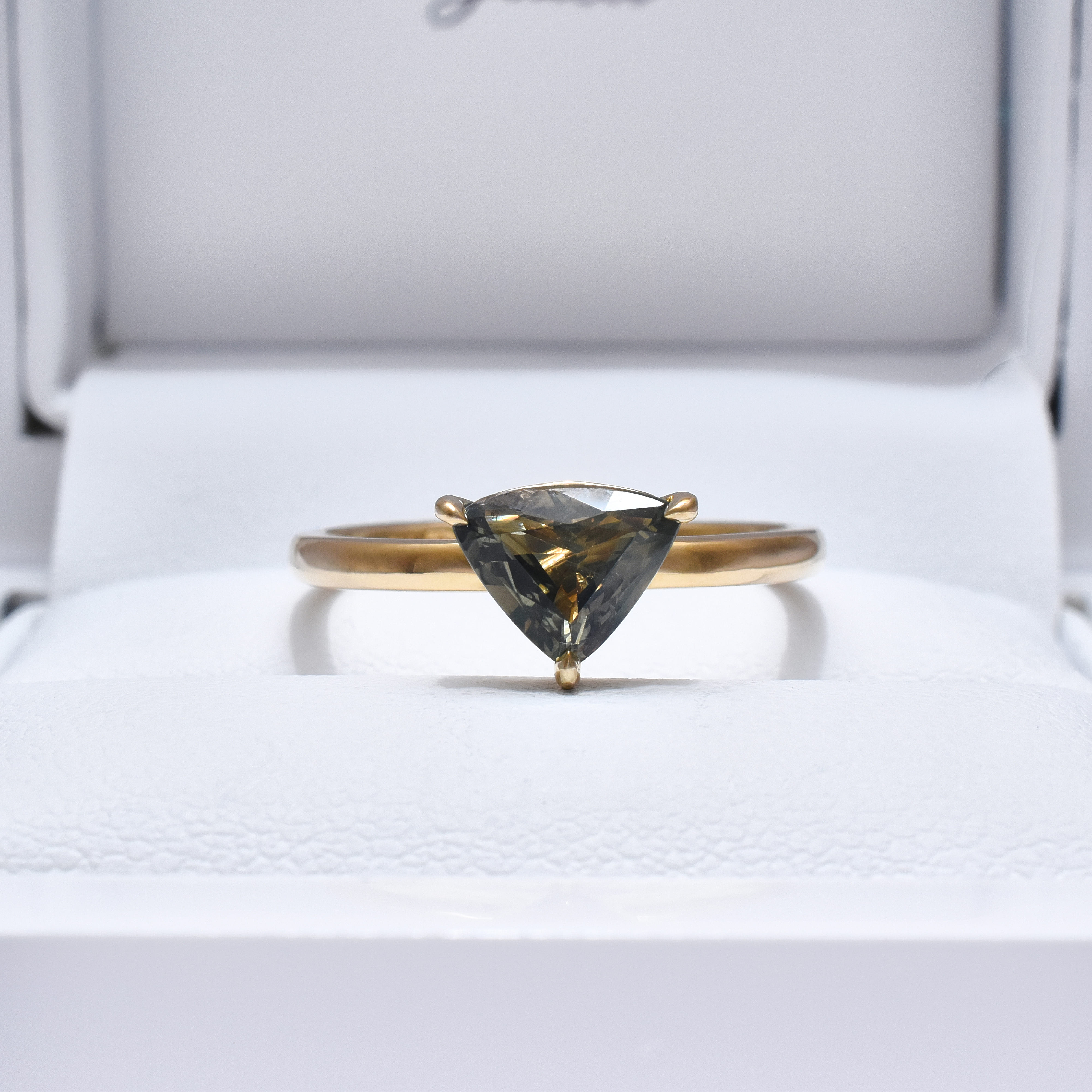 Aleksandryt o szlifie trillion zachwyca precyzją faset, które łapią światło pod każdym kątem, tworząc subtelną grę barw. Każdy ruch dłoni wydobywa z niego nowe refleksy – raz świetliste, raz głębokie, zawsze pełne wdzięku.