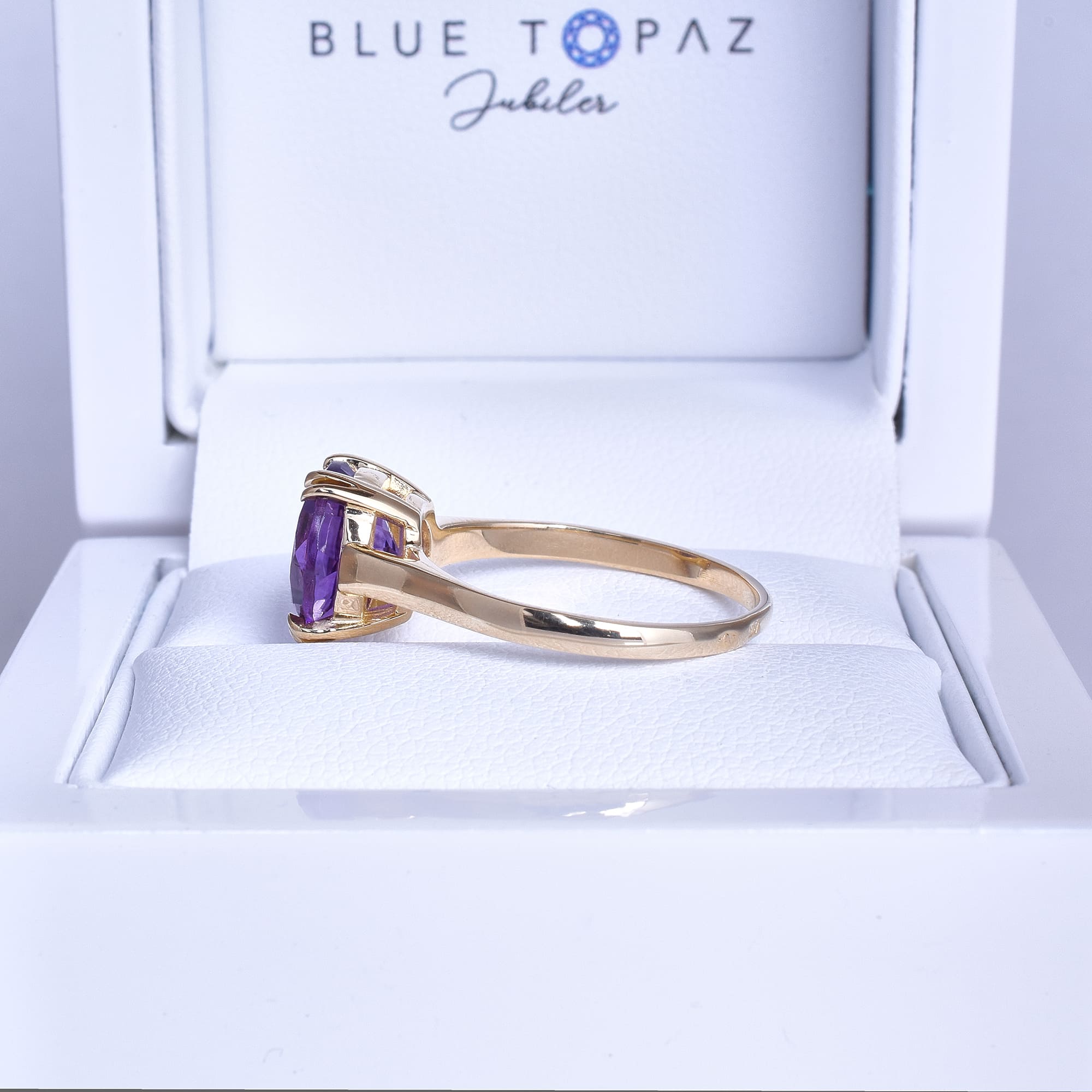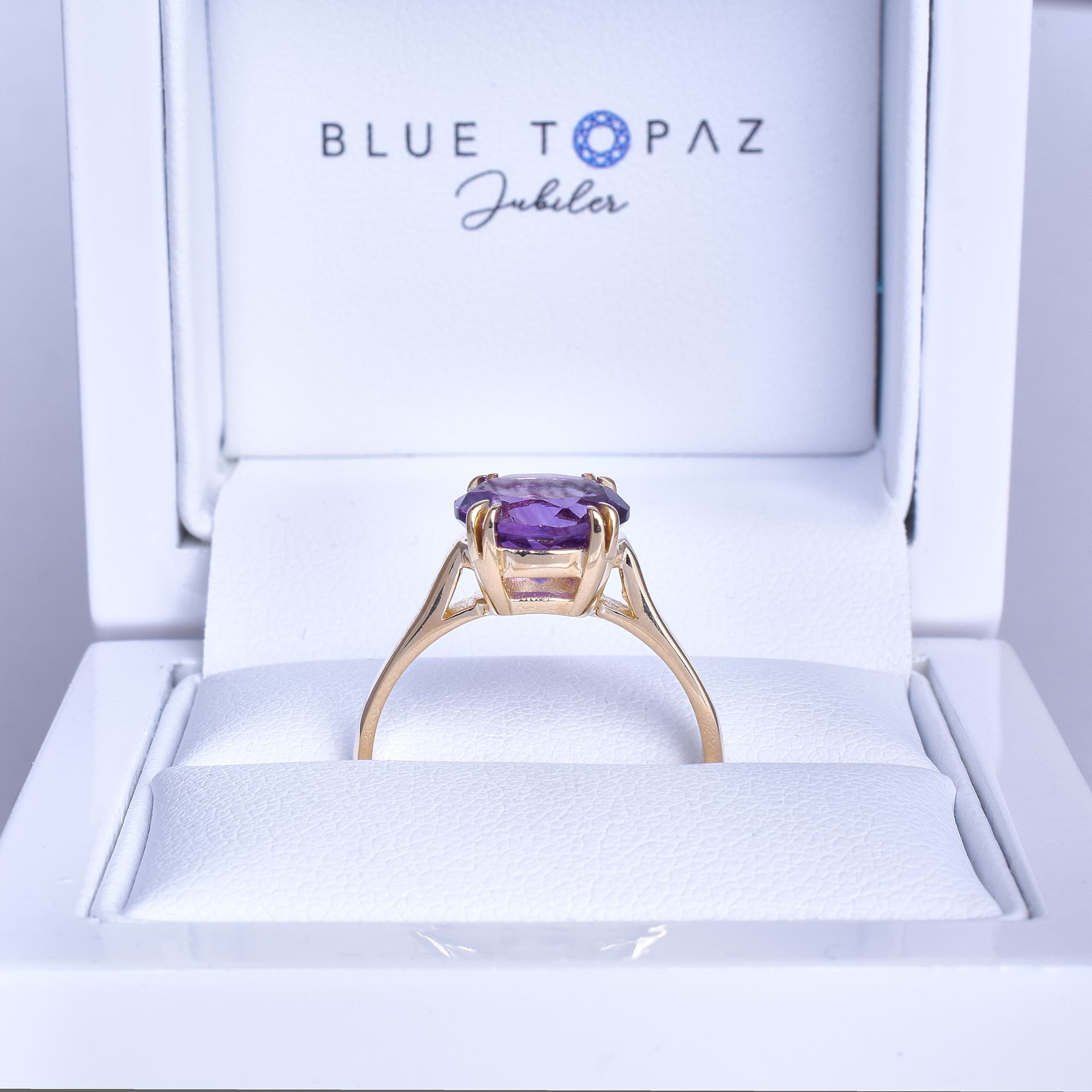 W tym niezwykłym pierścionku klasyczna prostota spotyka się z bogactwem barw, tworząc kompozycję pełną harmonii i subtelnego blasku. Głęboki, fiołkowy odcień ametystu od razu przyciąga spojrzenia, hipnotyzuje niczym kropla wieczornego nieba zatrzymana w kamieniu. Jego świetlistość pięknie kontrastuje z ciepłym kolorem żółtego złota, nadając całości ponadczasowego, niemal królewskiego charakteru.Projekt pierścionka podkreśla elegancję centralnego kamienia. Ametyst został osadzony w klasycznej czterozaczepowej oprawie, która subtelnie unosi go ponad obrączkę, pozwalając światłu swobodnie przenikać przez jego fasety. Dzięki temu kamień mieni się przy każdym ruchu, odsłaniając bogactwo swoich purpurowo-lawendowych tonów. Delikatnie zwężająca się szyna nadaje konstrukcji lekkość, jednocześnie eksponując sam kamień w sposób wyjątkowo szlachetny.