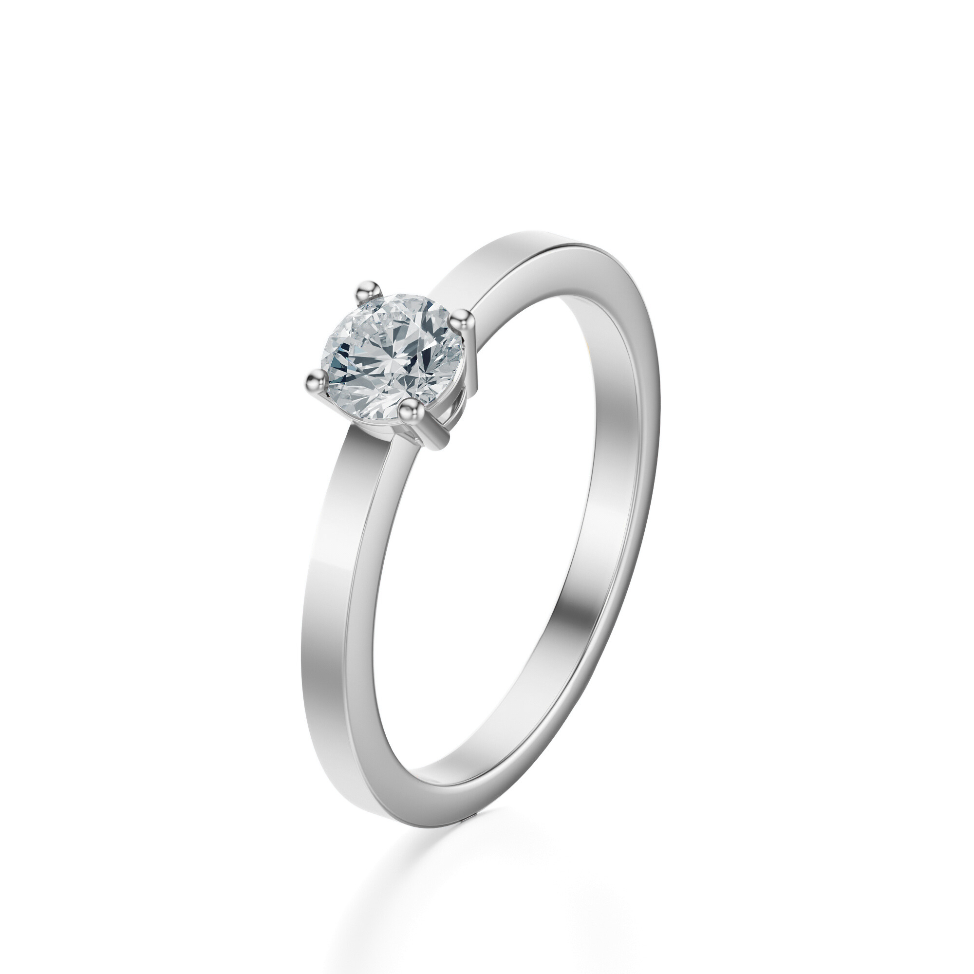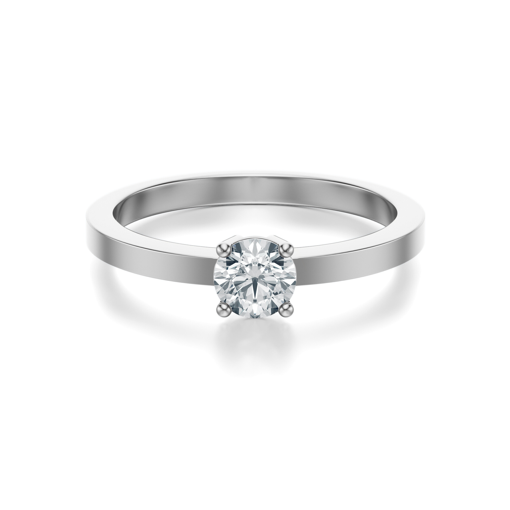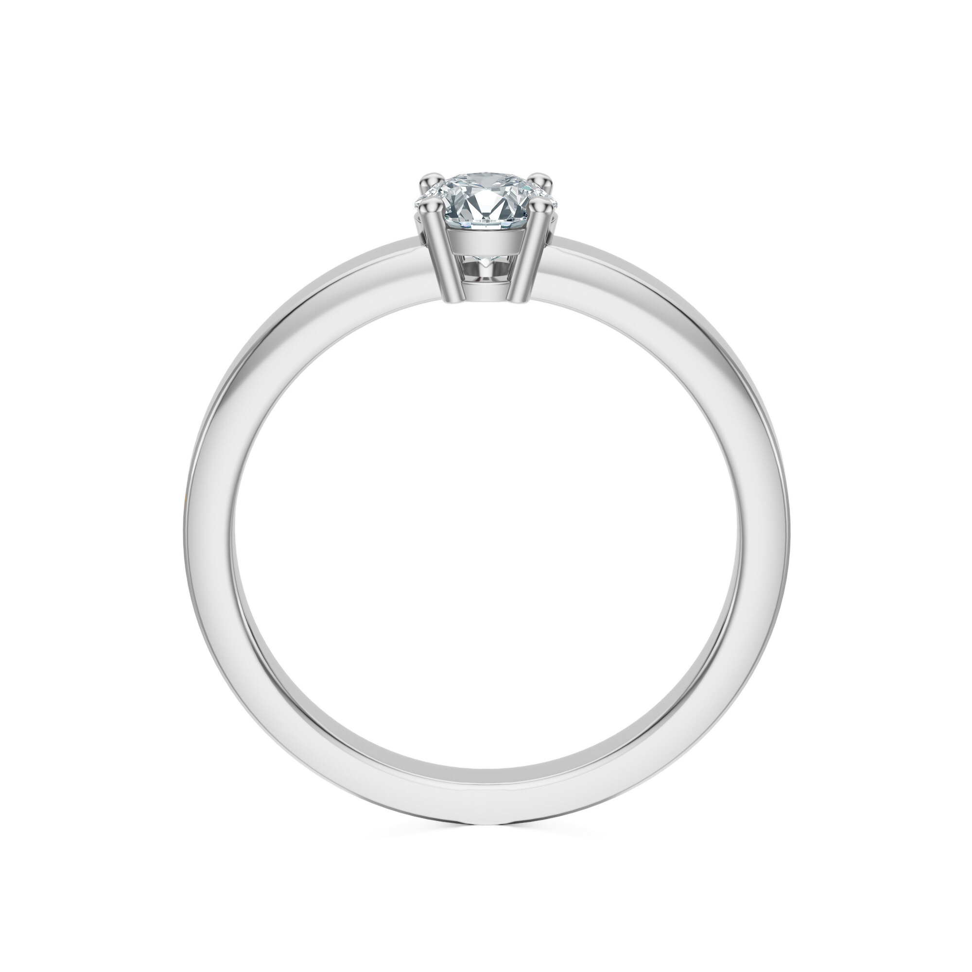 Centralny diament o okrągłym szlifie urzeka czystością i świetlistością, odbijając światło w lśniących refleksach. Osadzony w klasycznej, czterozaczepowej oprawie, zyskuje pełną widoczność i przestrzeń, by ujawnić cały swój ponadczasowy urok. Taki sposób prezentacji kamienia podkreśla jego symbolikę trwałość, wierność i emocje, które mają być początkiem wspólnej historii.