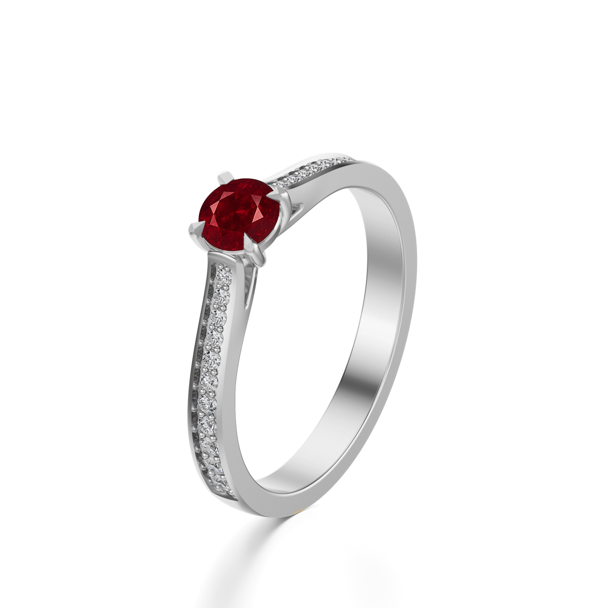 Centralny rubin o masie 0,50 ct. w szlifie brylantowym olśniewa intensywnością czerwieni i wyjątkowym blaskiem. Towarzyszące mu diamenty potęgują efekt świetlistości, sprawiając, że całość prezentuje się niezwykle elegancko i luksusowo.