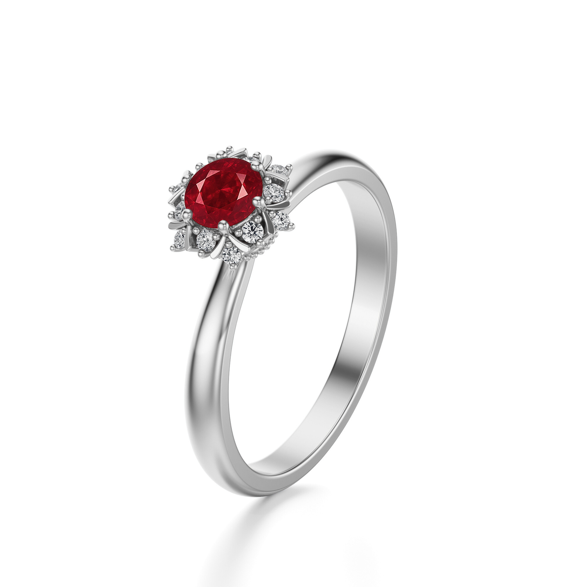 Owalny rubin został otoczony delikatnym diamentowym wieńcem, którego układ przypomina finezyjny kwiat rozkwitający blaskiem. Dzięki temu pierścionek nabiera romantycznego, niemal królewskiego charakteru, idealnego dla osób ceniących elegancję i niepowtarzalny styl. Smukła obrączka nadaje całości lekkości, pozwalając centralnemu kamieniowi pozostać w centrum uwagi.
