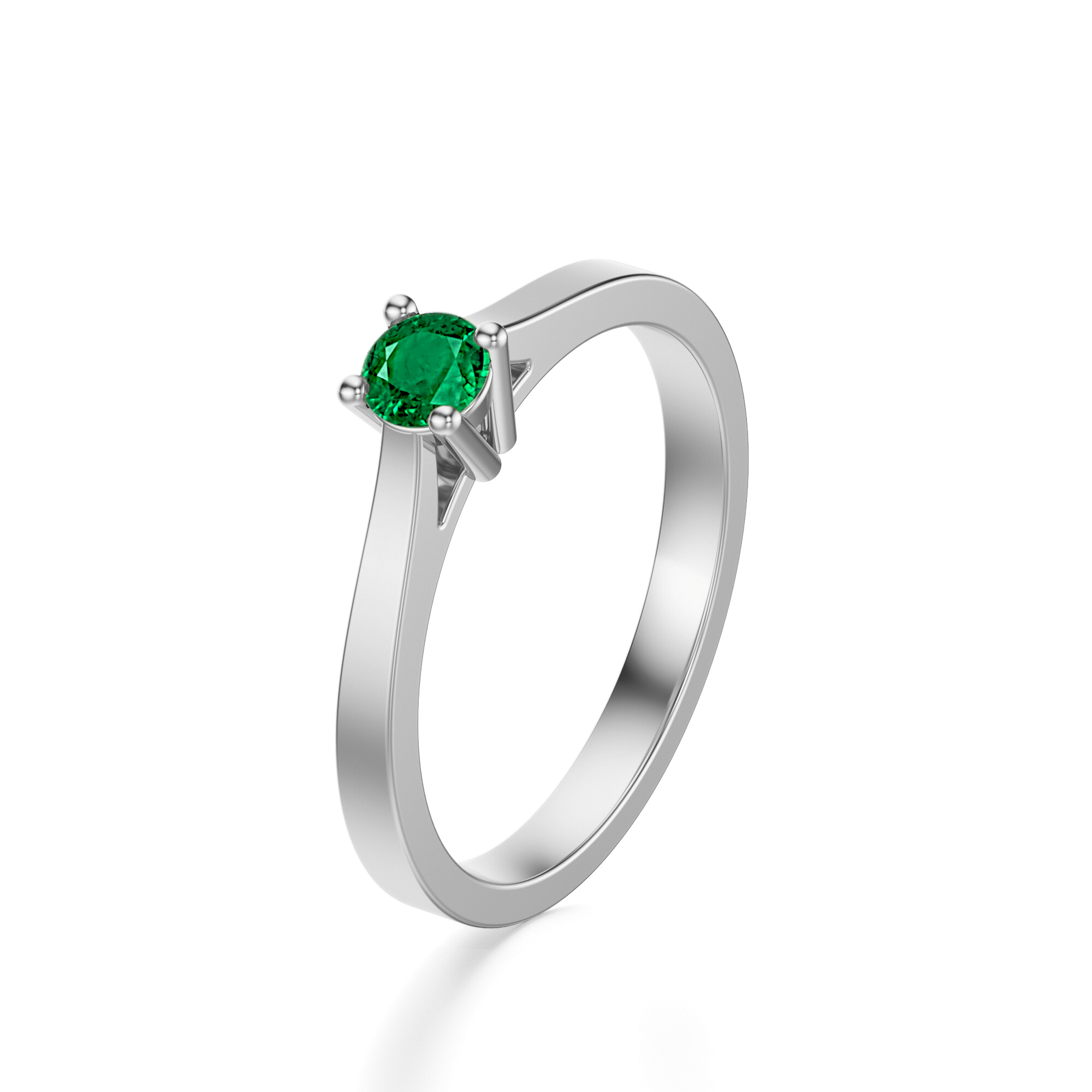 Ten elegancki pierścionek zaręczynowy wykonany z białego złota próby 585 to połączenie minimalistycznego designu z ponadczasowym urokiem kamieni szlachetnych. Centralny punkt zdobi szmaragd o intensywnej, głębokiej zieleni, oszlifowany w szlifie brylantowym, który wydobywa pełnię blasku i nasycenia barwy. Chłodna tonacja białego złota podkreśla czystość i świeżość koloru kamienia, nadając całości wyjątkowej lekkości.Projekt pierścionka opiera się na prostej, gładkiej obrączce, która delikatnie zwęża się ku górze, kierując uwagę na centralny kamień. Czteroramienna oprawa nie tylko stabilnie utrzymuje szmaragd, ale także pozwala światłu swobodnie przenikać przez jego fasety, potęgując efekt świetlistości. Tak zaprojektowana kompozycja sprawia, że pierścionek jest jednocześnie subtelny i wyrazisty, stanowiąc doskonały wybór dla kobiet ceniących klasykę w nowoczesnym wydaniu.
