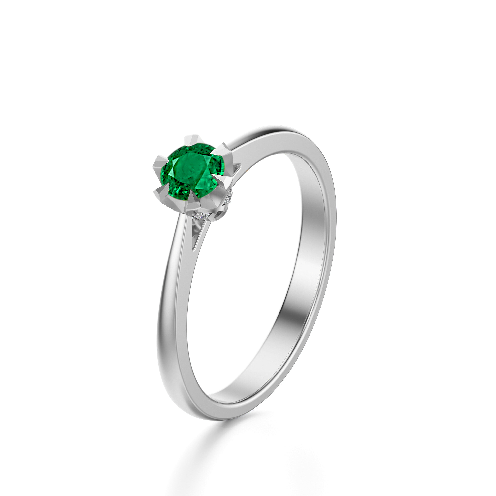 Elegancki pierścionek wykonany z białego złota próby 585 zachwyca subtelną formą i ponadczasowym charakterem. Jego centralnym elementem jest naturalny szmaragd o głębokiej, intensywnie zielonej barwie, która kontrastuje z chłodnym odcieniem złota, tworząc harmonijną i luksusową kompozycję. Kamień osadzony jest w sześciu delikatnych łapkach, które zapewniają mu stabilność, a jednocześnie pozwalają światłu swobodnie przenikać przez jego fasety, wydobywając naturalny blask i bogactwo koloru.