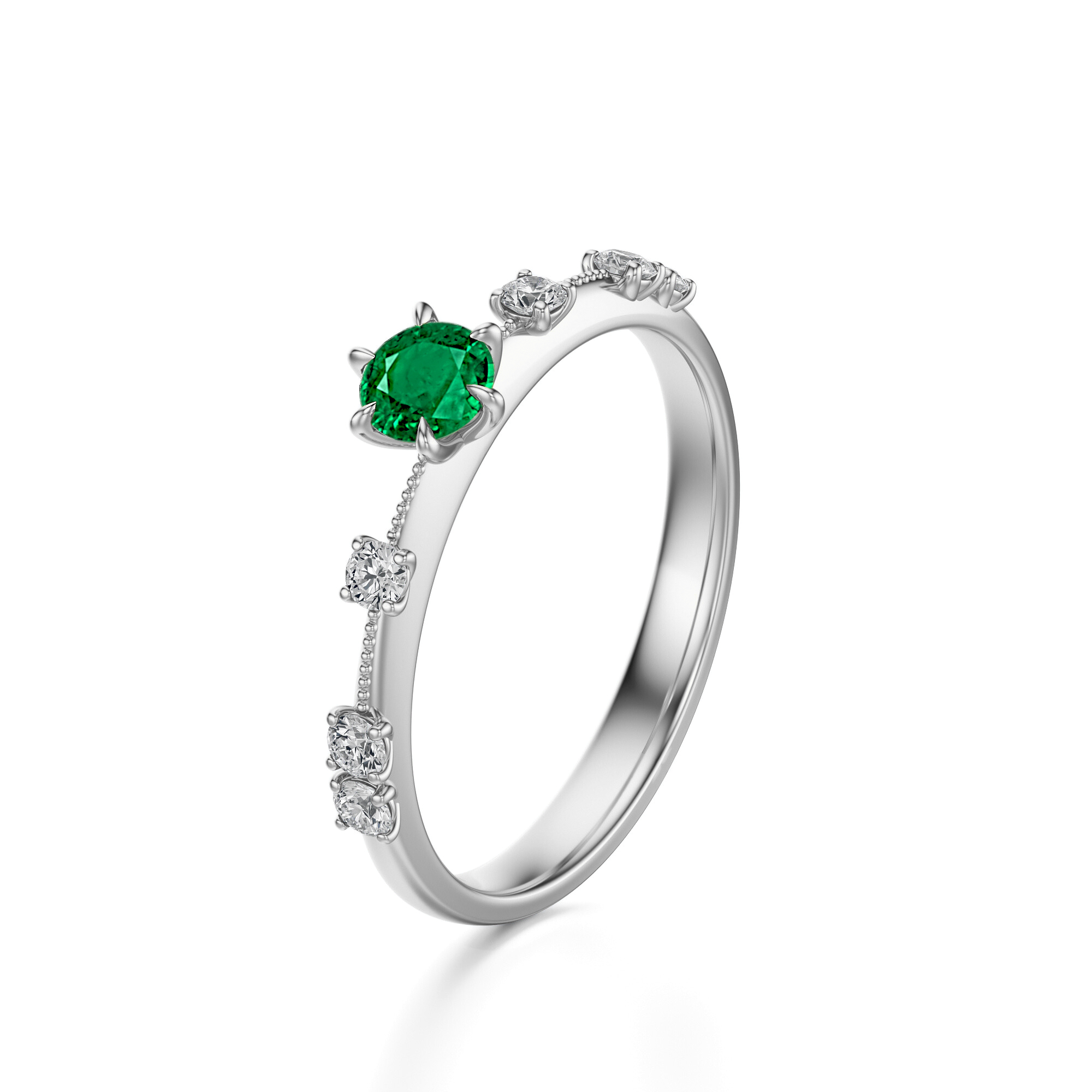 Ten delikatny pierścionek z białego złota próby 585 to połączenie nowoczesnej elegancji i subtelnego luksusu. W centrum kompozycji znajduje się szmaragd o intensywnej, szlachetnej zieleni, osadzony w czterech klasycznych łapkach. Jego barwa przywodzi na myśl świeżość wiosennej przyrody, symbolizując harmonię, nadzieję i odrodzenie. Dzięki oprawie typu open, kamień pięknie łapie światło, podkreślając naturalny blask i głębię koloru.