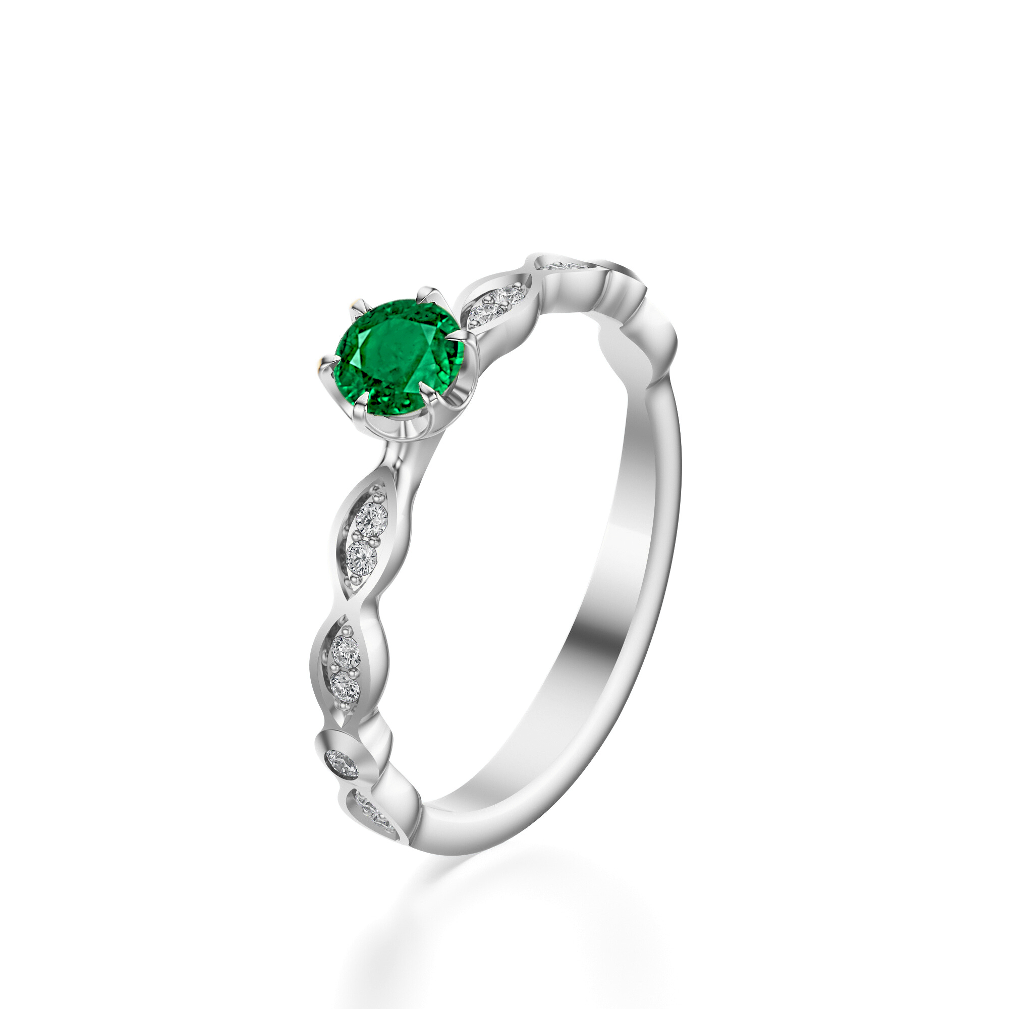 Centralny szmaragd o masie 0,50 ct, w szlifie brylantowym, zachwyca czystą, soczystą barwą, a sposób osadzenia kamienia pozwala mu w pełni wydobyć swój świetlisty blask. Otaczające go drobne diamenty dodatkowo potęgują efekt luksusu i nadają pierścionkowi wyjątkowego splendoru.