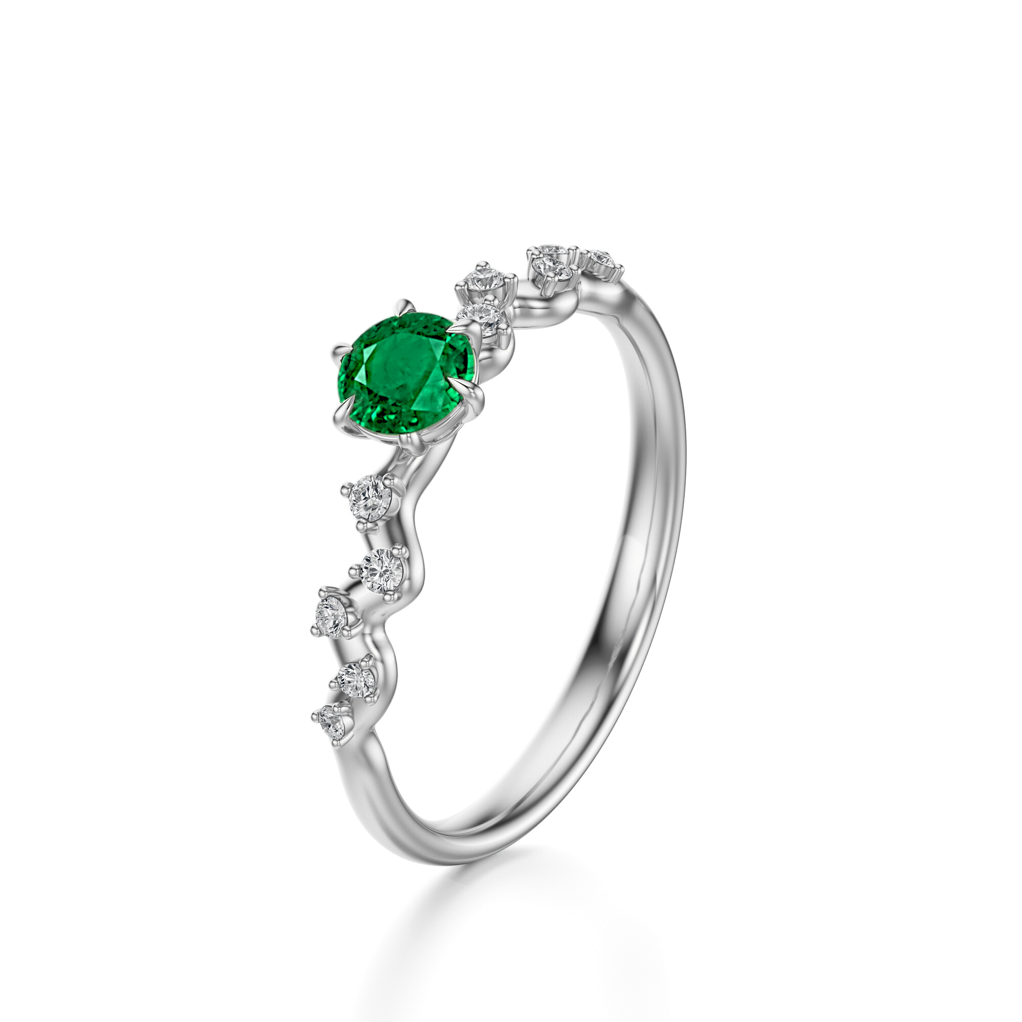 Elegancja i oryginalność spotykają się w tym wyjątkowym modelu, w którym centralnym punktem jest intensywnie zielony szmaragd w klasycznym szlifie okrągłym. Kamień osadzony został w delikatnych łapkach z białego złota próby 585, co podkreśla jego barwę i czyni ją jeszcze bardziej wyrazistą.
