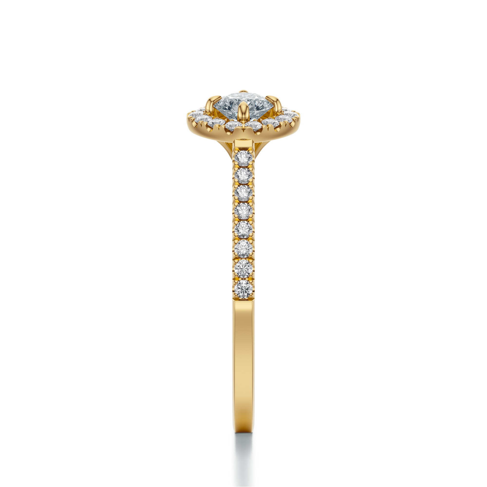 Centralny kamień otacza efektowna aureola z mniejszych diamentów, tworzących harmonijną ramę, która optycznie powiększa główny diament i potęguje jego blask. Dodatkowo diamenty zdobią również część szyny, nadając pierścionkowi wyrafinowanego charakteru i sprawiając, że biżuteria lśni przy każdym ruchu dłoni.