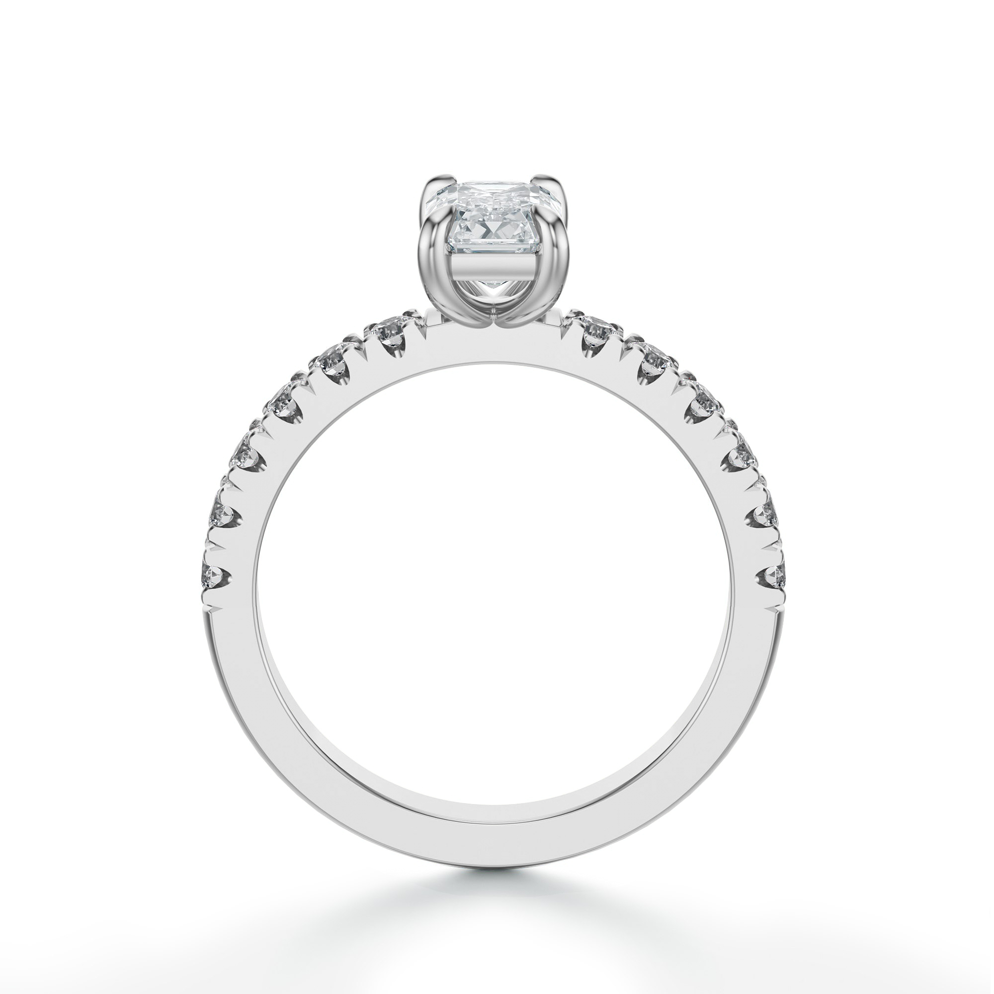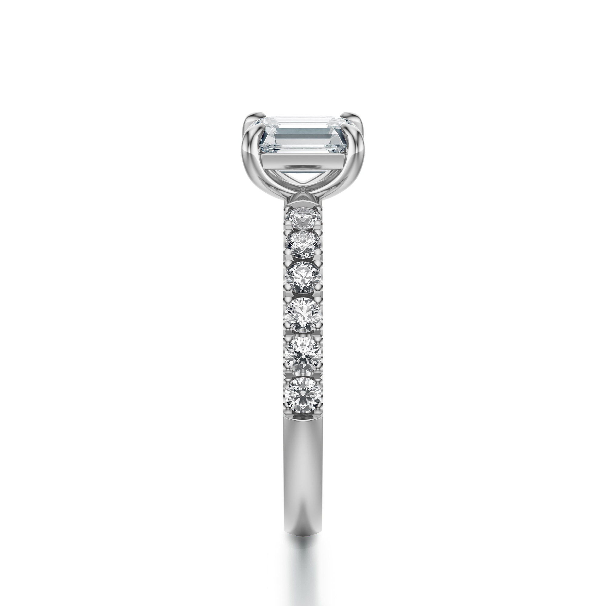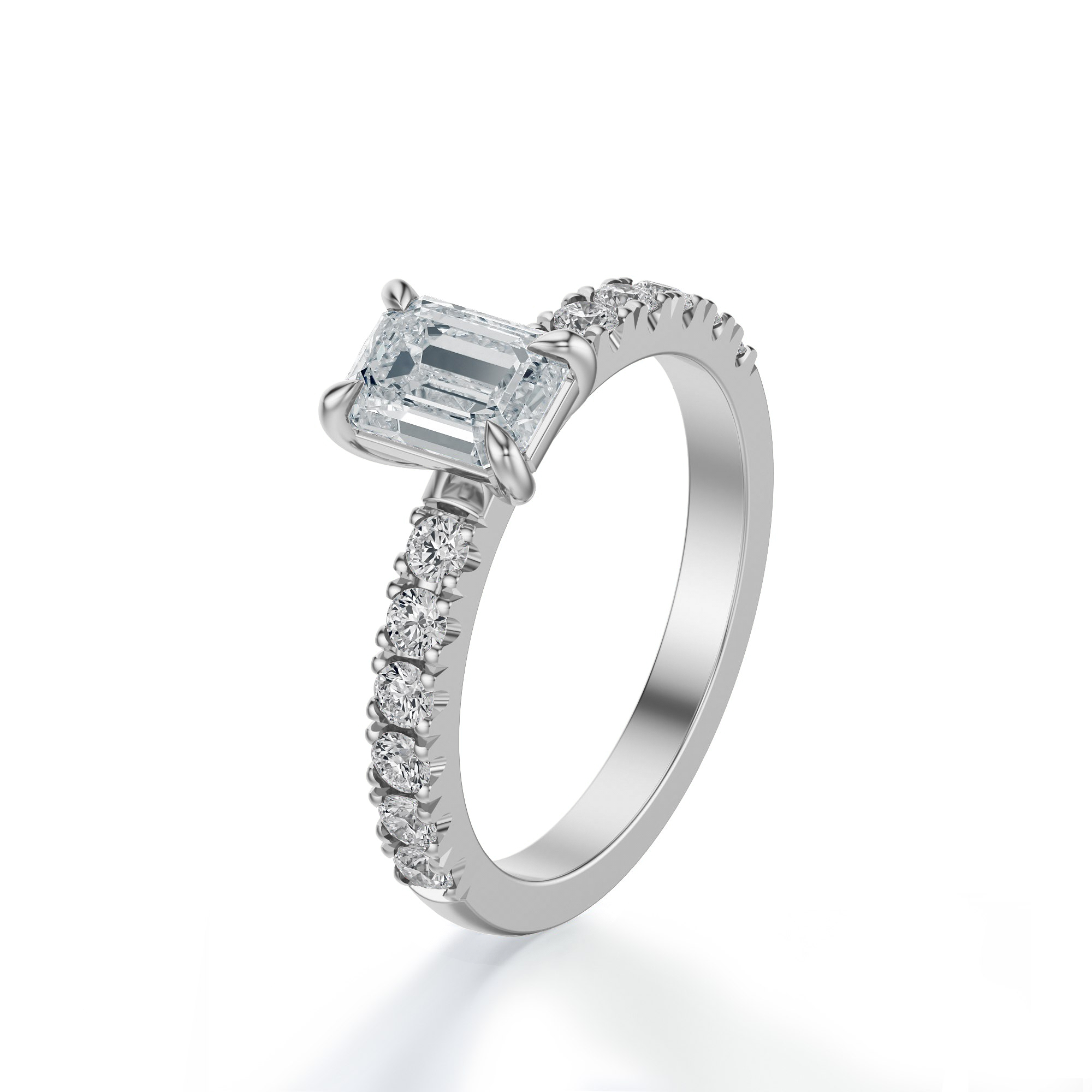 Subtelny luksus i nowoczesna elegancja łączą się w tym pierścionku zaręczynowym wykonanym z najwyższej jakości białego złota, którego chłodna, srebrzysta barwa perfekcyjnie kontrastuje z blaskiem diamentów. Centralnym punktem jest imponujący diament w szlifie szmaragdowym, wyróżniający się prostokątnym kształtem i delikatnie ściętymi narożnikami. Jego duże, płaskie tafle odbijają światło w sposób elegancki i subtelny, tworząc efekt głębi i wyrafinowanego blasku.