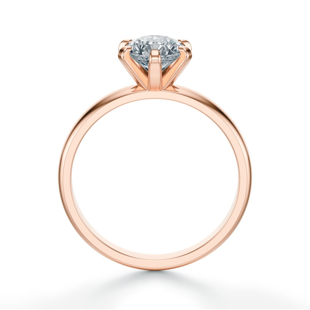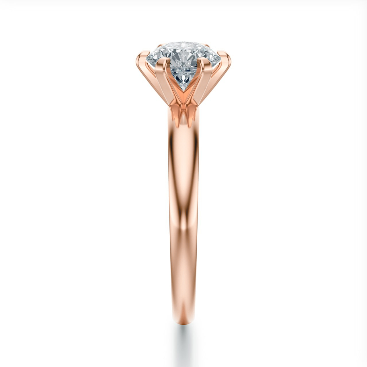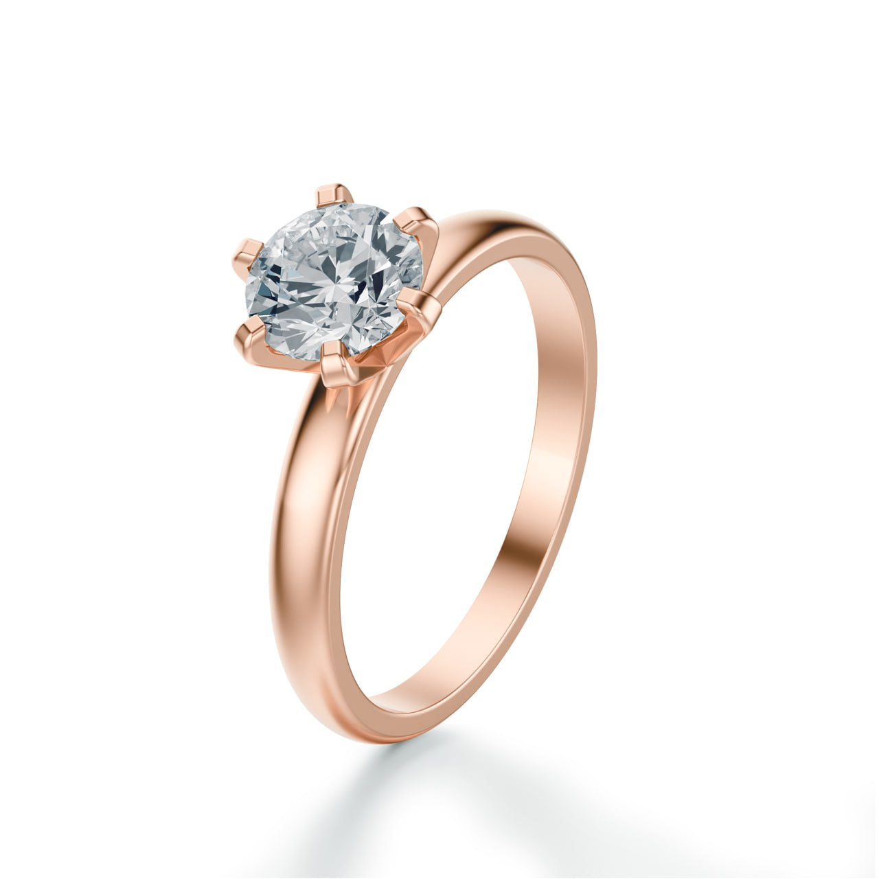 Centralny diament o brylantowym szlifie został osadzony w klasycznej sześcioramiennej oprawie, która pięknie eksponuje jego krystaliczną czystość. Delikatna obrączka z różowego złota subtelnie otula kamień, nadając całości ciepła i niezwykle kobiecego charakteru. Diament unosi się nad nią niczym świetlista kropla, pozwalając światłu swobodnie wnikać w fasety i odbijać się w postaci intensywnych, migoczących refleksów.