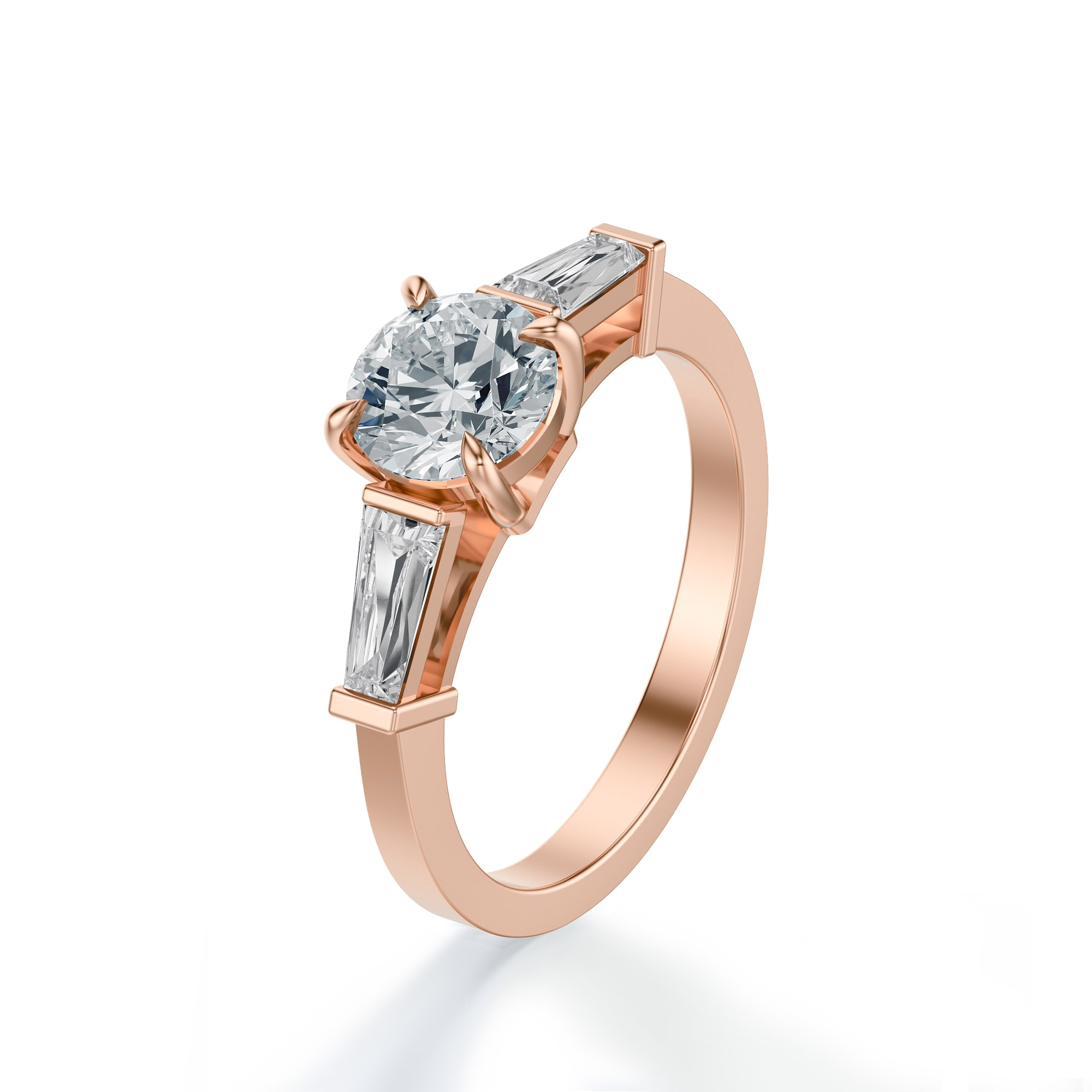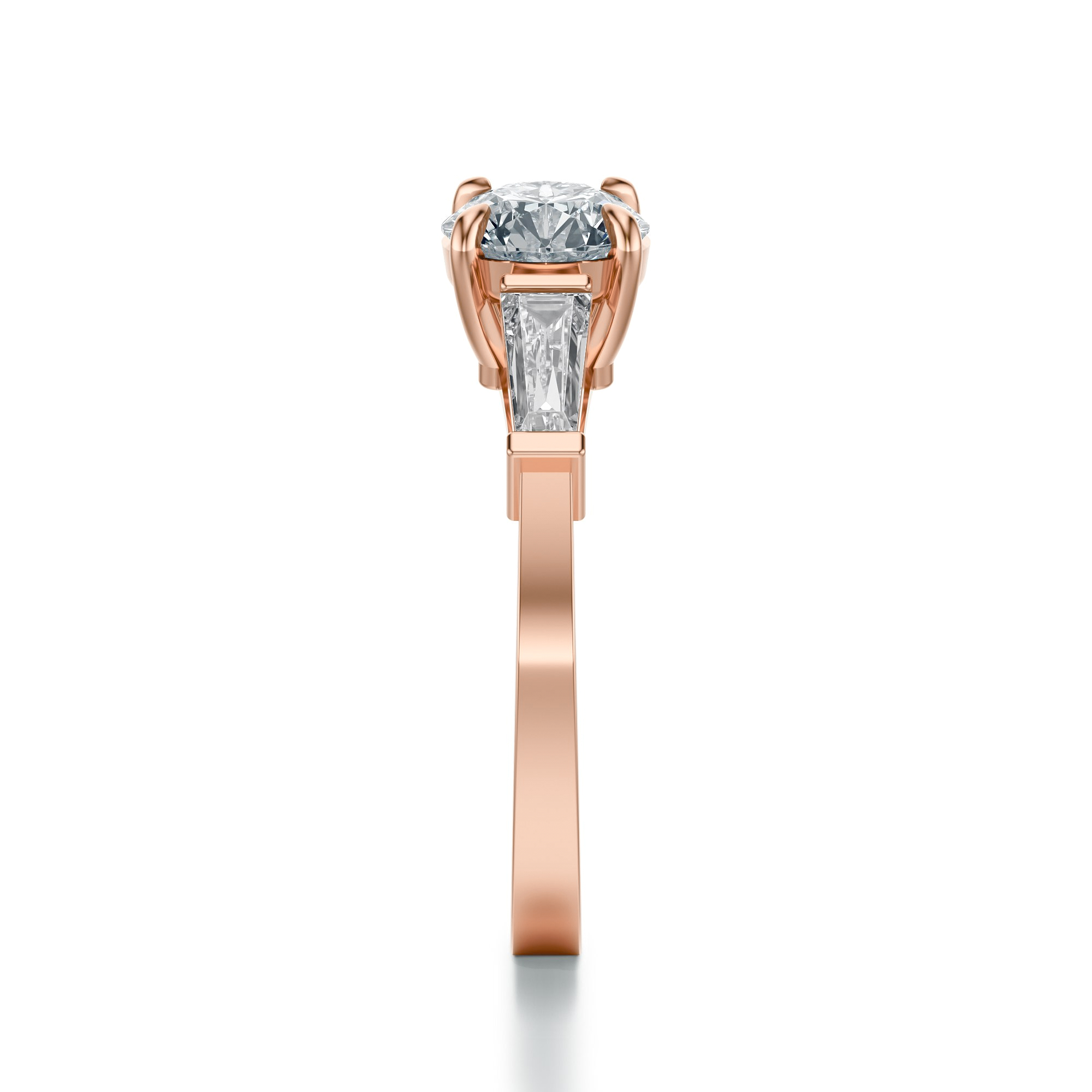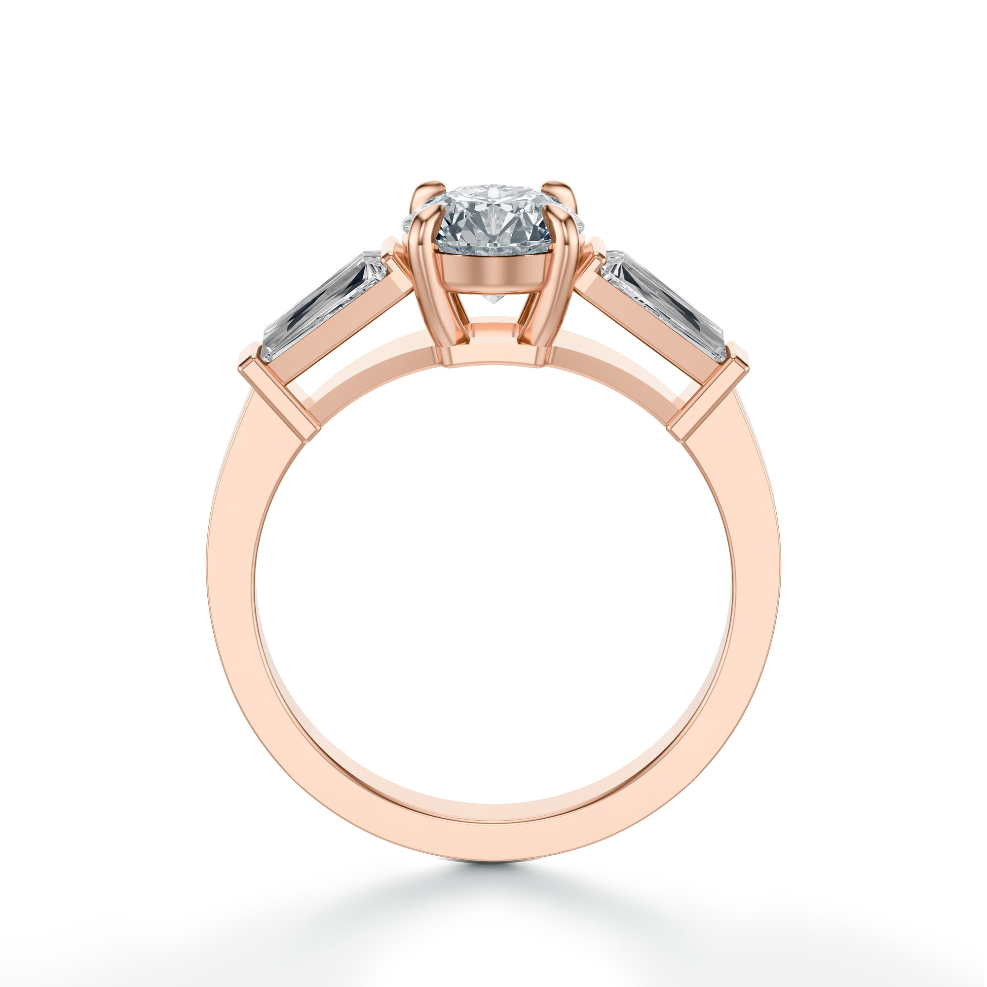 Po obu stronach centralnego diamentu umieszczono diamenty boczne w szlifie bagietka. Ich geometryczny, smukły kształt nadaje pierścionkowi nowoczesnego charakteru, a jednocześnie podkreśla centralny kamień, optycznie wydłużając obrączkę. To połączenie klasycznego okrągłego diamentu i eleganckich, bocznych kamieni w szlifie bagietka tworzy harmonijną i przyciągającą wzrok kompozycję, która emanuje luksusem i precyzją wykonania.