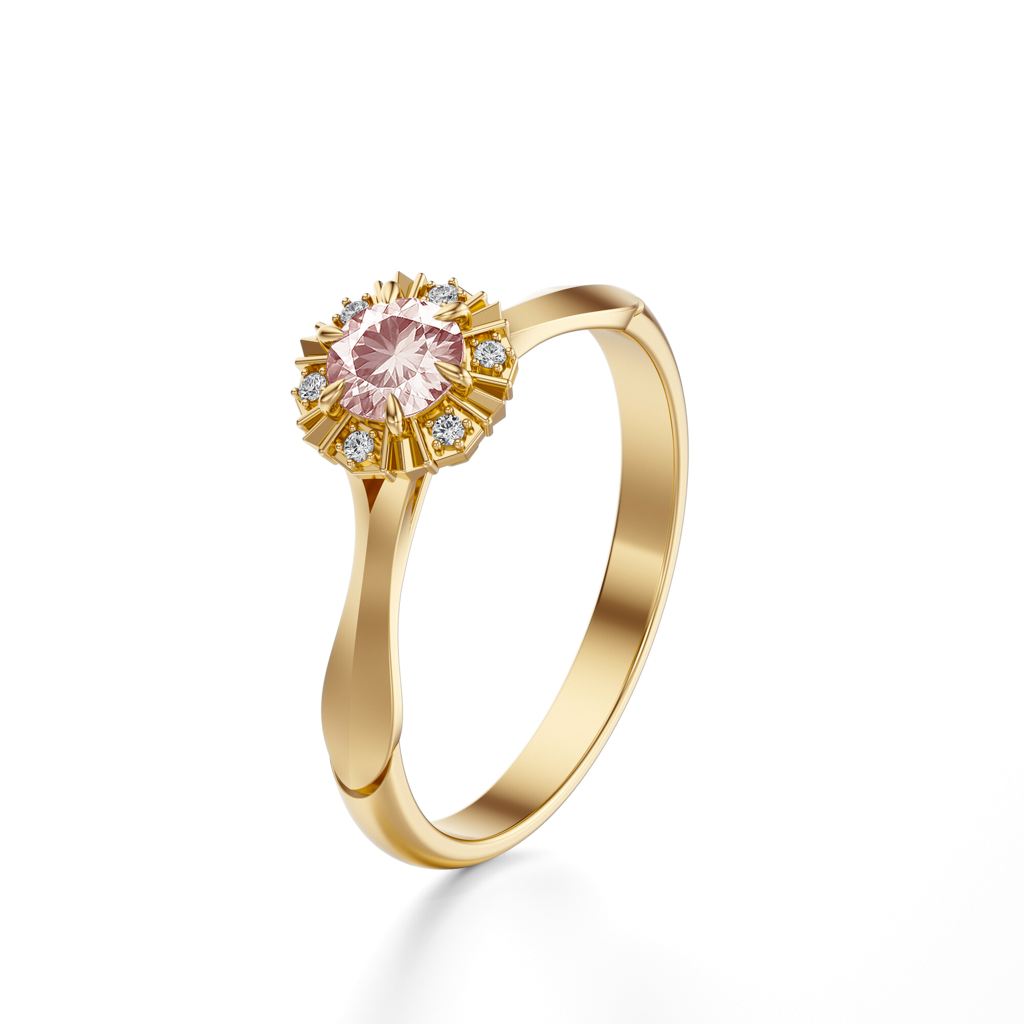 Ten wyjątkowy pierścionek emanuje romantyzmem i subtelną elegancją, którą podkreśla blask morganitu osadzonego w żółtym złocie próby 585. Delikatny, różowo-brzoskwiniowy odcień centralnego kamienia tworzy niezwykle harmonijną kompozycję z ciepłym odcieniem złota i połyskiem drobnych diamentów. To biżuteria pełna kobiecego wdzięku i świetlistości, która przyciąga spojrzenia i wzbudza zachwyt.