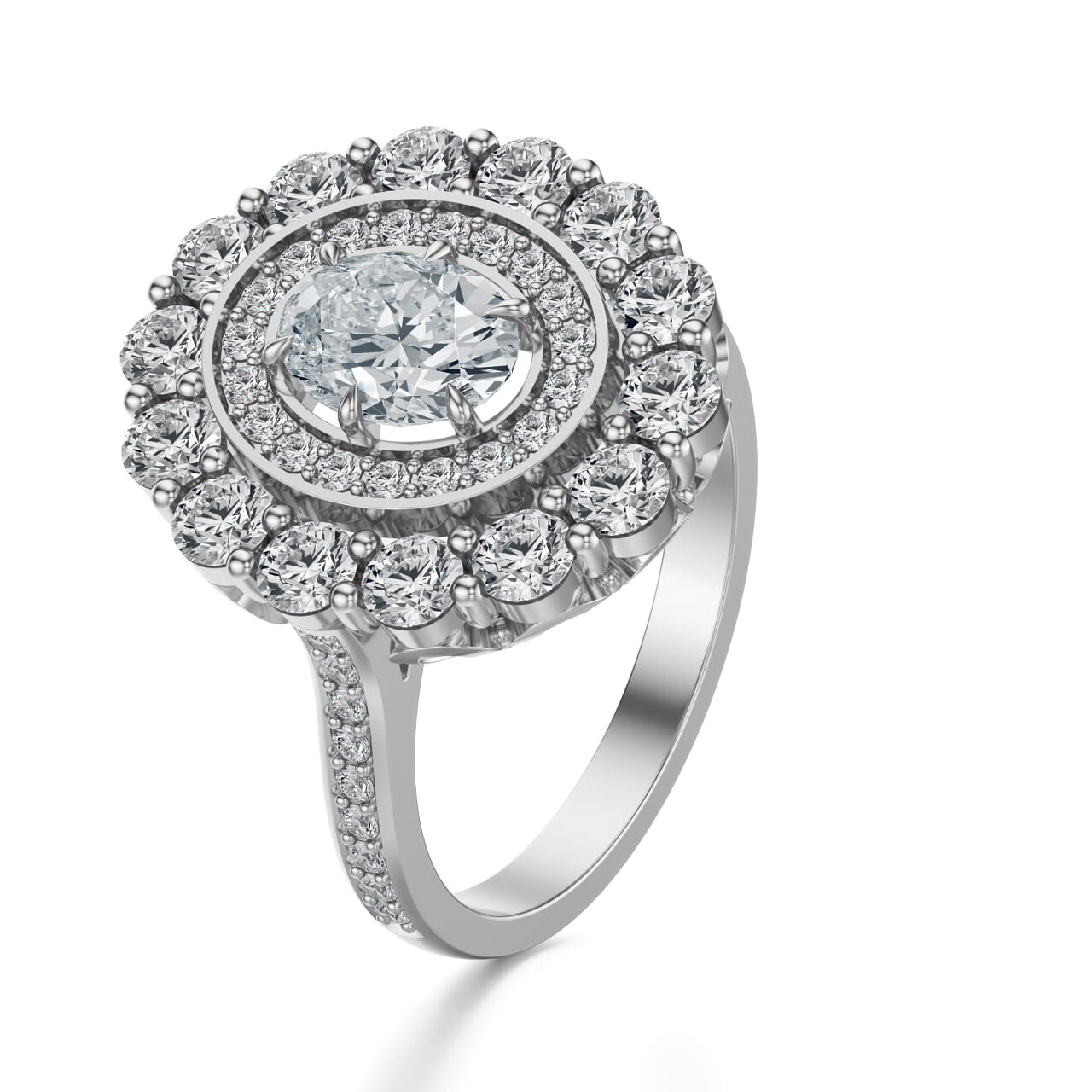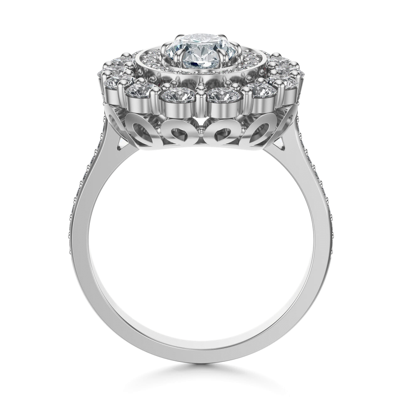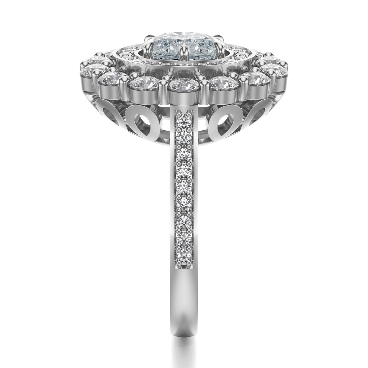Brylantowy szlif centralnego kamienia oraz otaczających go diamentów sprawia, że każdy ruch dłoni wywołuje efekt iskrzącej się korony światła. To kompozycja, która łączy w sobie majestat i romantyzm, czyniąc pierścionek dziełem sztuki jubilerskiej.
