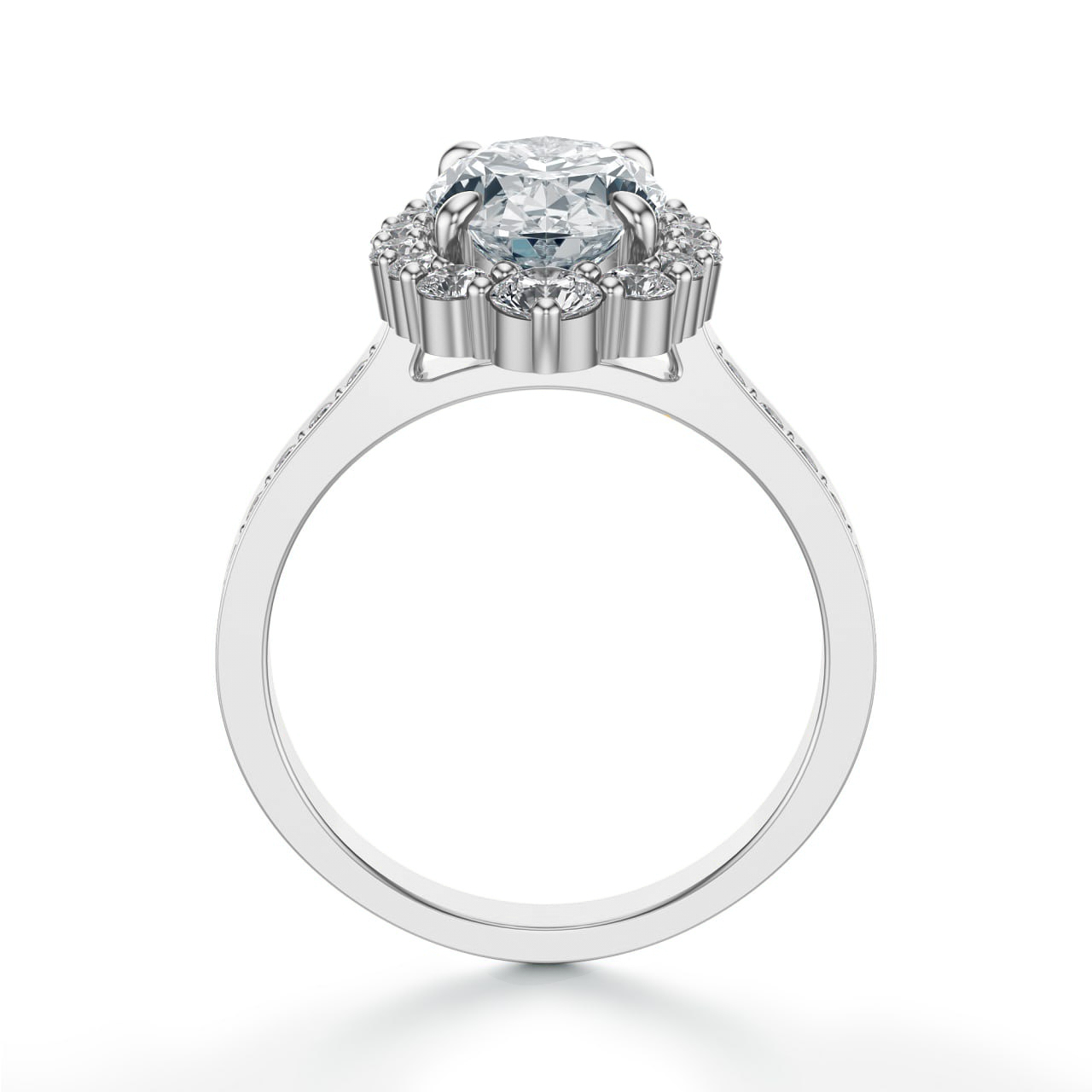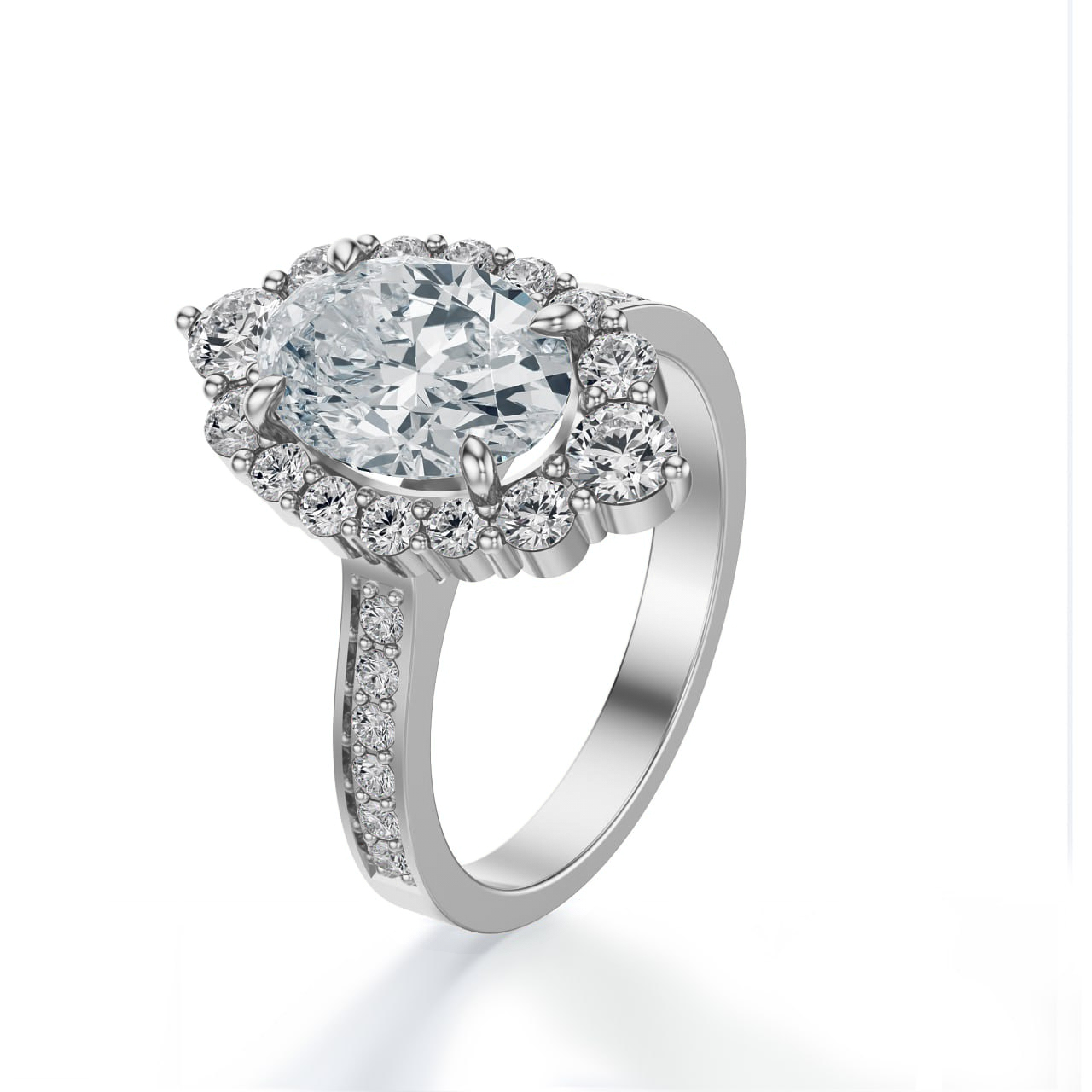 Ten olśniewający pierścionek to prawdziwa kwintesencja luksusu i kobiecego blasku. Wykonany z białego złota próby 585, przyciąga spojrzenia imponującym centralnym diamentem w szlifie owalnym, otoczonym wieńcem mniejszych brylantów, które dodatkowo potęgują jego świetlistość. Obrączka, zdobiona rzędem drobnych kamieni, nadaje całości niezwykłej harmonii i pełni blasku.