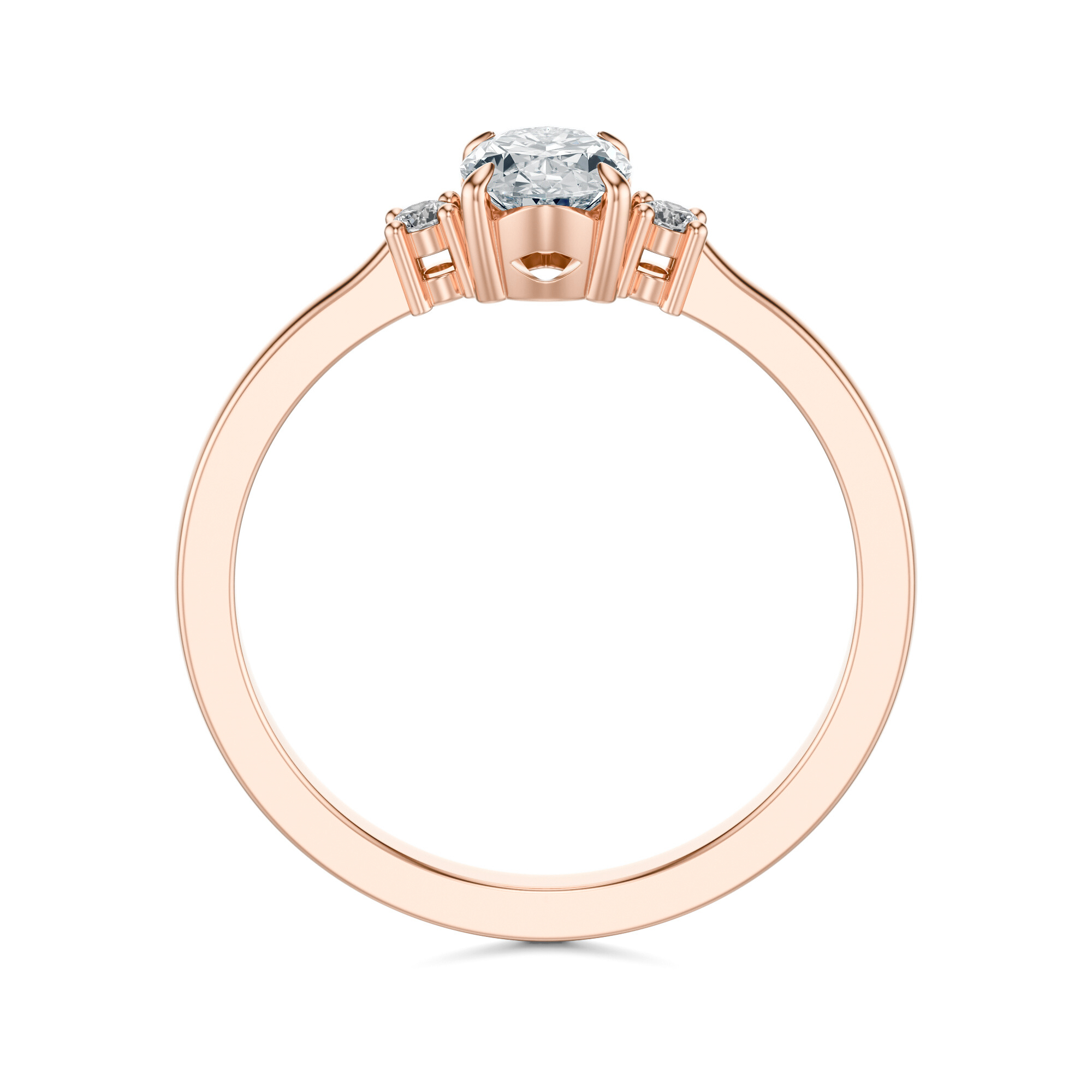 Centralny owalny diament, pełen świetlistych refleksów, stanowi serce całej kompozycji. Jego fasety rozpraszają światło w wyjątkowy sposób, tworząc efekt migoczącej tafli, która zmienia się wraz z każdym ruchem dłoni. Po obu stronach kamienia osadzono dwa mniejsze diamenty, dodając całości subtelnego blasku i eleganckiej symetrii. To trio tworzy kompozycję pełną harmonii wyważoną, a jednocześnie niezwykle efektowną.
