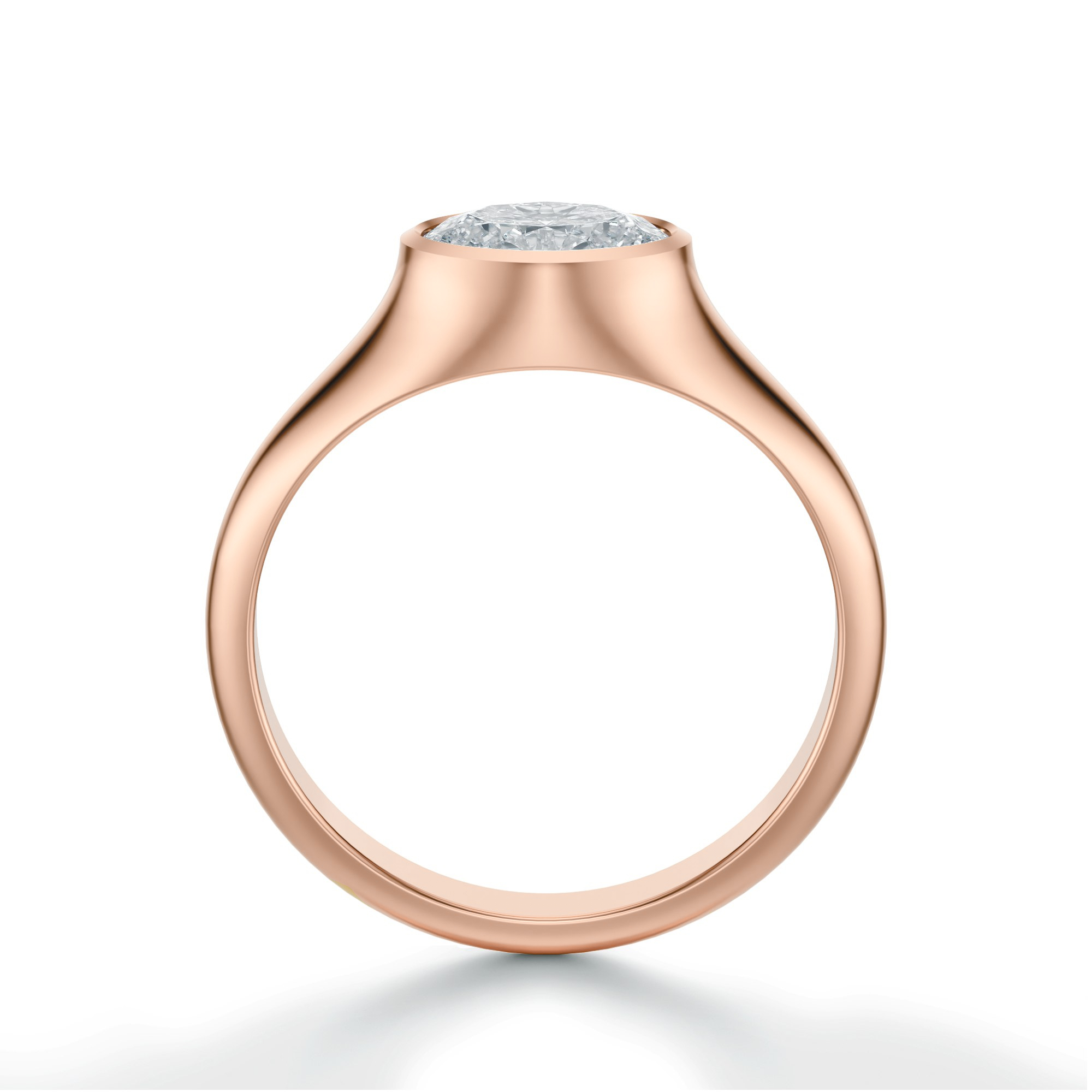 Ten pierścionek zachwyca nowoczesną, a jednocześnie ponadczasową formą, w której centralną rolę odgrywa imponujący diament osadzony w pełnej oprawie typu bezel. Gładka, otaczająca kamień rama z różowego złota subtelnie podkreśla jego kształt oraz potęguje efekt wizualnej czystości i harmonii. Dzięki takiej konstrukcji diament jest nie tylko doskonale wyeksponowany, ale również odpowiednio zabezpieczony, co zwiększa trwałość i komfort codziennego noszenia.