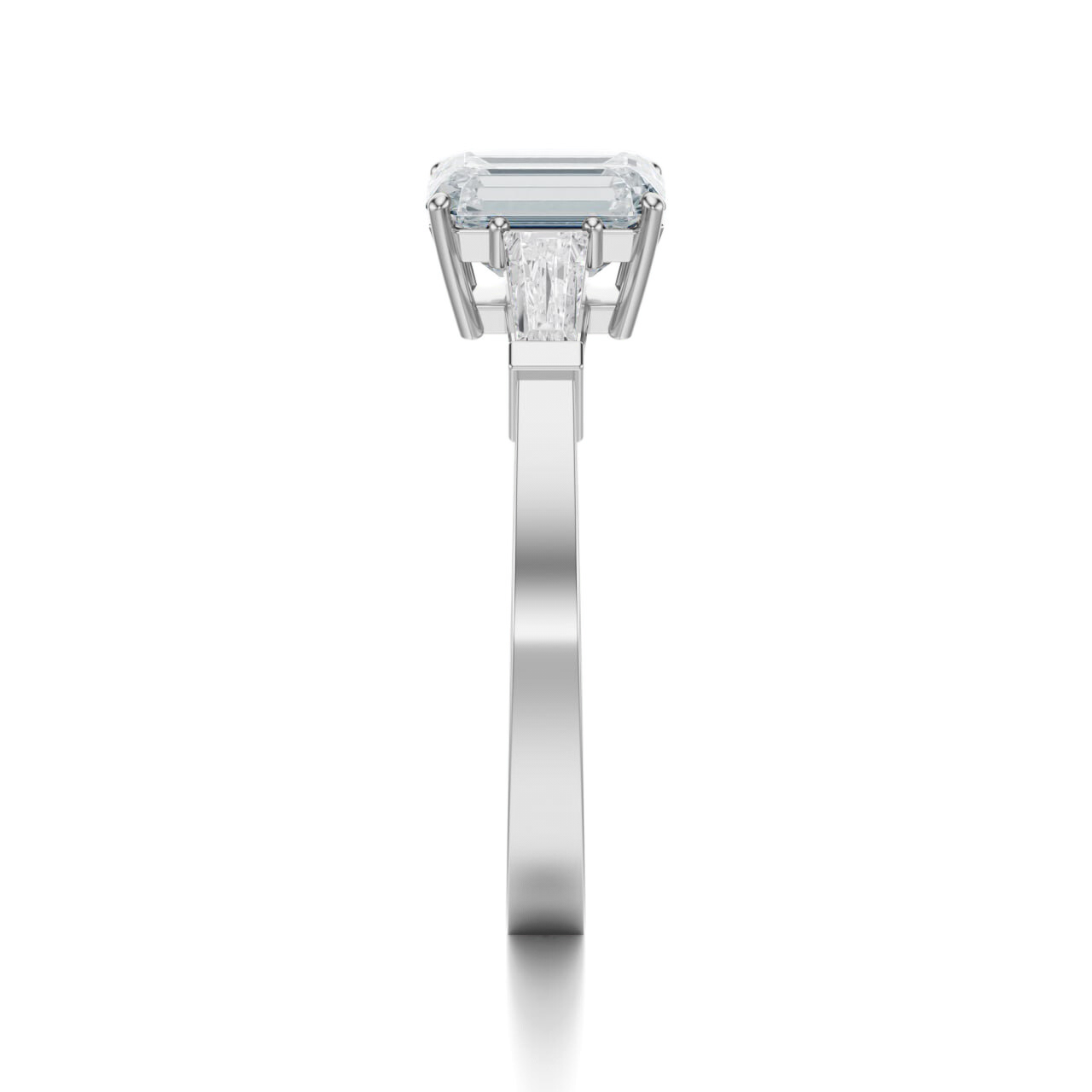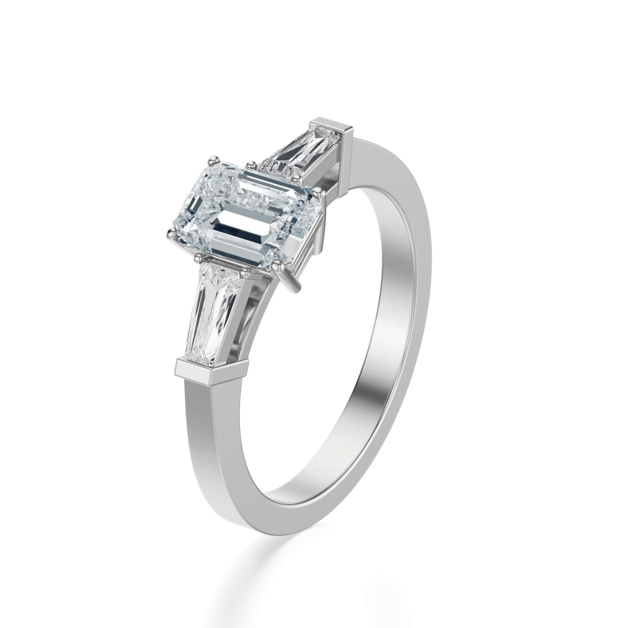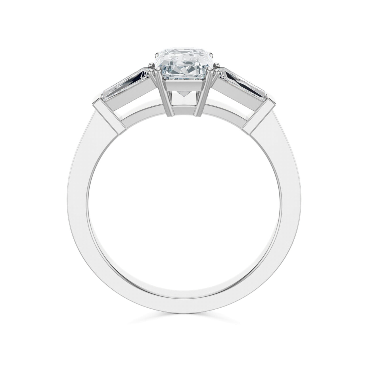 Po bokach osadzono dwa diamenty o wydłużonym szlifie, które tworzą idealne dopełnienie głównego klejnotu. Ich forma sprawia, że pierścionek zyskuje elegancką, wyrazistą symetrię, a cała kompozycja nabiera lekkości i nowoczesnej finezji. To harmonijne trio symbolizuje równowagę, przeszłość, teraźniejszość i przyszłość splecione w jednym błyszczącym geście.