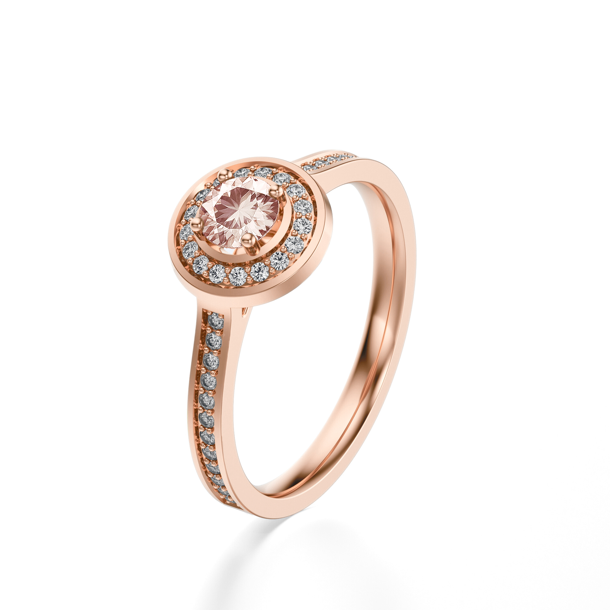 Pierścionek zaręczynowy z morganitem w różowym złocie z diamentową oprawą halo