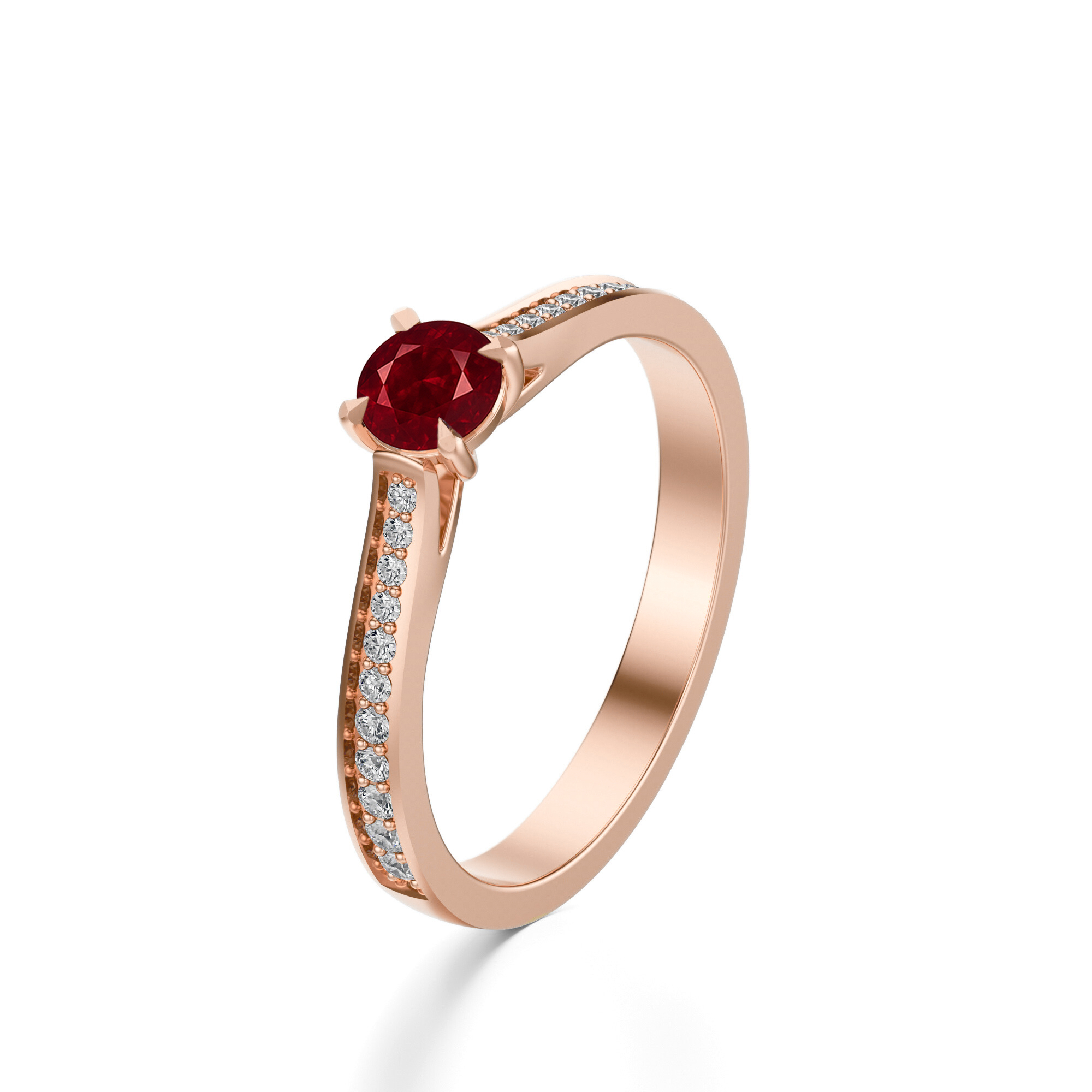 Centralny rubin o masie 0,50 ct. w szlifie brylantowym urzeka głębią czerwieni i wyjątkową grą światła. Dzięki otaczającym go diamentom pierścionek mieni się przy każdym ruchu dłoni, nadając całości niezwykle luksusowego charakteru.