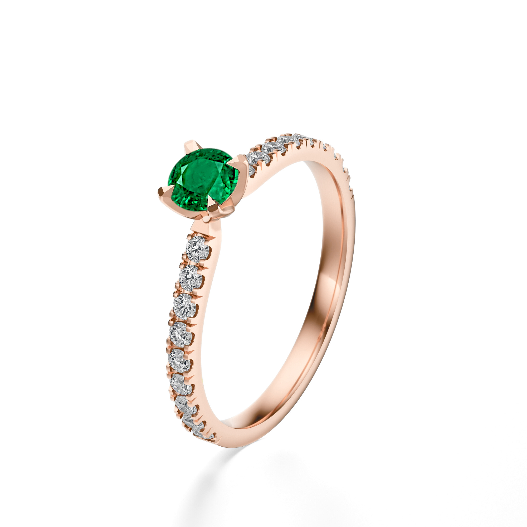 Szmaragd, uznawany za kamień miłości i harmonii, został osadzony w czterech łapkach, które wydobywają jego naturalne piękno i pozwalają światłu w pełni przenikać przez kamień. Subtelne diamenty w szlifie brylantowym, zdobiące obrączkę na całej jej długości, tworzą efekt lśniącej tafli i nadają całości niepowtarzalnego blasku. To połączenie sprawia, że pierścionek zachwyca zarówno klasycznym wdziękiem, jak i nowoczesną lekkością.