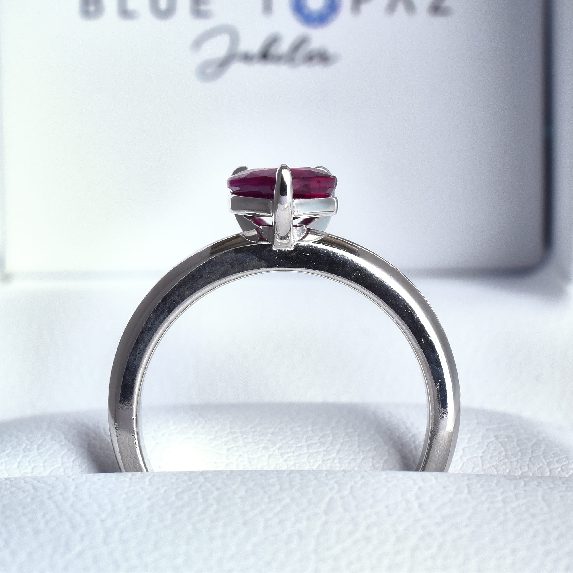 Rubin od wieków uznawany jest za kamień miłości i pasji. Jego ognista barwa symbolizuje ciepło uczuć, energię i odwagę w wyrażaniu emocji. To klejnot, który wzmacnia więź między dwojgiem ludzi i przypomina, że prawdziwa miłość nie traci blasku z upływem czasu. W połączeniu z chłodnym tonem białego złota tworzy kompozycję pełną kontrastu i równowagi – delikatną, a zarazem pełną siły.
