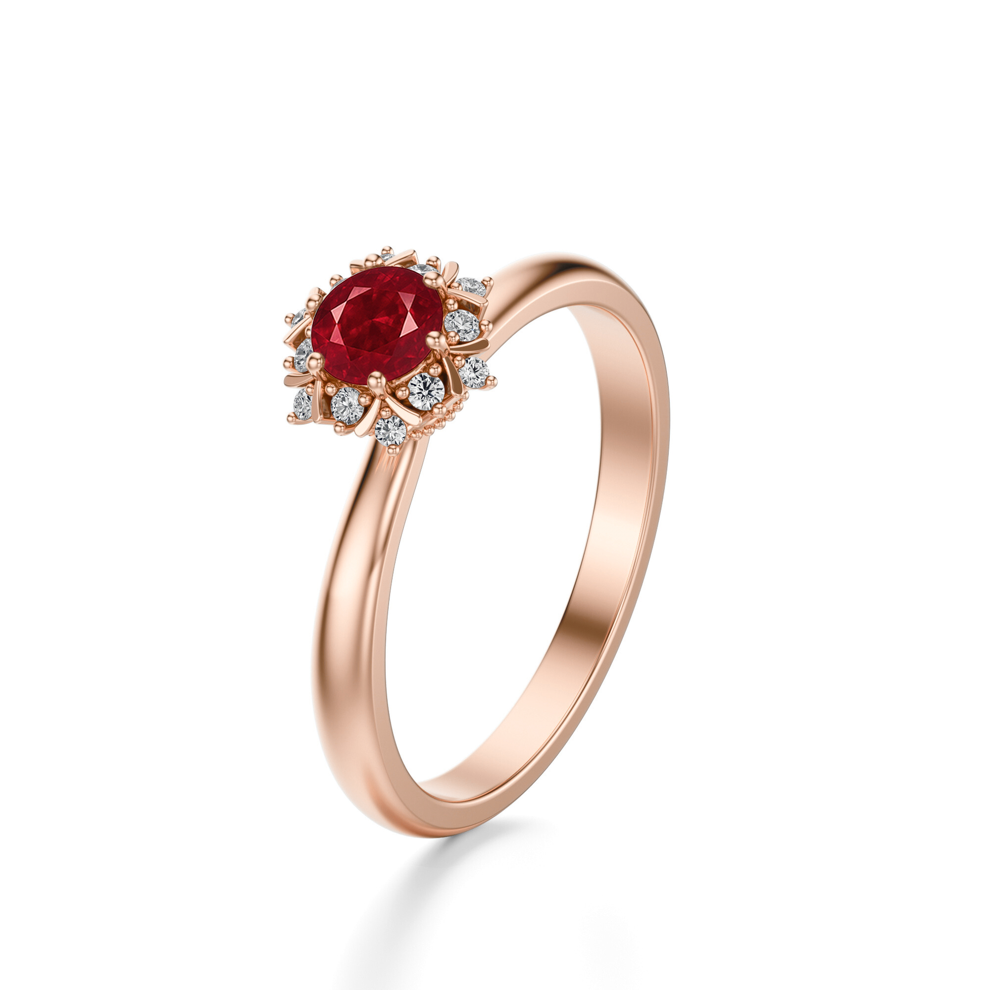 Design pierścionka nawiązuje do klasycznych form, lecz dzięki kwiatowej aranżacji diamentów nabiera świeżości i lekkości. Rubin otoczony iskrzącą oprawą przypomina rozwijający się kwiat, co czyni całość niezwykle kobiecą i delikatną. Smukła obrączka z różowego złota dodatkowo podkreśla subtelny charakter pierścionka, nadając mu eleganckiej lekkości.