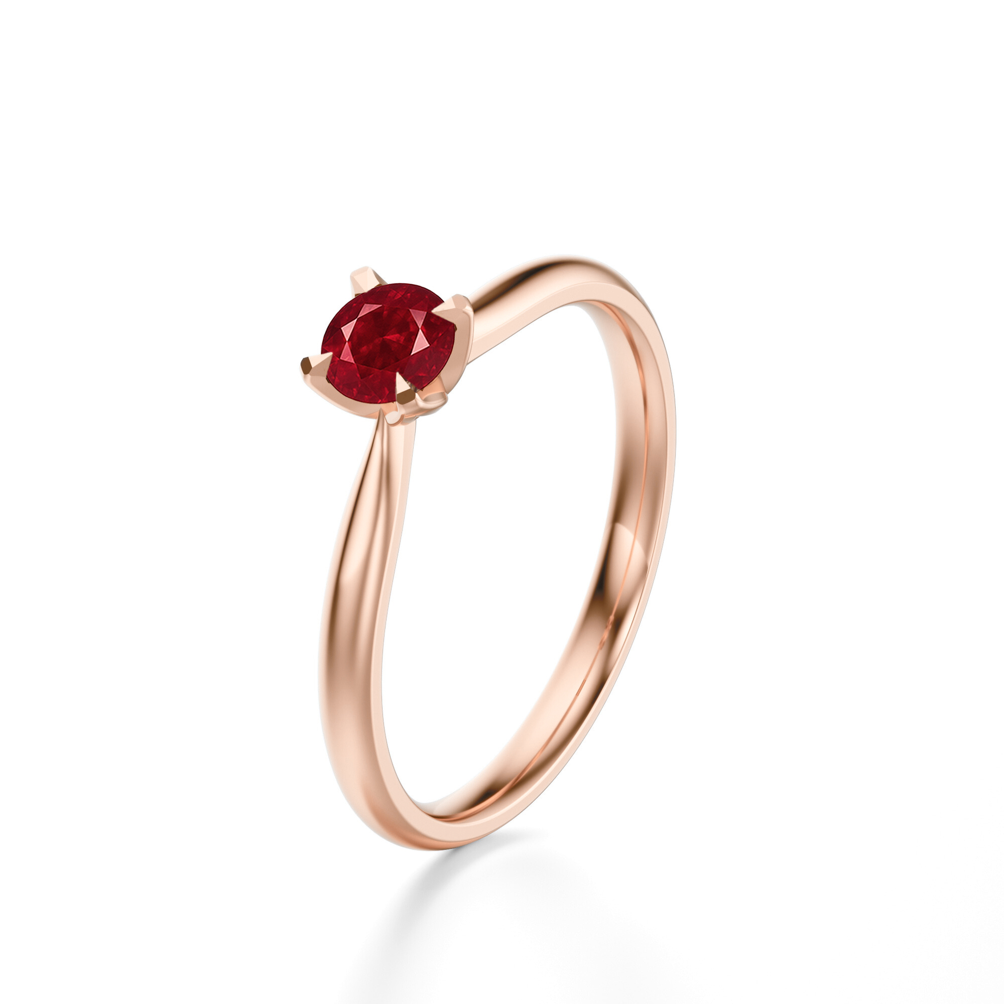 Centralny rubin, osadzony w czterech łapkach, przyciąga wzrok swoim kolorem i idealnie komponuje się z nowoczesną formą pierścionka. Delikatnie skręcona szyna dodaje lekkości i elegancji, tworząc harmonijną oprawę dla kamienia i podkreślając jego naturalny blask.