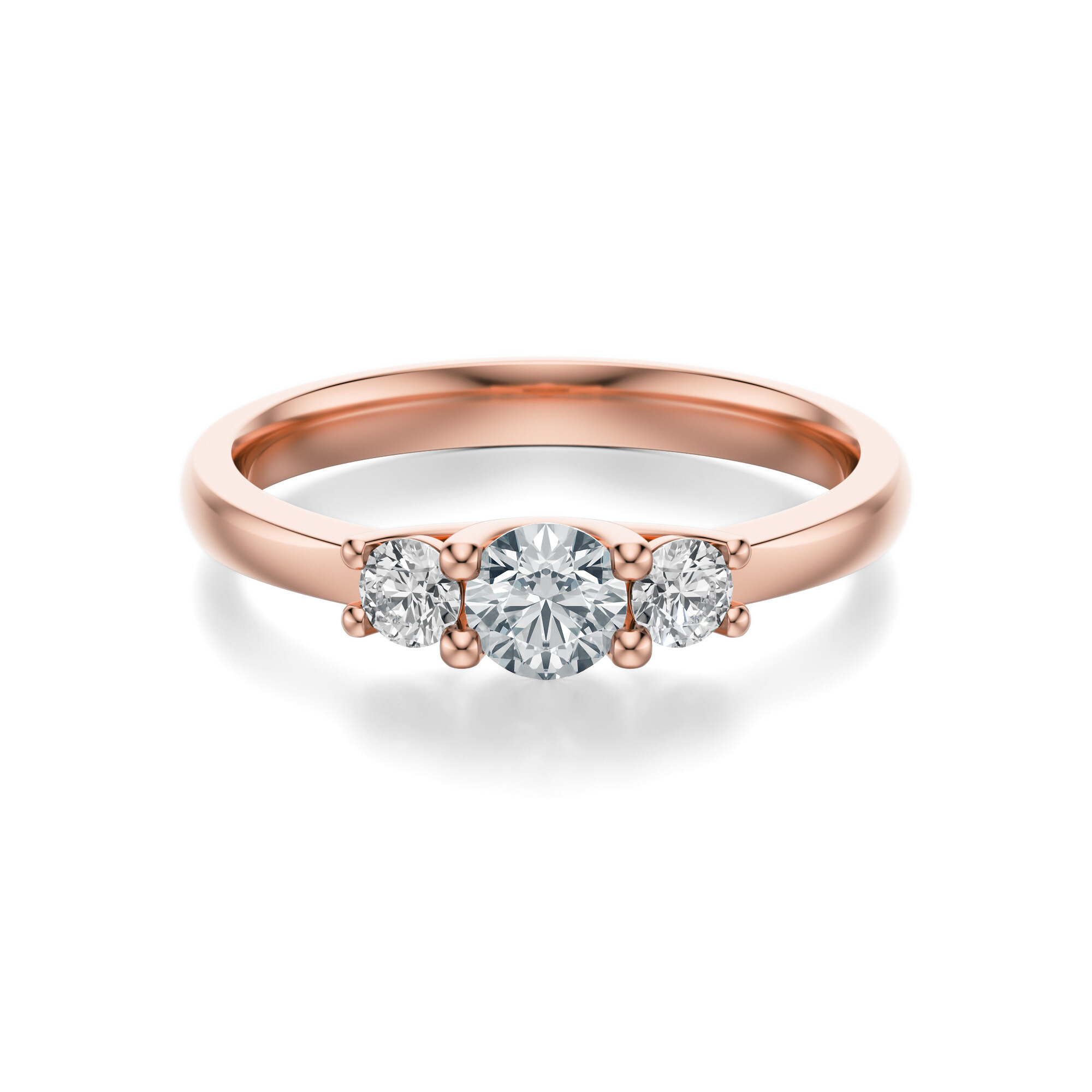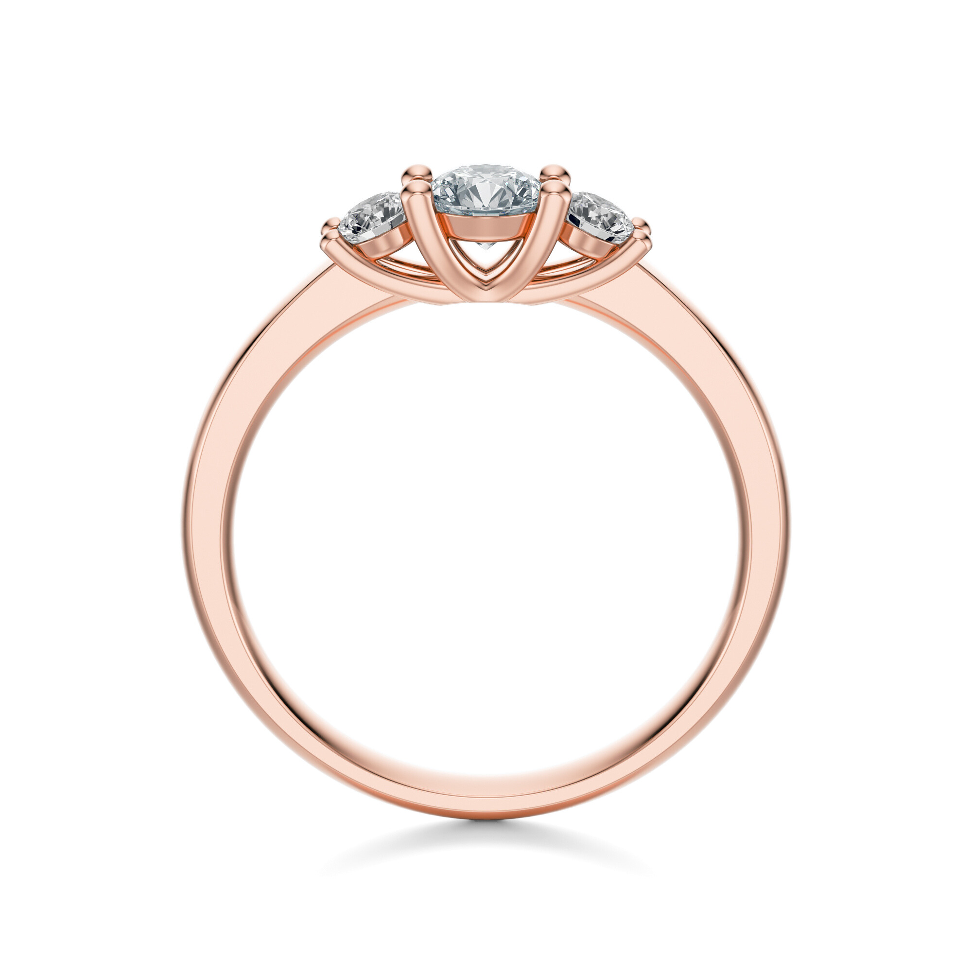 Ten wyjątkowy pierścionek wykonany został z różowego złota próby 585, które zachwyca subtelnym, romantycznym odcieniem. Jego ciepła barwa doskonale komponuje się z blaskiem trzech diamentów w szlifie brylantowym, nadając całości elegancji i niepowtarzalnego uroku. Centralny kamień, większy i bardziej wyrazisty, został otoczony przez dwa mniejsze, tworząc harmonijną i symboliczną kompozycję.