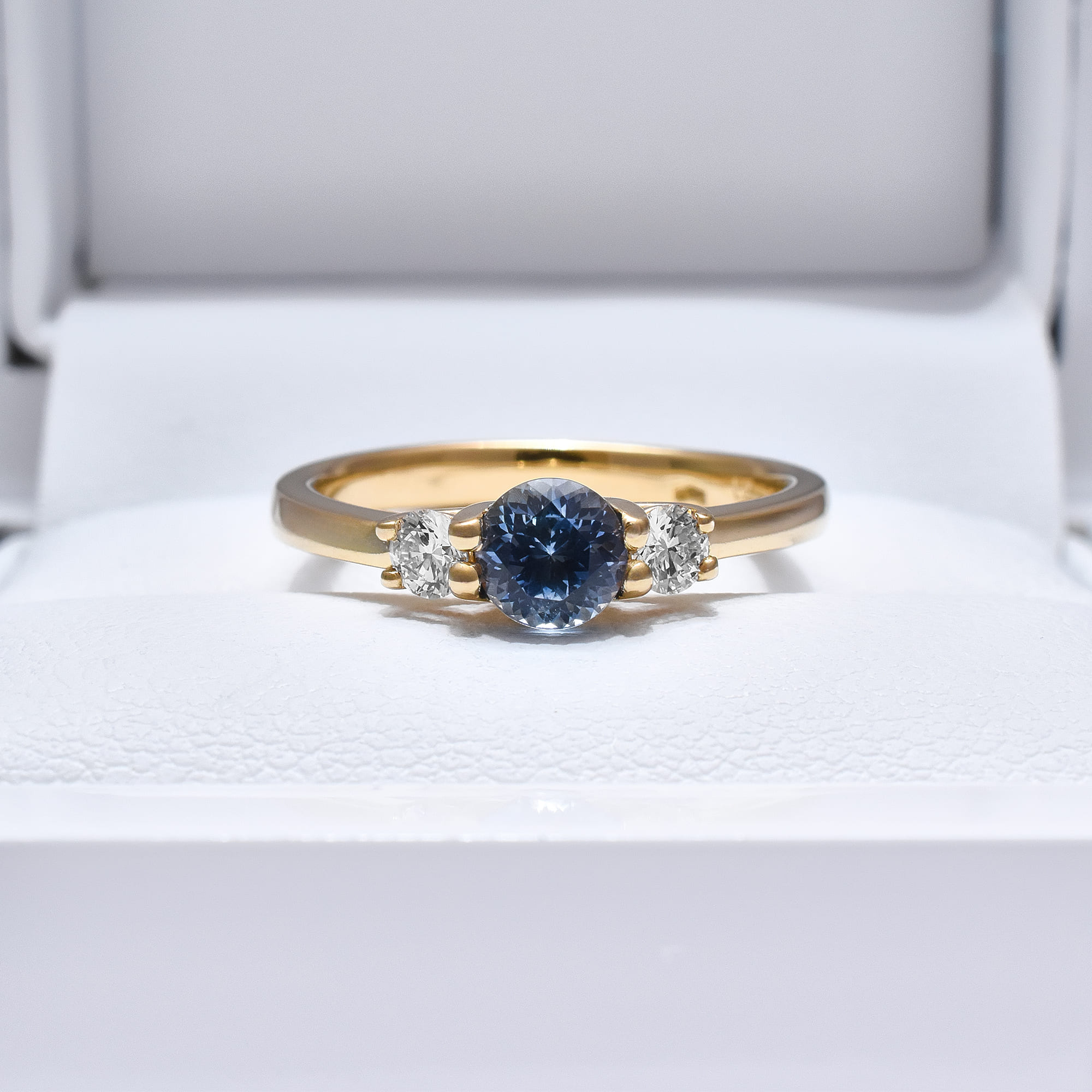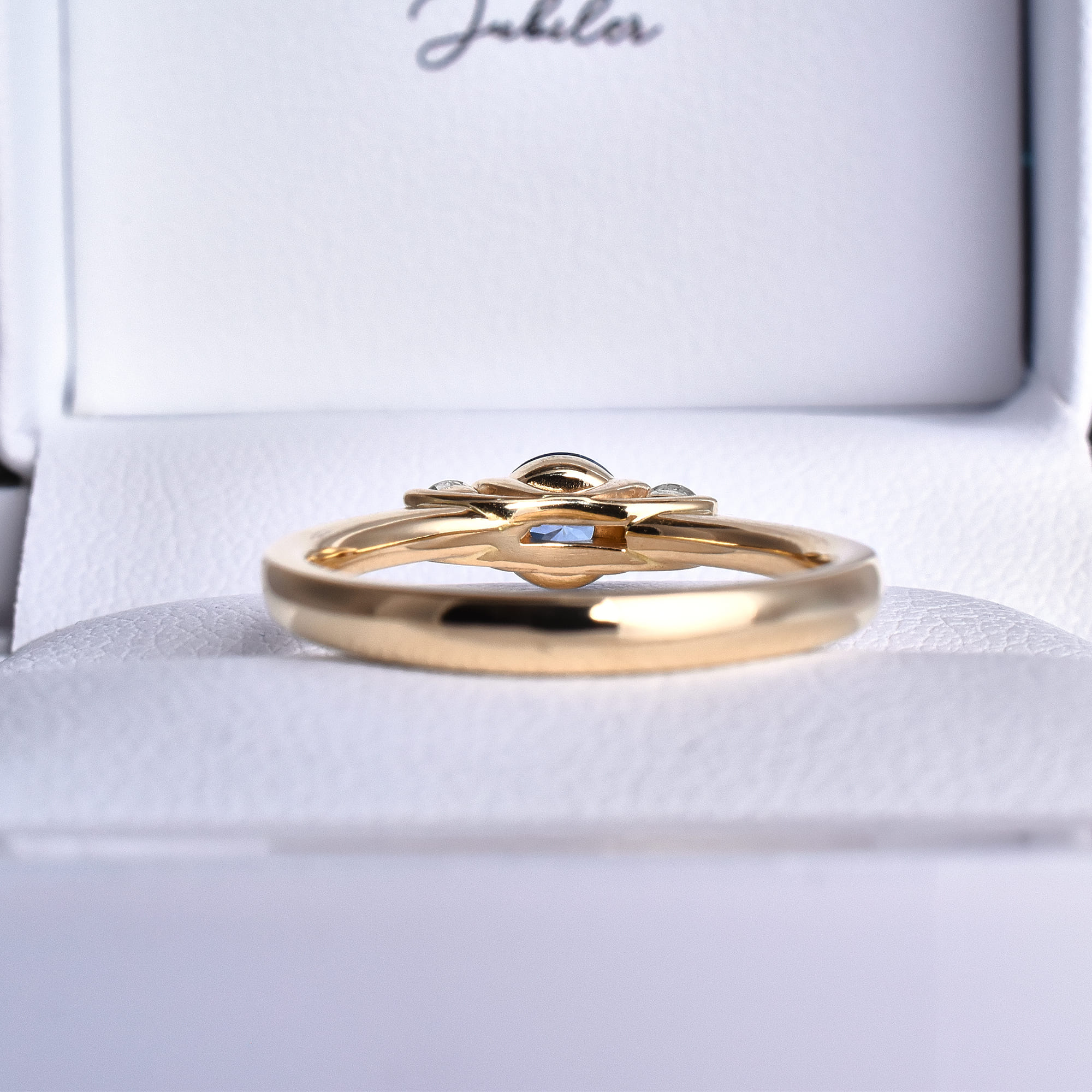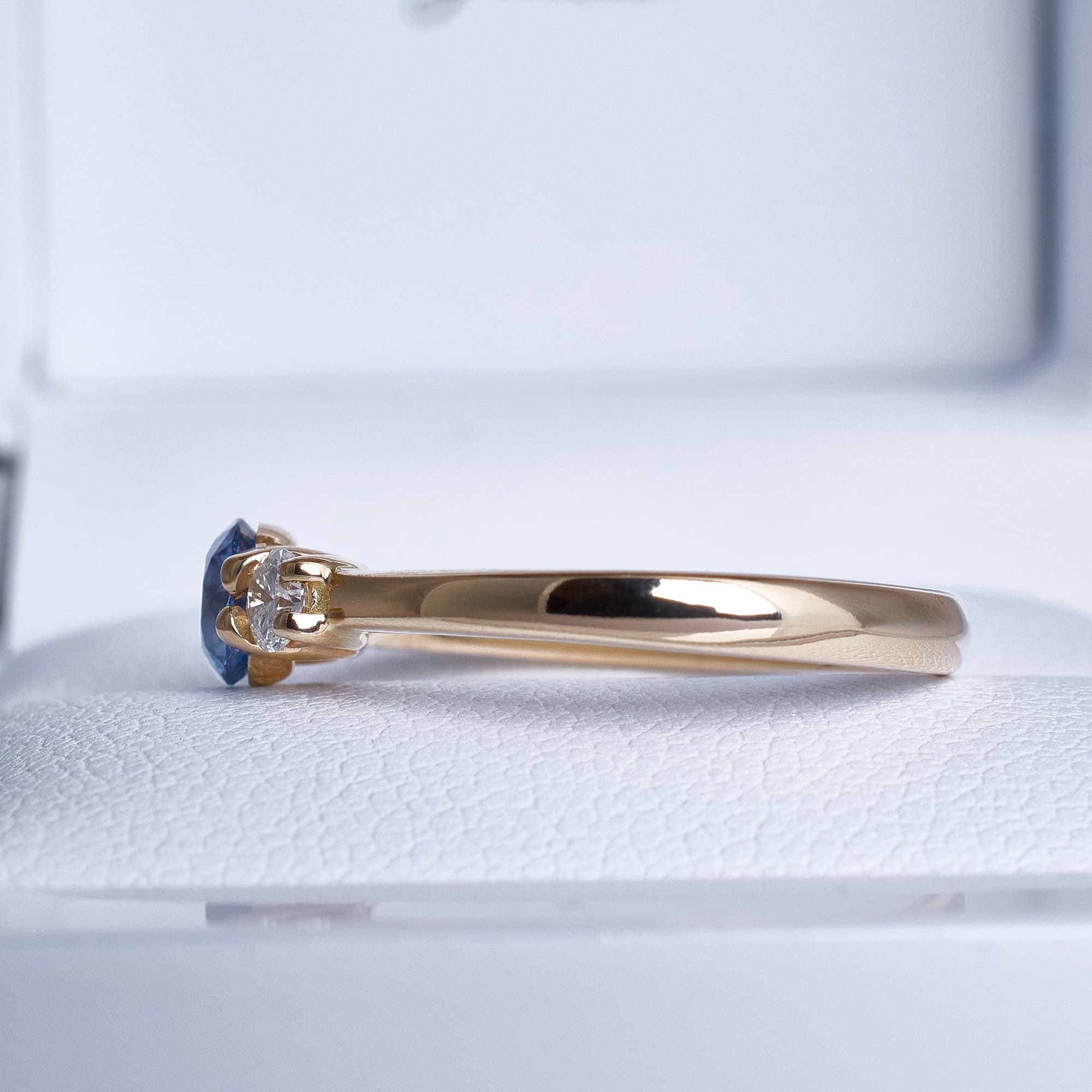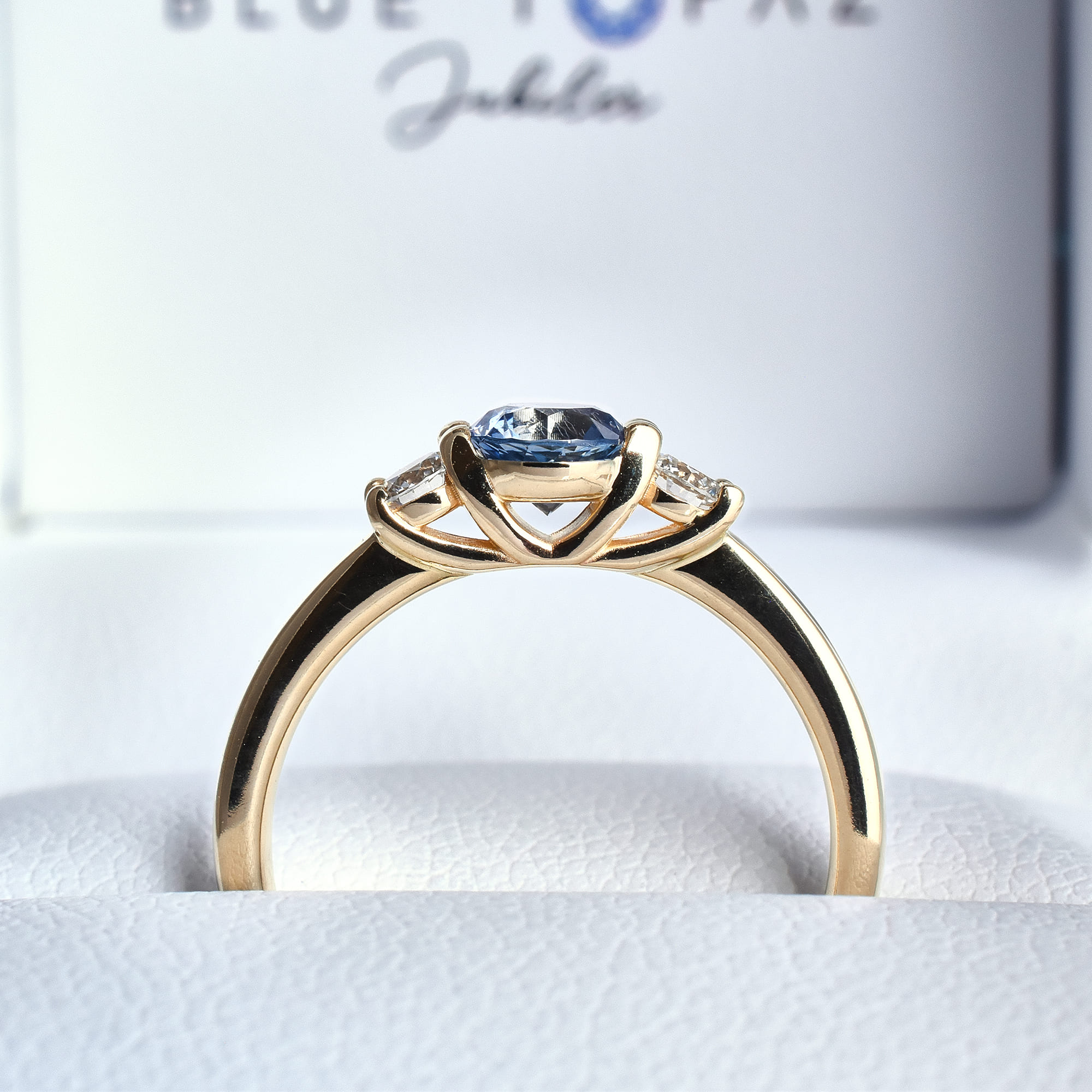 Pierścionek zaręczynowy z szafirem i diamentami to symbol klasy, elegancji i uczuć, które przetrwają próbę czasu. Wykonany z żółtego złota, roztacza ciepły blask, doskonale komponując się z chłodnym, niebieskim tonem szafiru. Jego ponadczasowa forma i wyważona kompozycja trzech kamieni tworzą harmonijną całość – subtelną, a zarazem olśniewającą. To biżuteria, która w jednej chwili potrafi uchwycić istotę miłości: trwałej, głębokiej i pełnej blasku.Centralny, okrągły szafir o fasetowanym szlifie zachwyca swoją intensywnością i głębią koloru. Jego świetlisty odcień, przywodzący na myśl spokojne niebo o zmierzchu, symbolizuje lojalność, mądrość i wewnętrzną harmonię. Po obu jego stronach lśnią dwa diamenty – czyste, pełne światła, stanowiące doskonały kontrapunkt dla barwy głównego kamienia. To klasyczny układ trzech kamieni, który w jubilerskim świecie ma szczególne znaczenie – przeszłość, teraźniejszość i przyszłość splecione w jednym, symbolicznym geście.