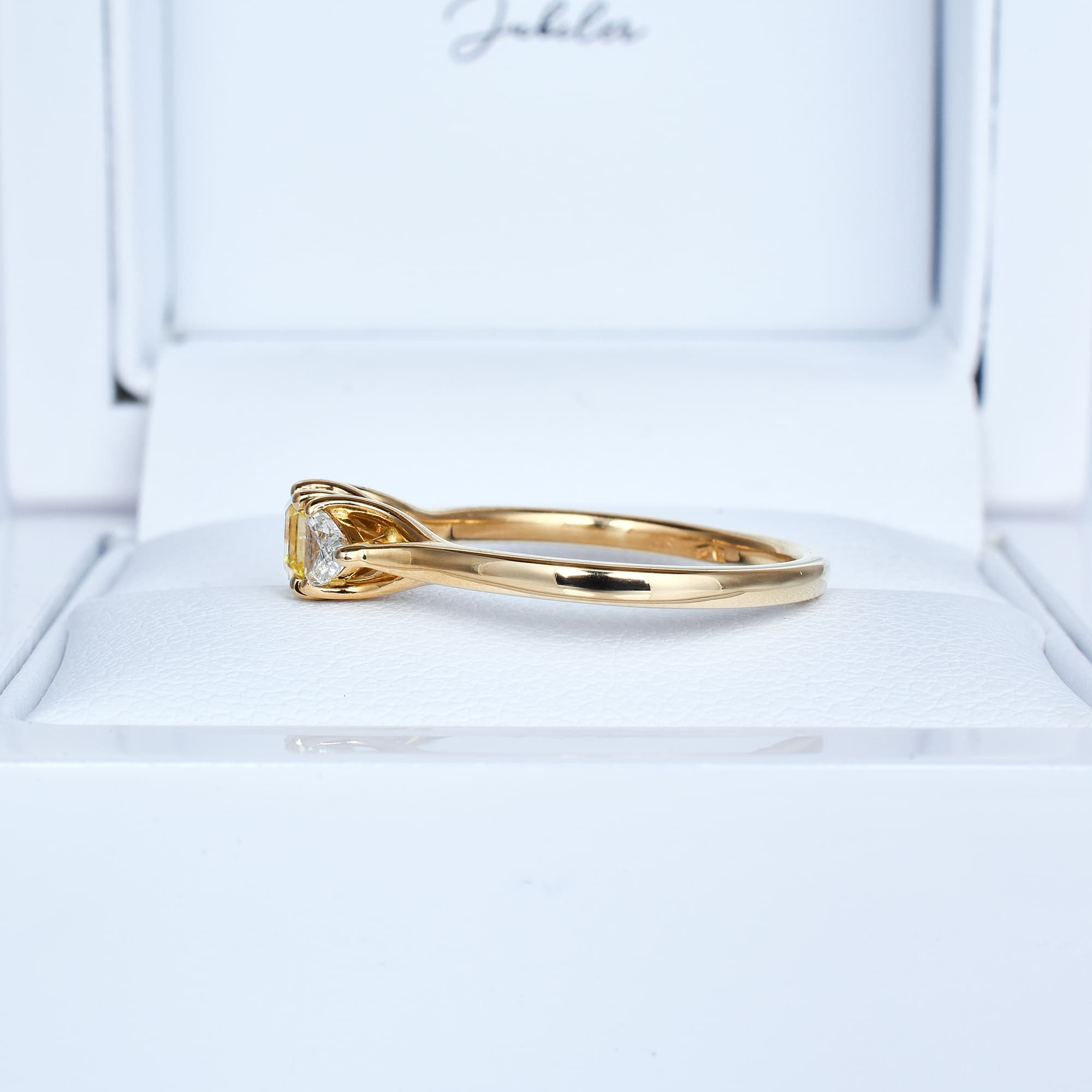 Całość osadzona została w żółtym złocie, które dodatkowo podkreśla słoneczny odcień diamentu i tworzy ponadczasową, luksusową oprawę. Smukła szyna i misternie zaprojektowana korona kamienia gwarantują lekkość, wygodę noszenia oraz niepowtarzalny styl.