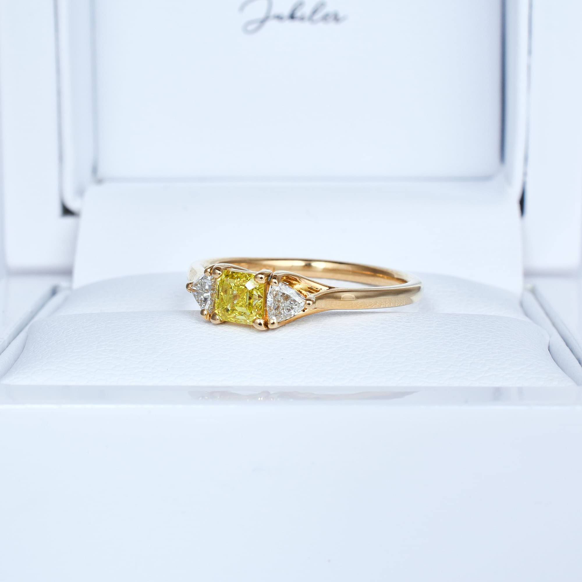 Ten niezwykły pierścionek to połączenie kunsztu jubilerskiego i jednego z najrzadszych klejnotów, naturalnego diamentu o barwie Fancy Vivid Yellow, uznawanej za najintensywniejszy i najbardziej pożądany odcień żółci w świecie kamieni szlachetnych.
