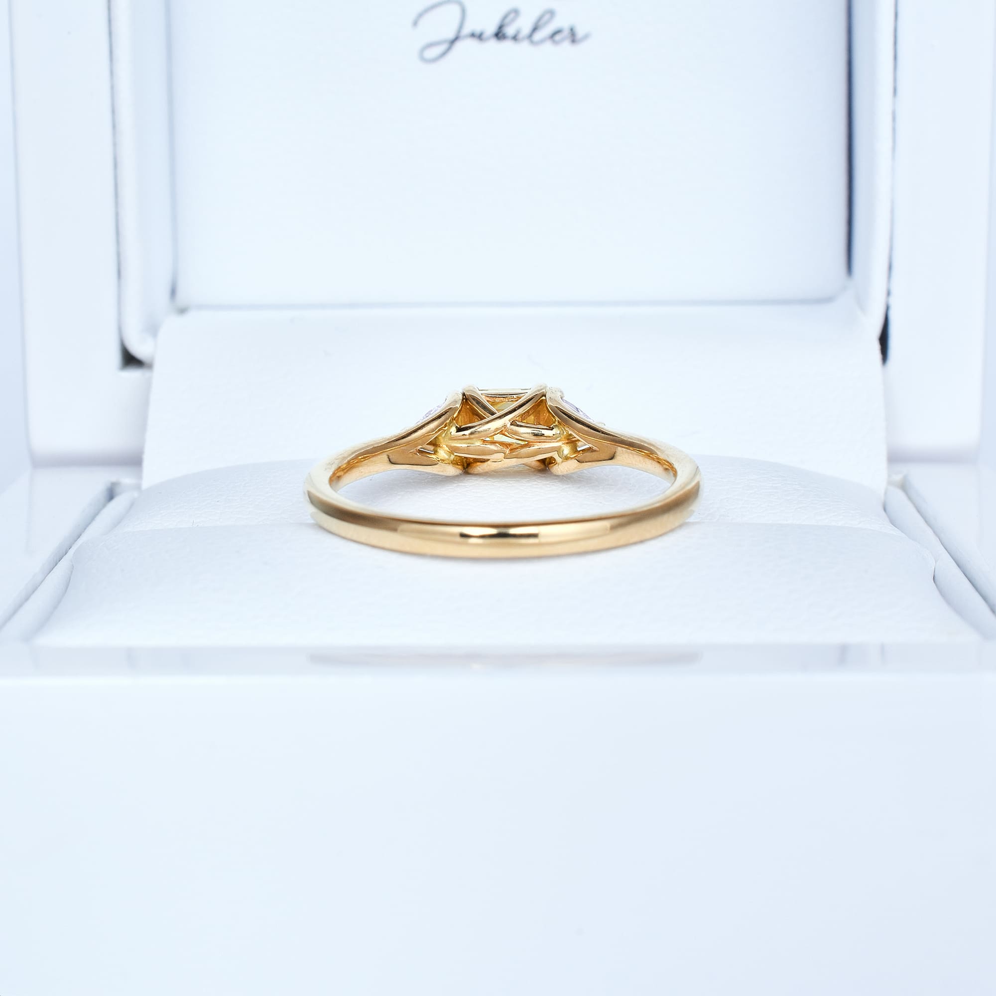 Po bokach umieszczono dwa diamenty w szlifie trillion, pełniące rolę kamieni akcentujących. Ich geometryczna forma i trójkątny kształt idealnie kontrastują z centralnym kamieniem, wzmacniając jego blask oraz dodając całej kompozycji harmonii i wyrafinowania.