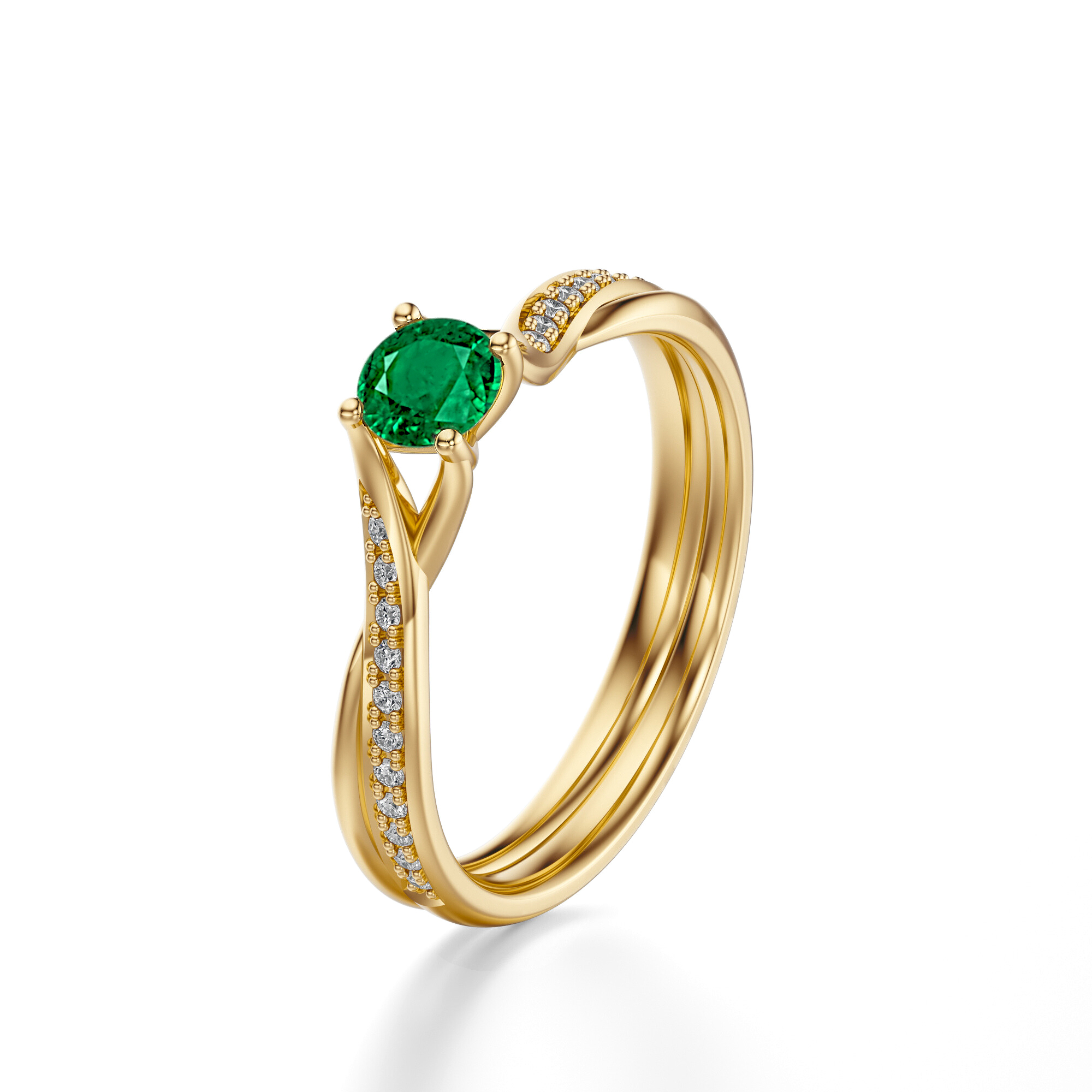 Ten niezwykły pierścionek wykonany został z żółtego złota próby 585 i wyróżnia się oryginalnym, artystycznym designem. Jego obrączka w formie delikatnie przeplatających się linii nadaje całości dynamiczny i nowoczesny charakter, zachowując przy tym ponadczasową elegancję. W centrum znajduje się szmaragd o owalnym szlifie, którego głęboka, intensywna zieleń od razu przyciąga spojrzenia. Jego blask potęgują drobne diamenty w szlifie brylantowym, zdobiące obrączkę i tworzące efekt świetlistej tafli.