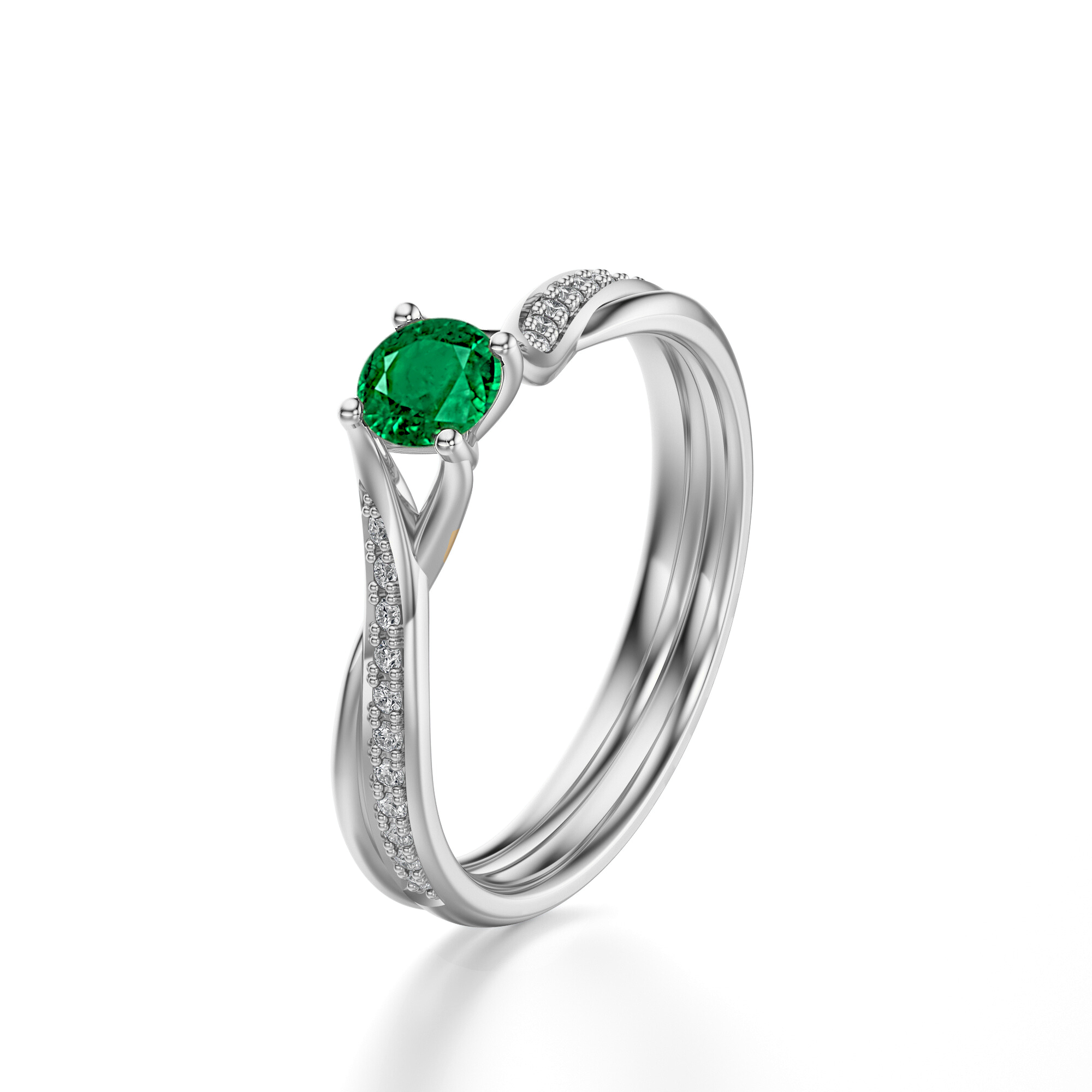 Szmaragd, osadzony w czterech łapkach, zachwyca głębią barwy i naturalnym blaskiem, a drobne brylanty wzdłuż obrączki tworzą subtelną grę światła. Połączenie chłodnego białego złota i zieleni szmaragdu z diamentowym połyskiem nadaje całości niezwykłej elegancji i luksusowego charakteru.