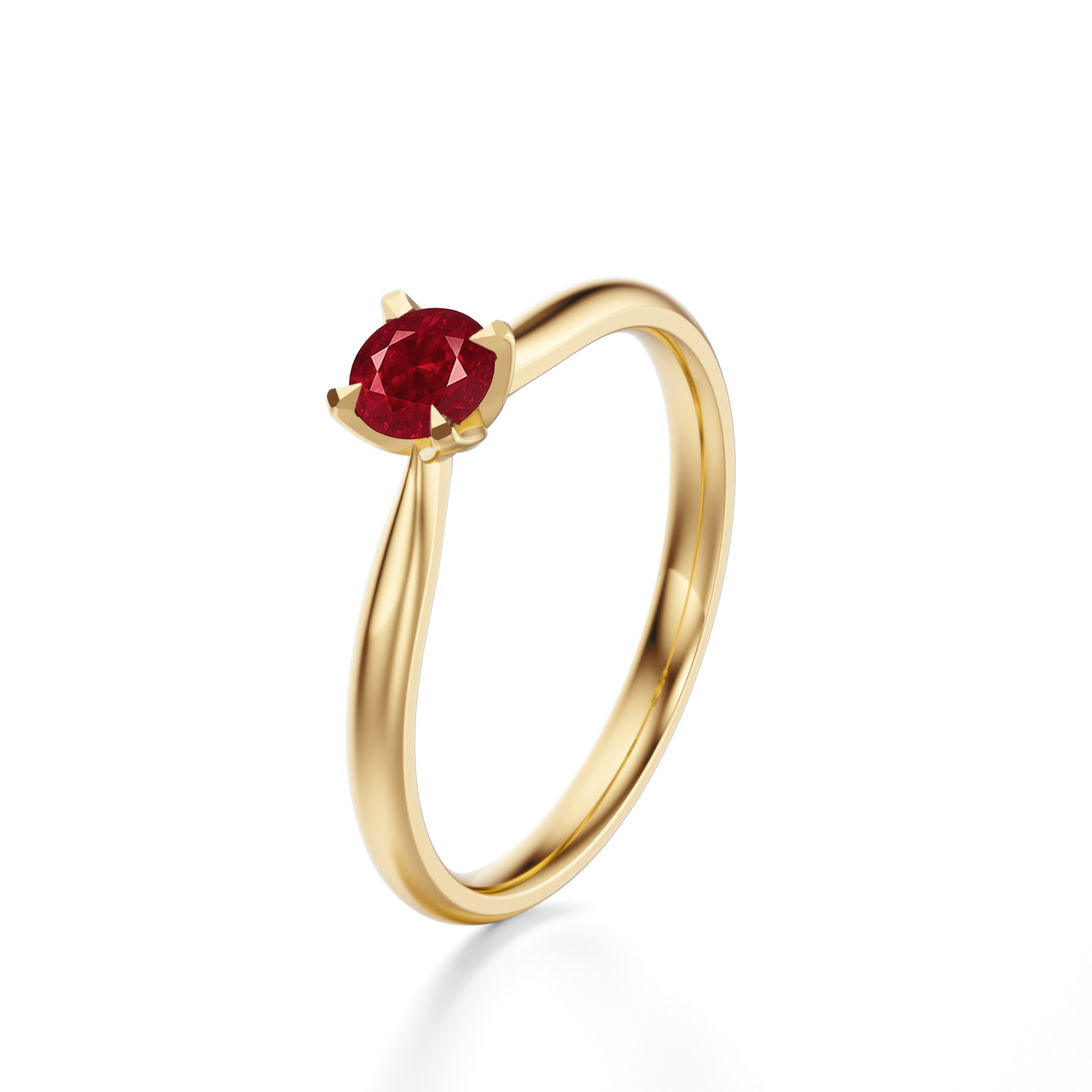 Rubin o szlifie brylantowym osadzony został w czterech łapkach, które delikatnie unoszą kamień, eksponując jego ognisty blask i intensywny kolor. Zwężająca się ku kamieniowi szyna dodaje smukłości i lekkości, jednocześnie podkreślając główny punkt kompozycji. To idealny wybór dla kobiet, które cenią dyskretny luksus i klasyczne formy biżuterii.