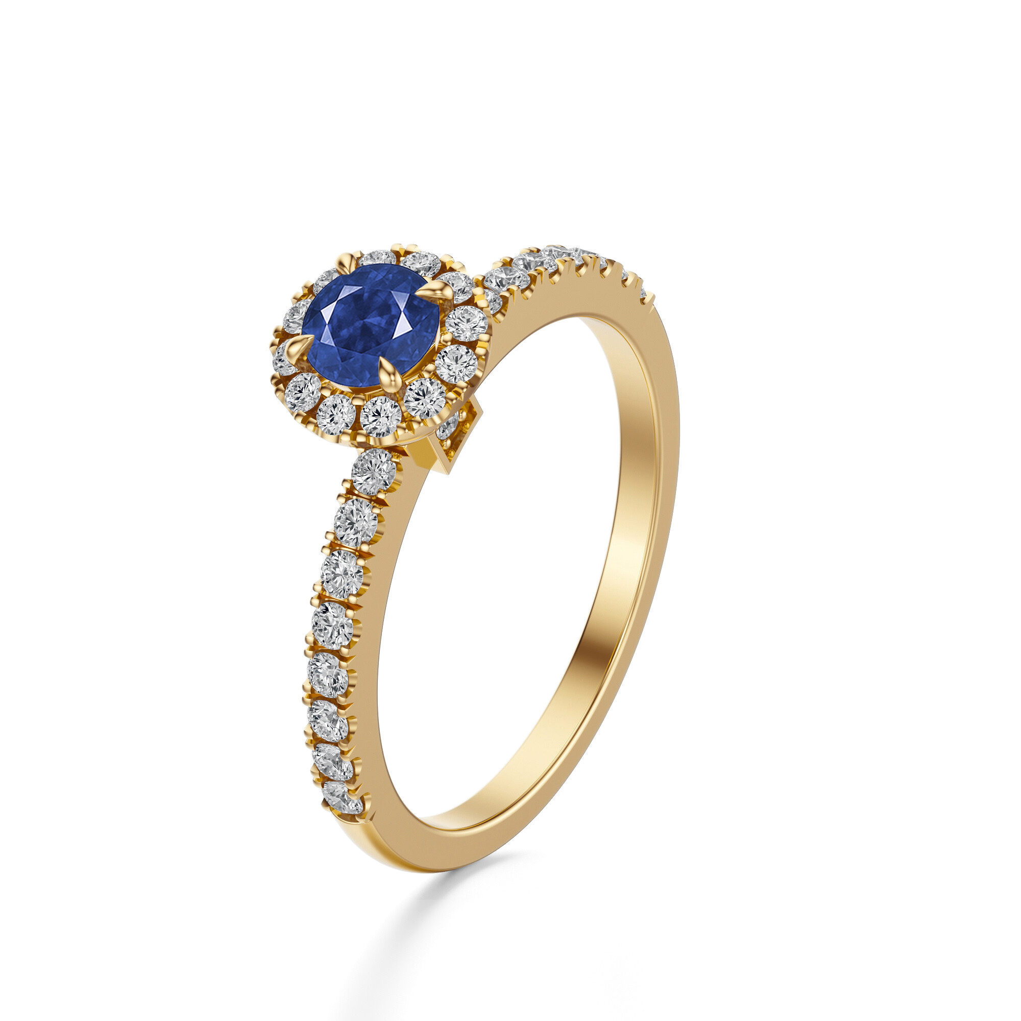 Centralny szafir o szlifie brylantowym wyróżnia się intensywną, granatową barwą, której głębia podkreślona została przez diamentową oprawę halo. Szlif brylantowy sprawia, że kamień olśniewa przy każdym ruchu dłoni, a jego barwa nabiera niezwykłej intensywności i świetlistego charakteru.