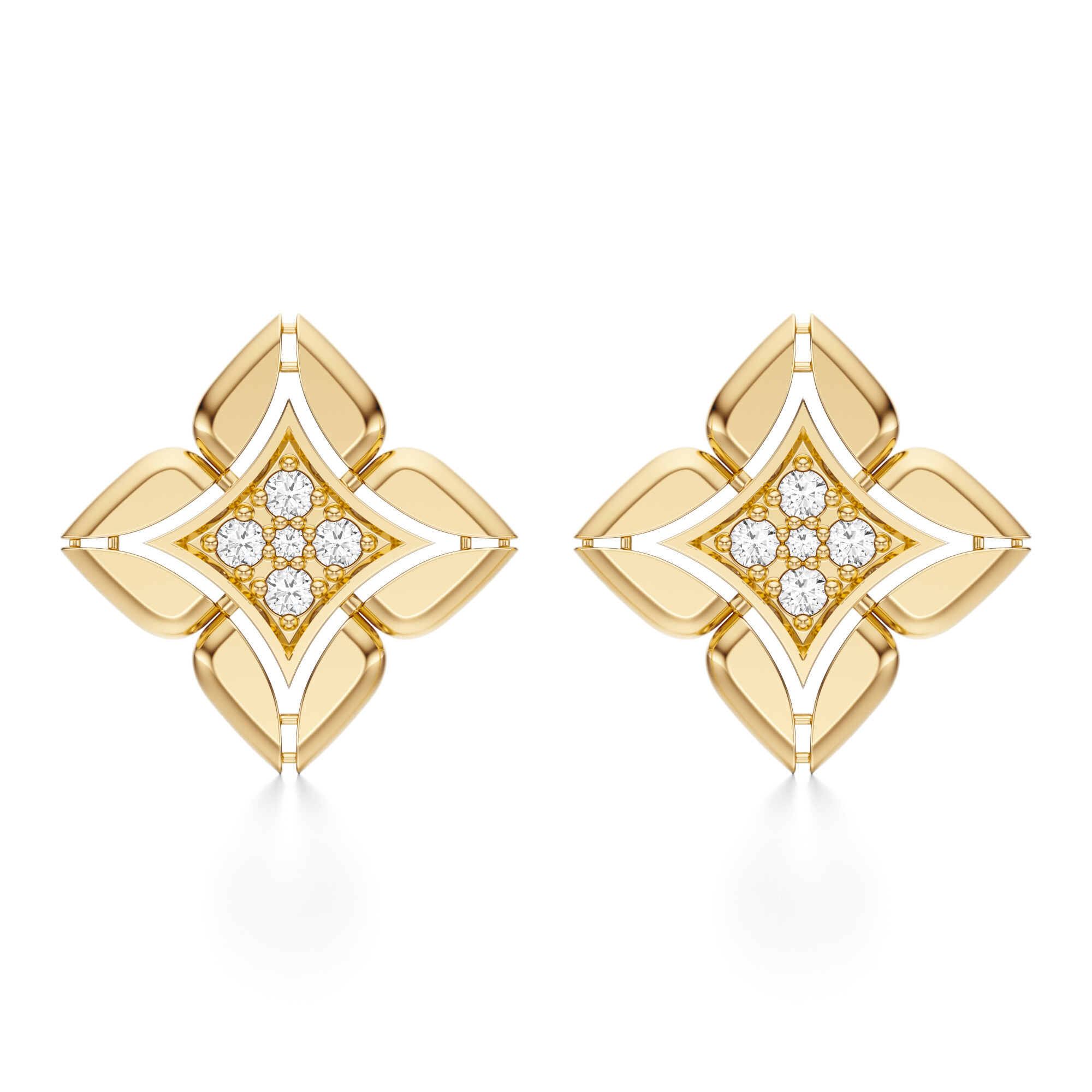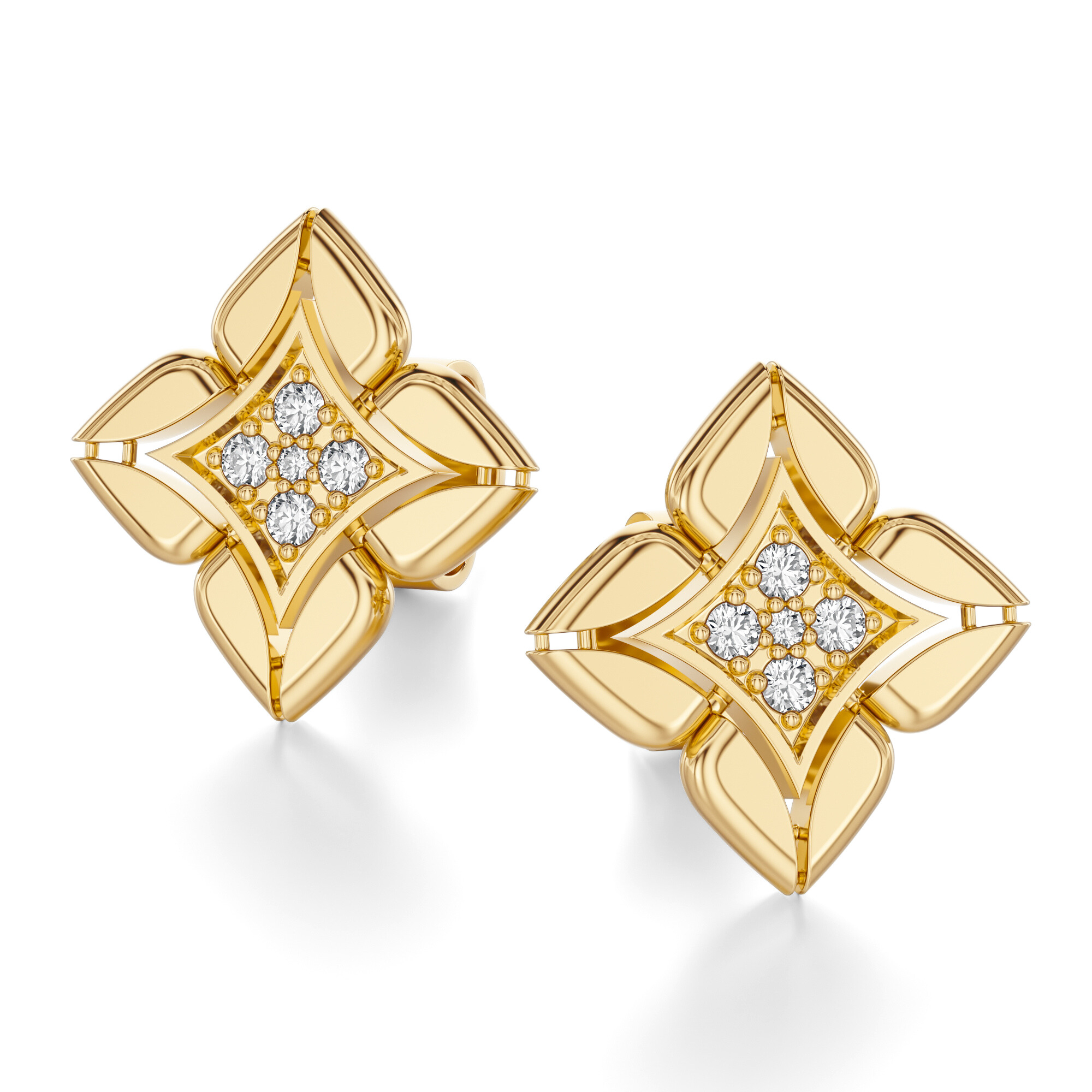 Kształt kolczyków wyróżnia się elegancją – cztery płatki o miękkich liniach tworzą spójną kompozycję, a diamenty umieszczone w centrum dodają im wyrazistego charakteru. To połączenie sprawia, że biżuteria jest zarówno subtelna, jak i efektowna, idealna na co dzień oraz na wyjątkowe okazje.
