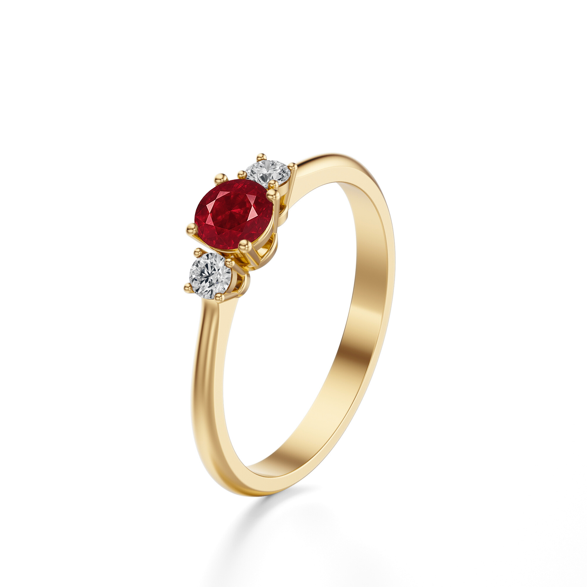 Rubin w szlifie brylantowym zachwyca wielowymiarową grą światła – jego fasety wydobywają z kamienia ognisty blask i podkreślają intensywną czerwień. Dwa towarzyszące mu diamenty nie tylko dodają pierścionkowi olśnienia, ale także wzmacniają wrażenie luksusu i subtelnej elegancji.