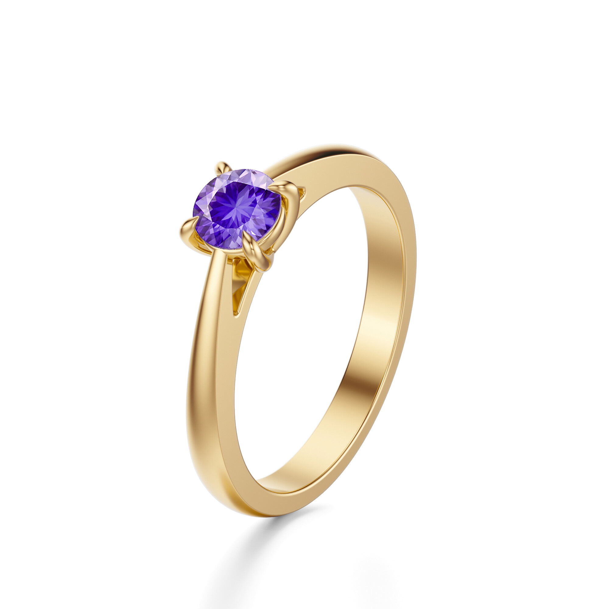 Pierścionek z tanzanitem w klasycznej czteroramiennej oprawie z żółtego złota