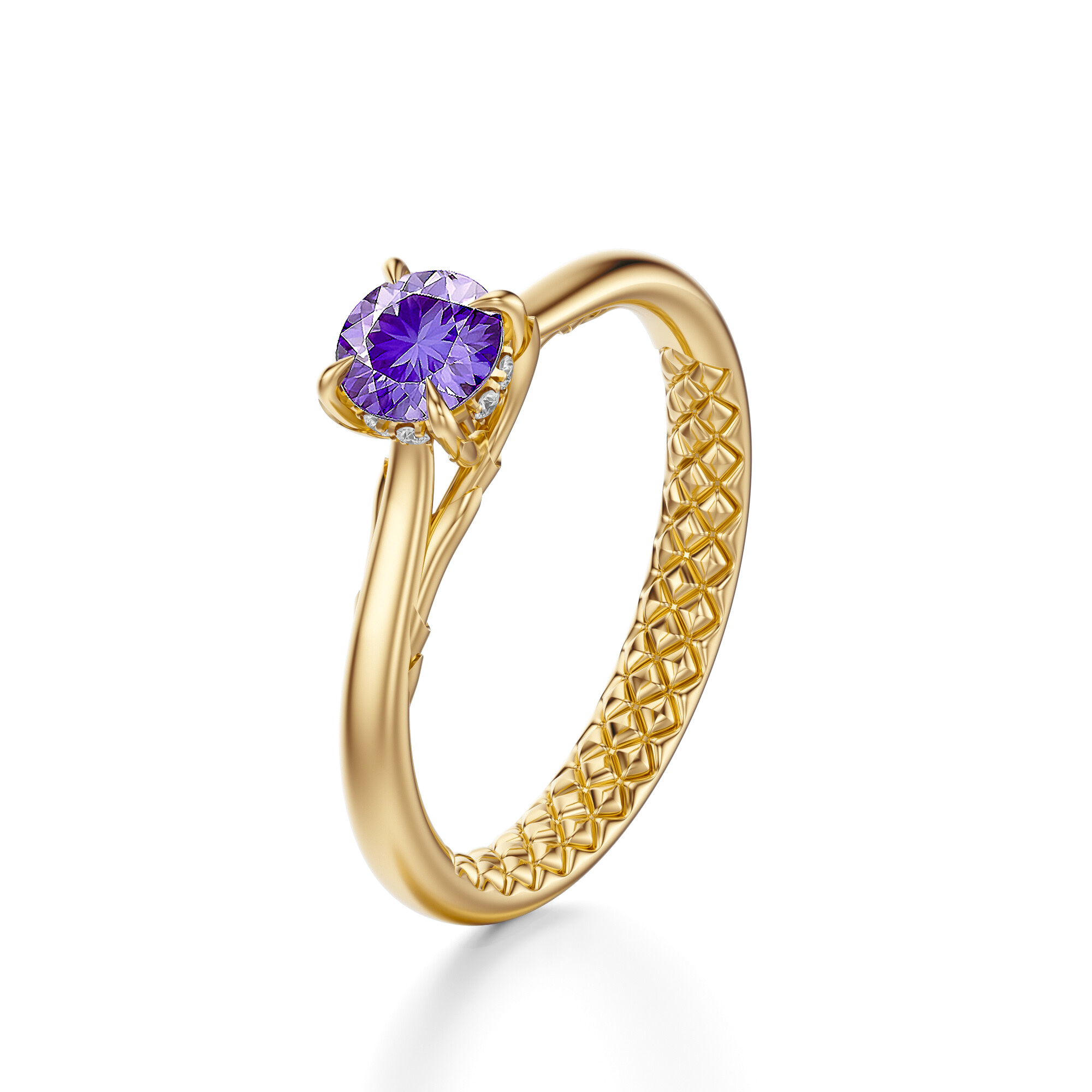 Hipnotyzujący i pełen magii – ten wyjątkowy pierścień zachwyca połączeniem głębokiej barwy tanzanitu z ciepłym blaskiem żółtego złota. Centralny kamień w szlifie brylantowym emanuje niezwykłą świetlistością, a jego fioletowo-niebieski odcień wspaniale kontrastuje z bogato zdobioną obrączką. To biżuteria, która łączy w sobie elegancję i oryginalność, tworząc ponadczasowy symbol uczuć i wyjątkowych chwil.